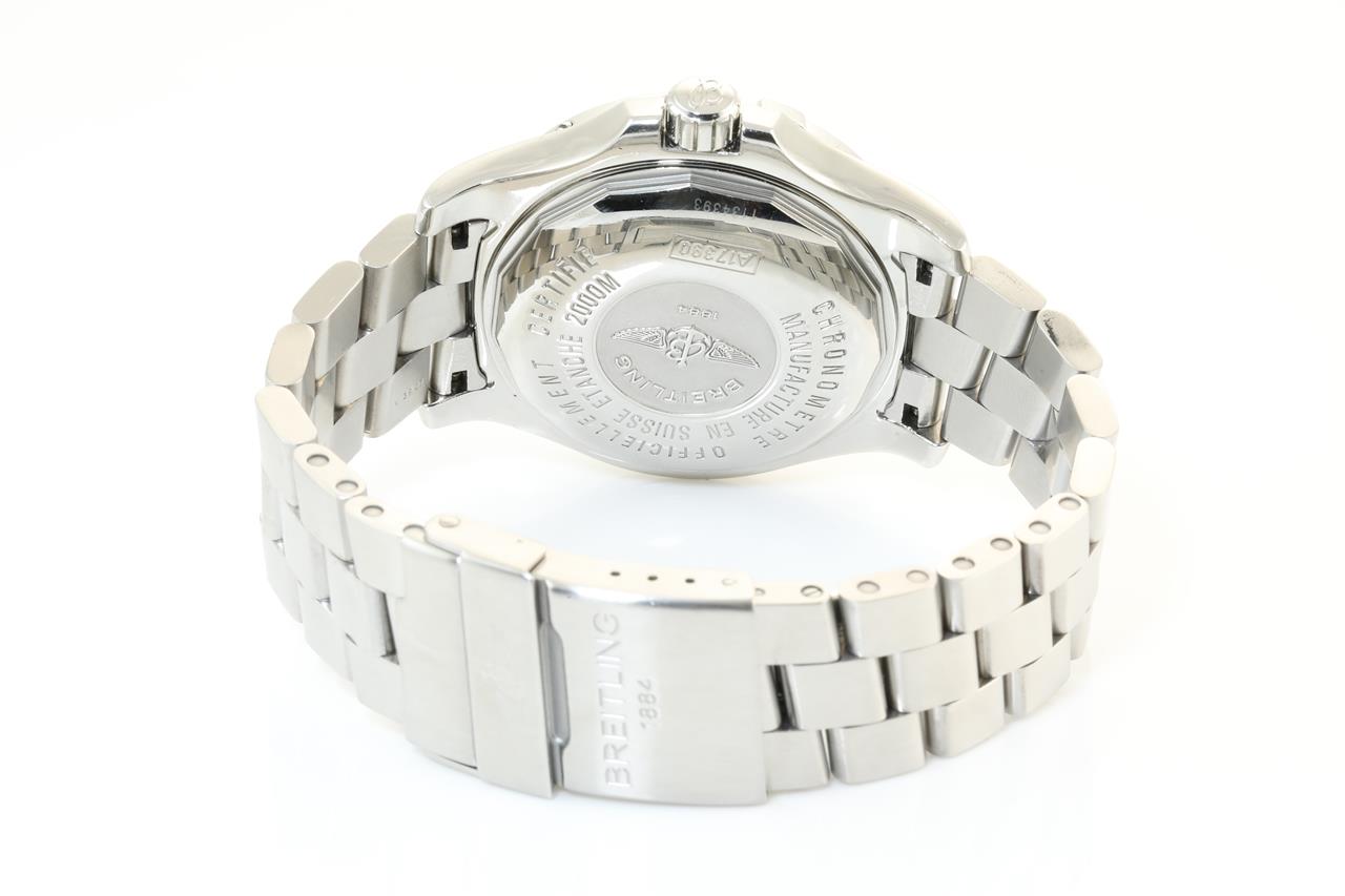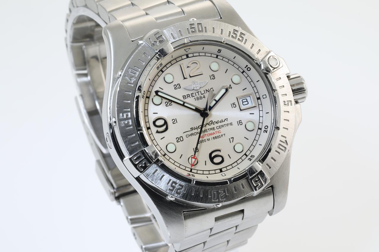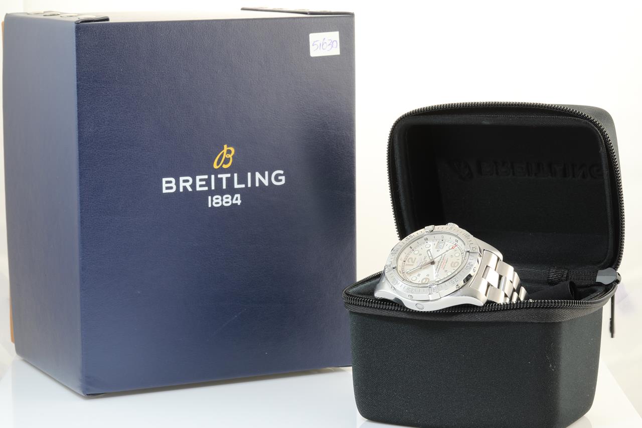 Breitling Superocean Steelfish stainless steel automatic mens watch. Silver dial, date, case diameter: 44mm, wrist size: 19cm, Swiss made. Ref# A17390. With Breitling stainless steel bracelet and clasp. With certificate of authenticity and Breitling Box. 3 month FSA warranty. (Pre-owned)