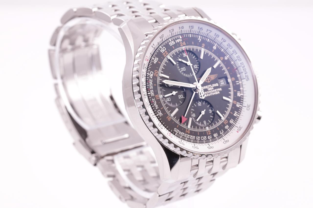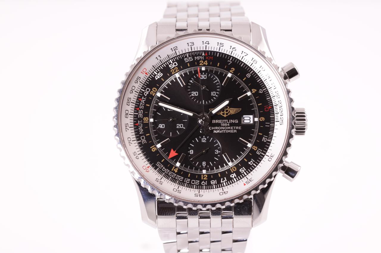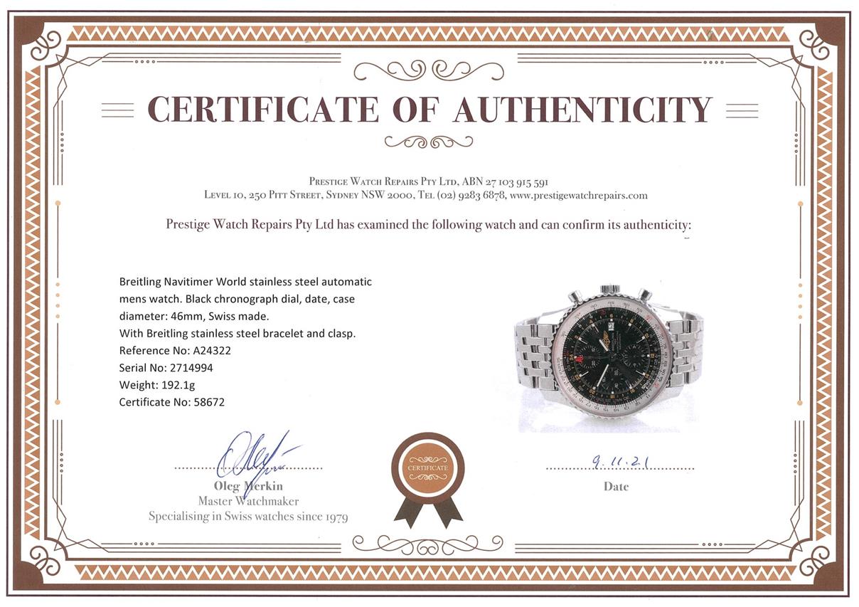 Breitling Navitimer World stainless steel automatic mens watch. Black chronograph dial, date, case diameter: 46mm, wrist size: 19.5cm, Swiss made. Ref# A24322. With Breitling stainless steel bracelet and clasp. With Certificate of Authenticity, Breitling International e-warranty card dated 16/03/2014 and Breitling box. 3 month FSA warranty. (Pre-owned)