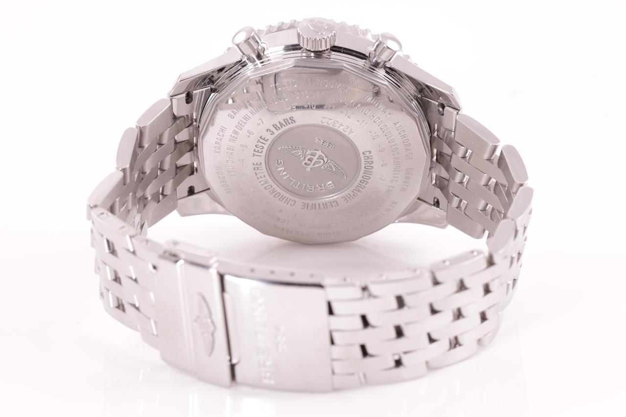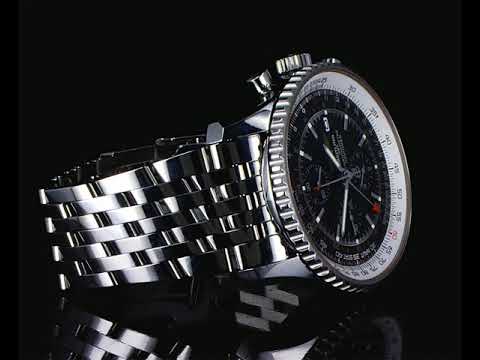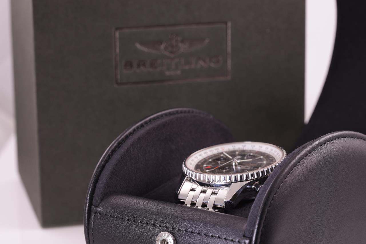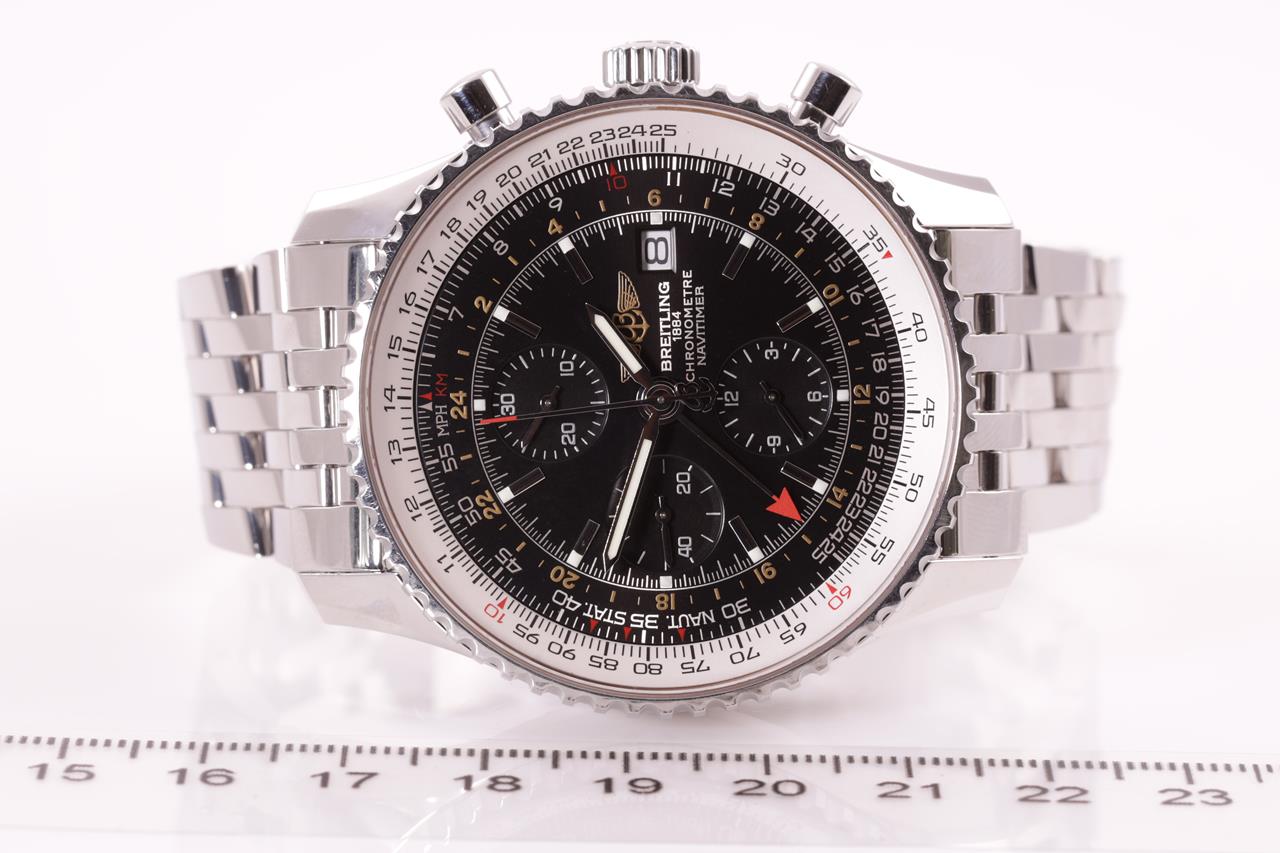 Breitling Navitimer World stainless steel automatic mens watch. Black chronograph dial, date, case diameter: 46mm, wrist size: 19.5cm, Swiss made. Ref# A24322. With Breitling stainless steel bracelet and clasp. With Certificate of Authenticity, Breitling International e-warranty card dated 16/03/2014 and Breitling box. 3 month FSA warranty. (Pre-owned)