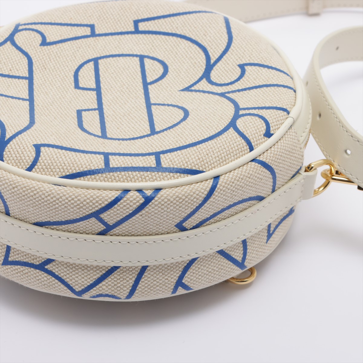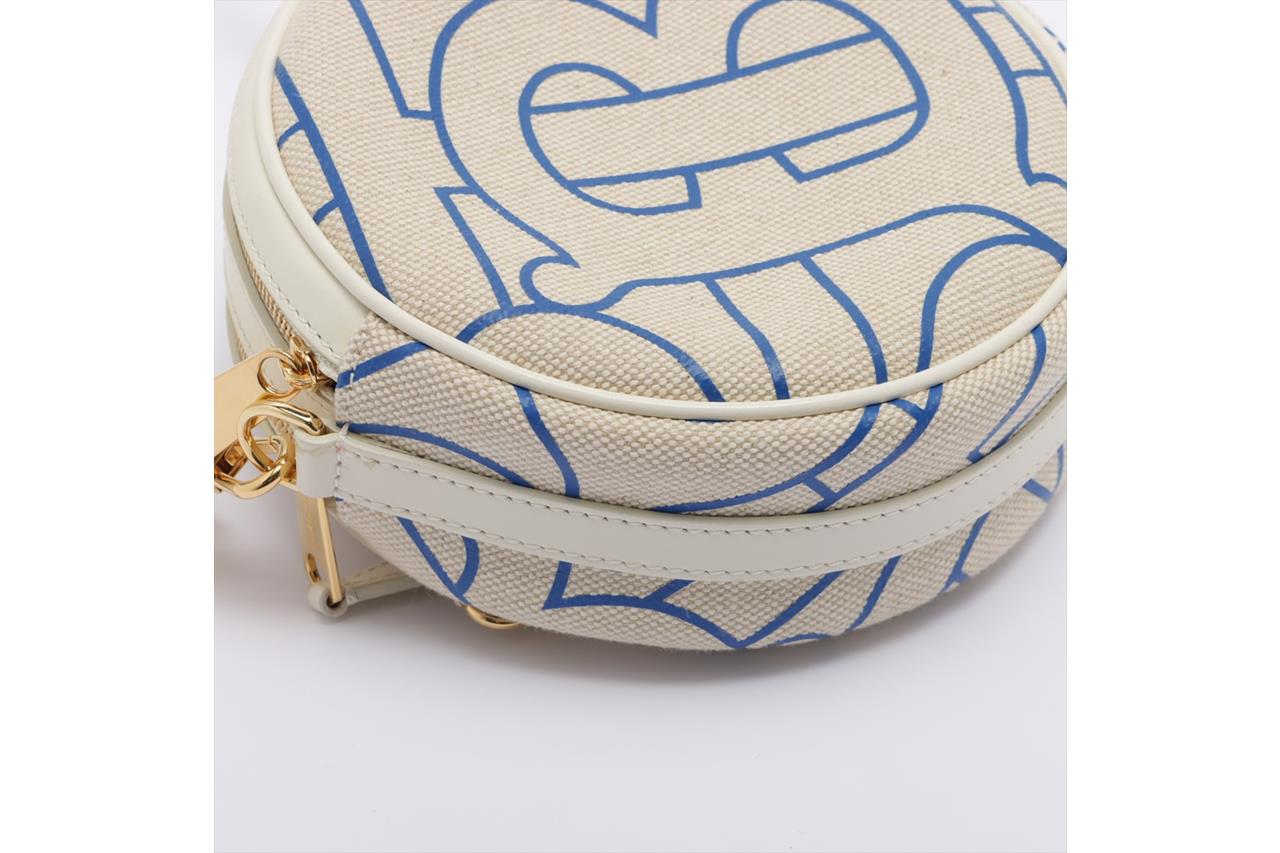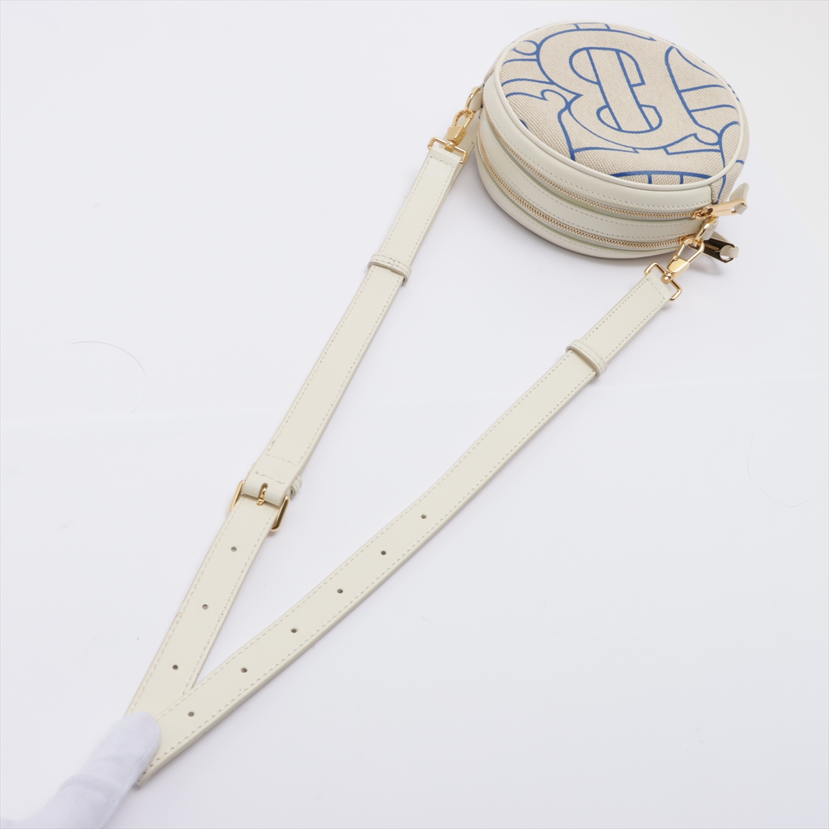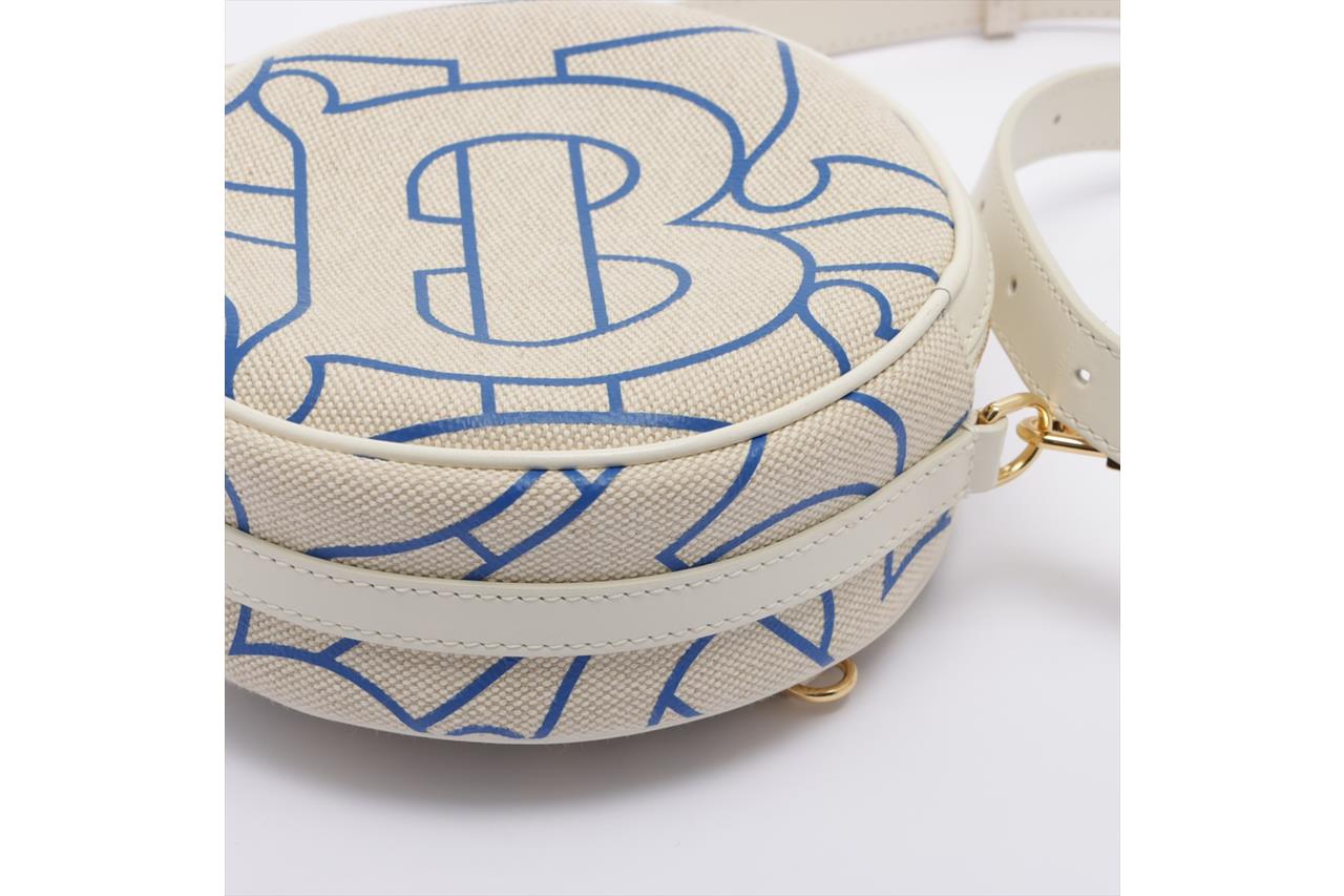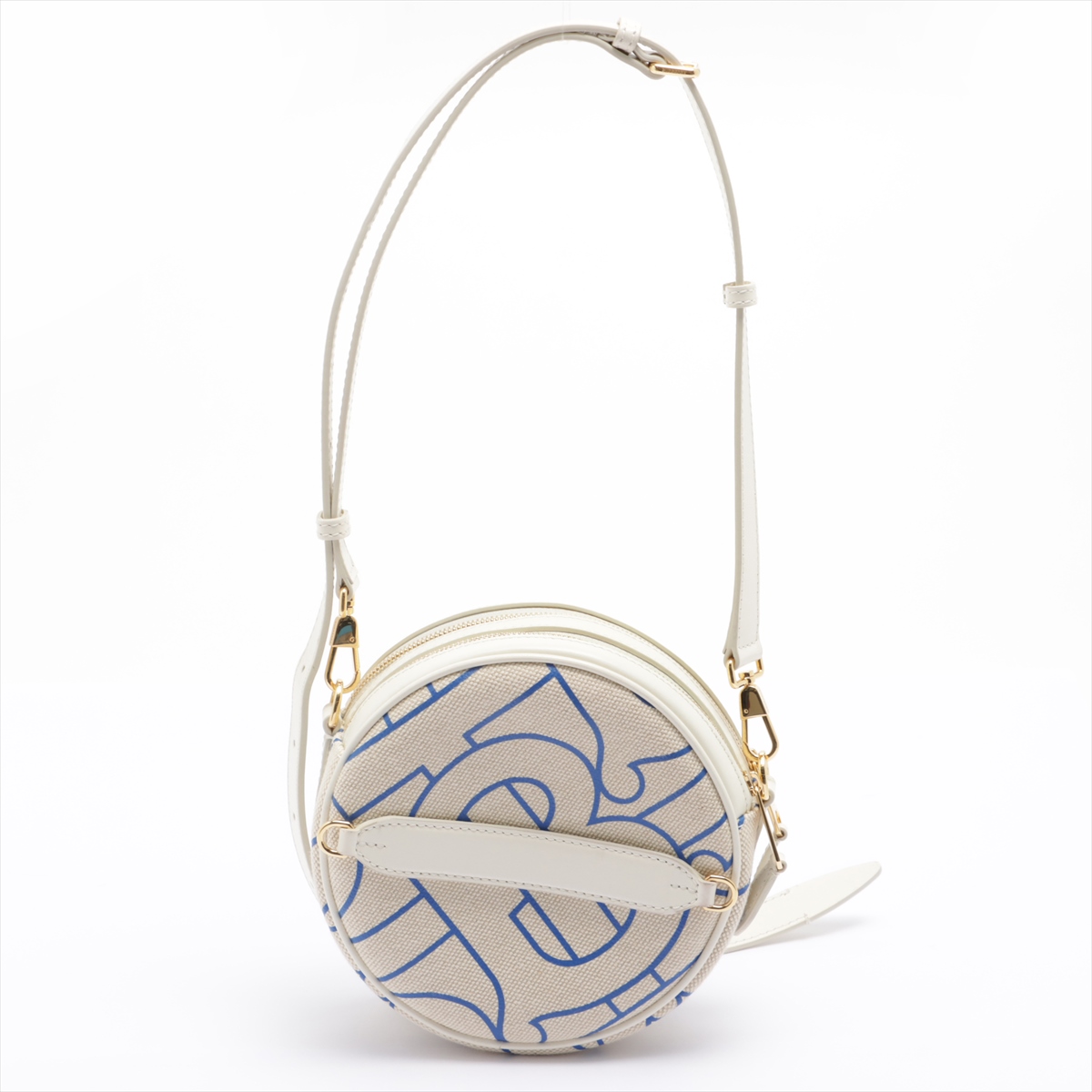 Burberry Monogram Motif Canvas and Leather Louise Bag in Natural and Blue. Gold-tone hardware. Featuring two interior card slots, two interior compartments and a zip closure. Approximate dimensions: 17cm (L) x 17cm (H) x 7cm (D) with shoulder strap drop of 25cm minimum and 55cm maximum. Made in Italy. Accompanied by Burberry dust bag and papers. With Entrupy Certificate of Authenticity. (Pre-owned)