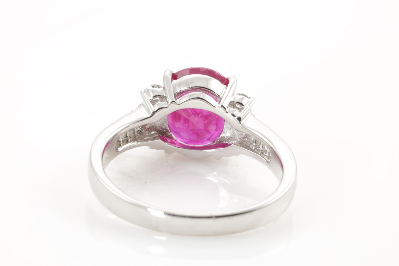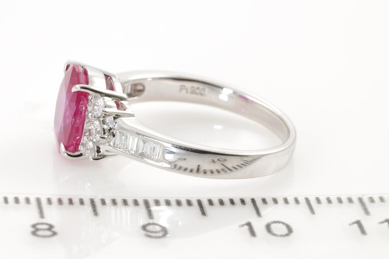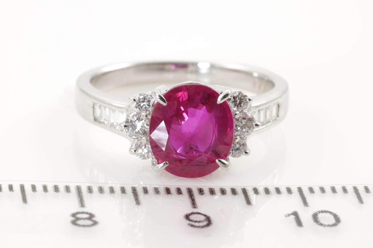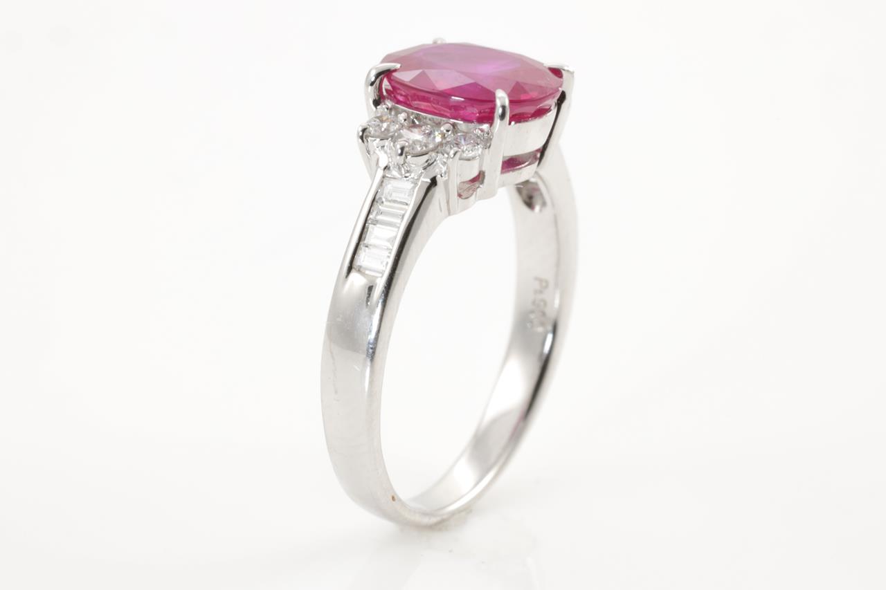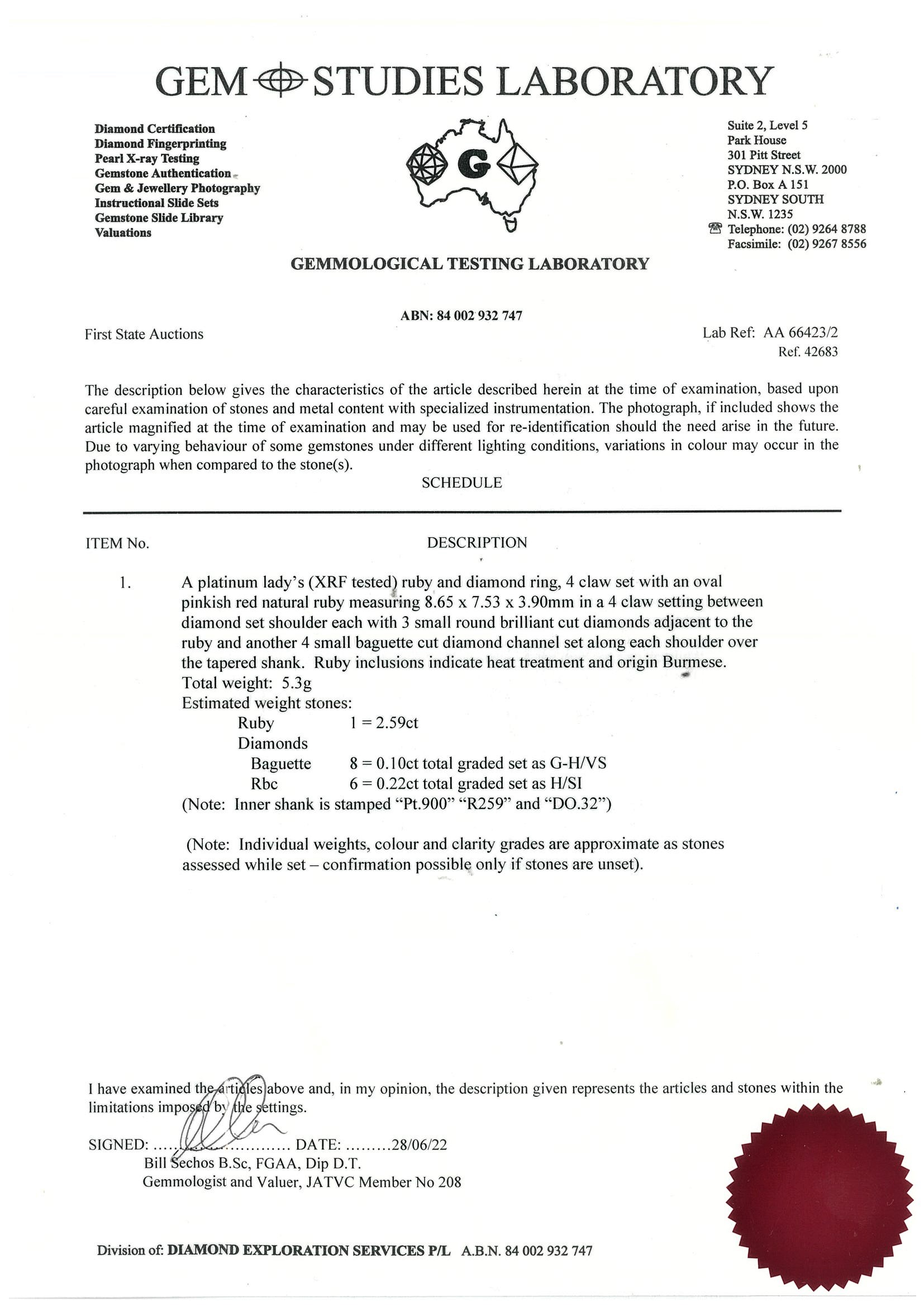 Ruby and Diamond ring with an oval shape Burmese Ruby of 2.59ct and round & baguette cut Diamonds totalling 0.32cts (Estimated grading: G-H VS-SI ). Platinum. Ring size M. With GSL Certificate #AA 66423/2. (Pre-owned)