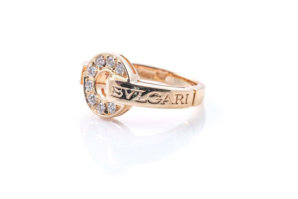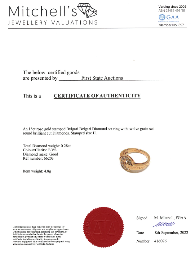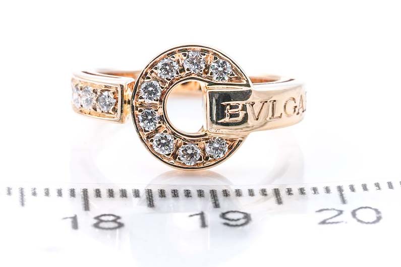 Bvlgari Bvlgari Diamond ring with 12 round Diamonds totalling 0.28cts. 18ct rose gold. Ring size H - ring resizing is not recommended. Made in Italy. Weight: 4.8g. With Bvlgari box. With Certificate #416076. (Pre-owned)