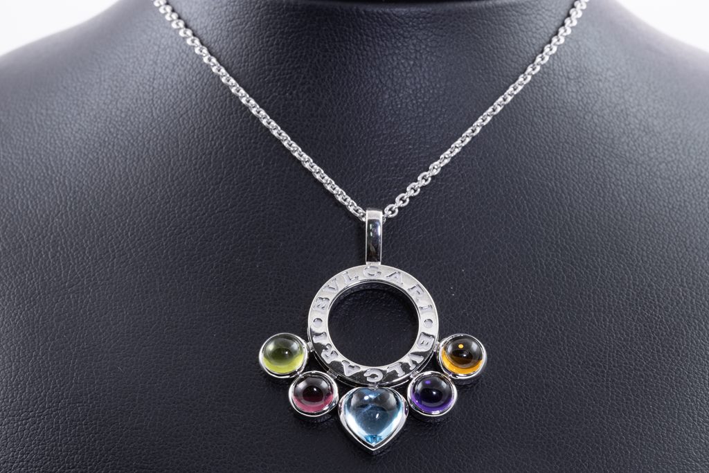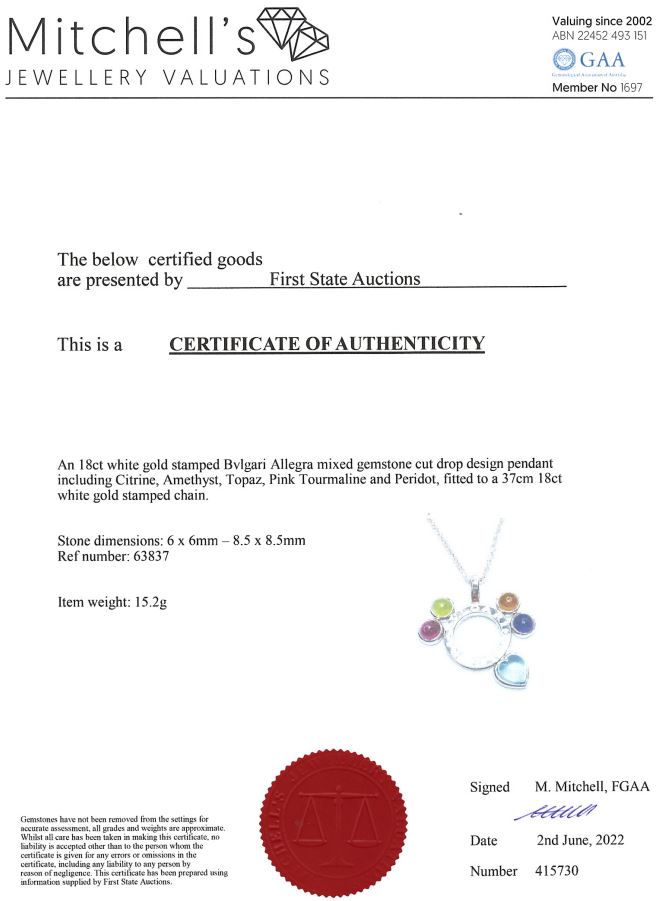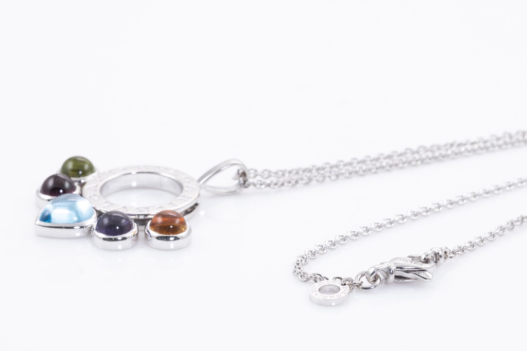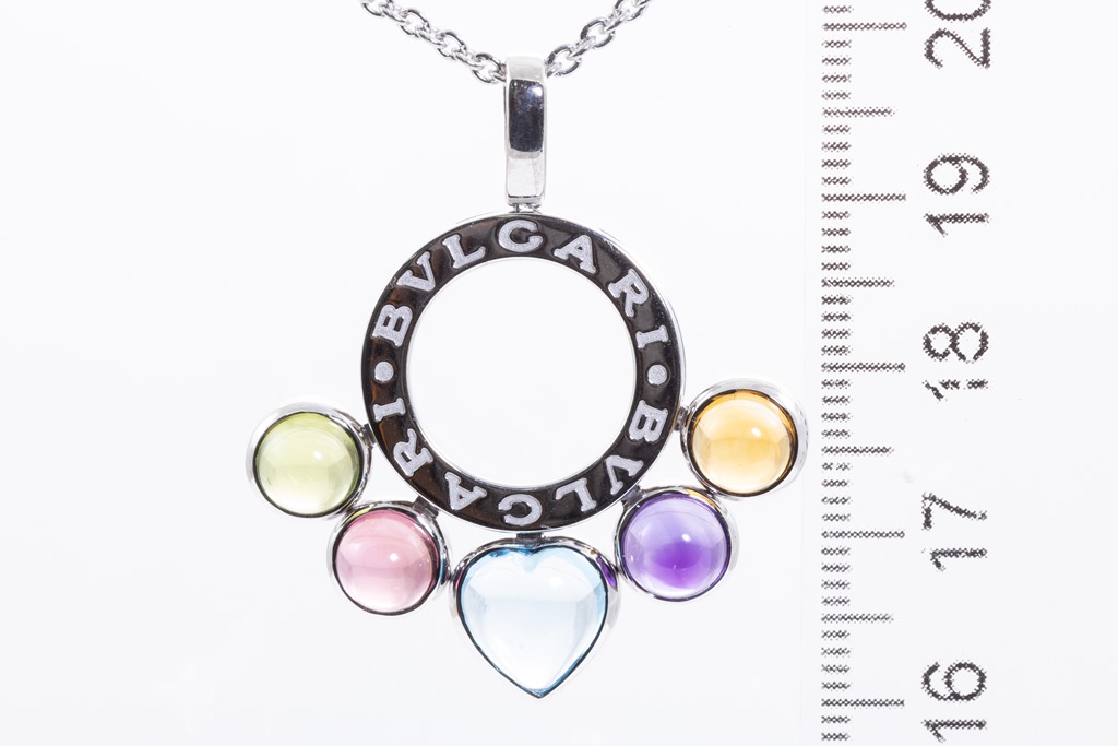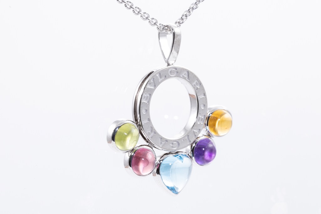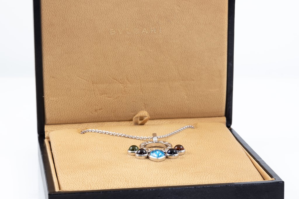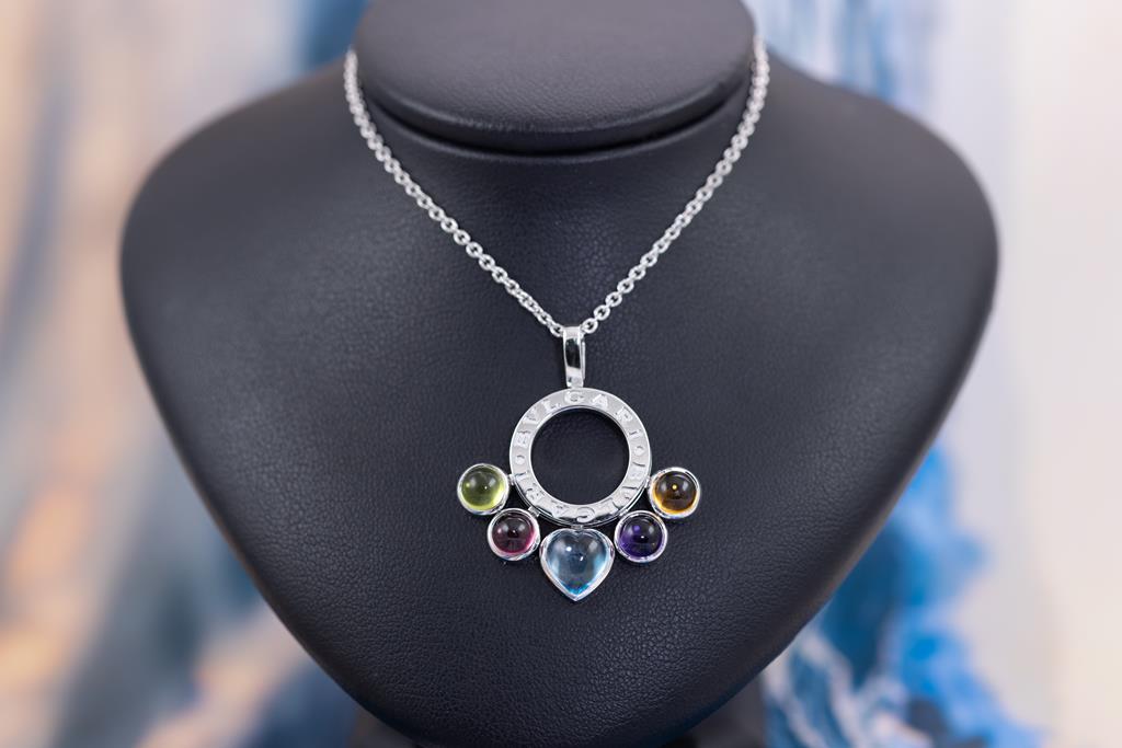 Bvlgari Allegra mixed gemstone pendant with cabochon cut Citrine, Amethyst, Topaz, pink Tourmaline & Peridot. 18ct white gold with 18ct white gold 37cm chain. Made in Italy. Weight: 15.2g. With Bvlgari box. With certificate #415730. (Pre-owned)