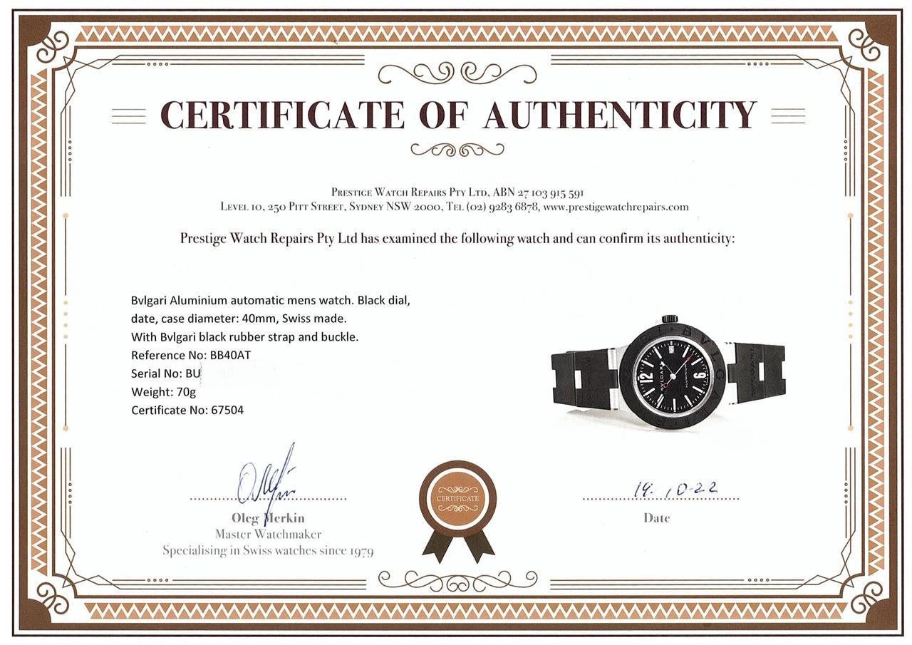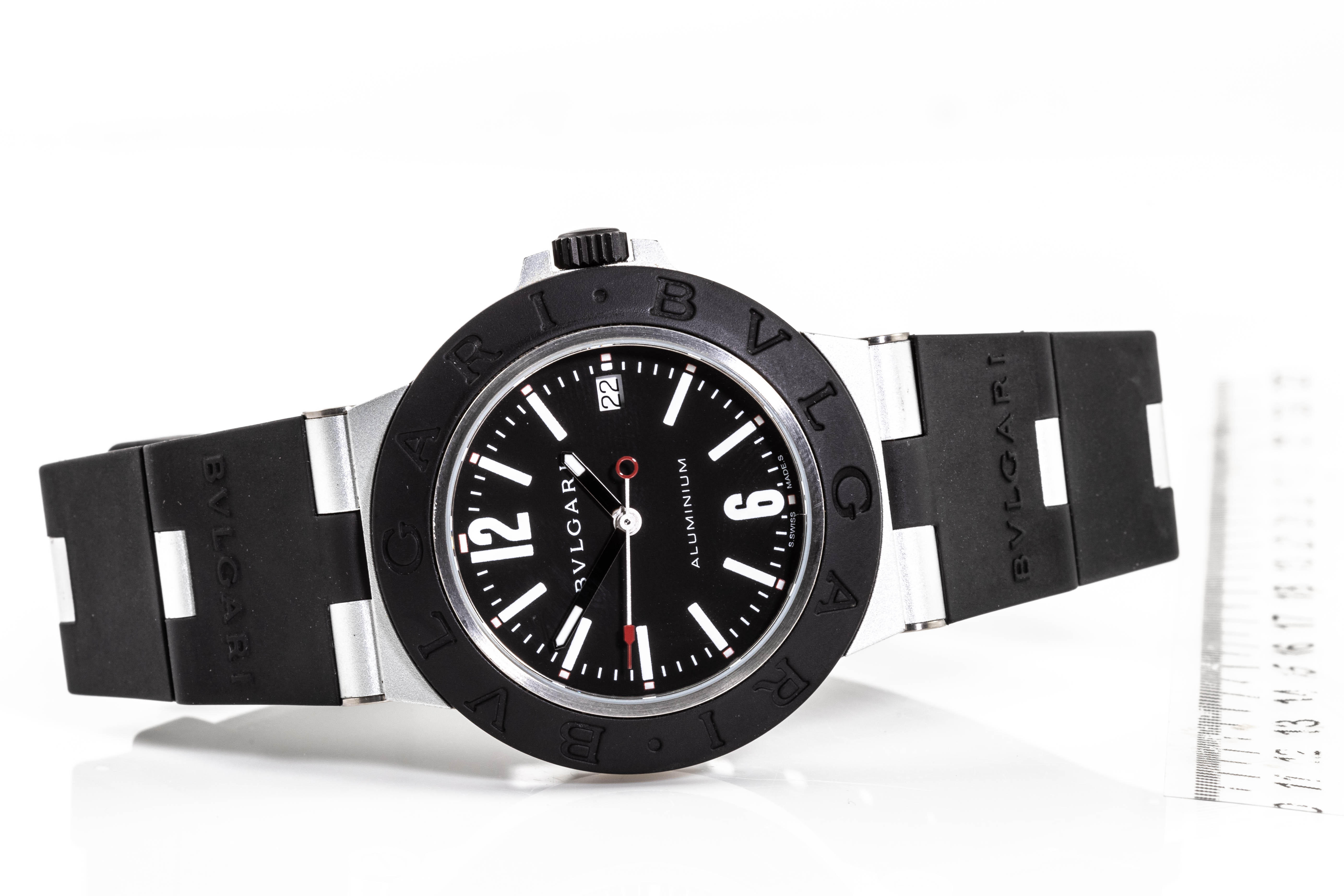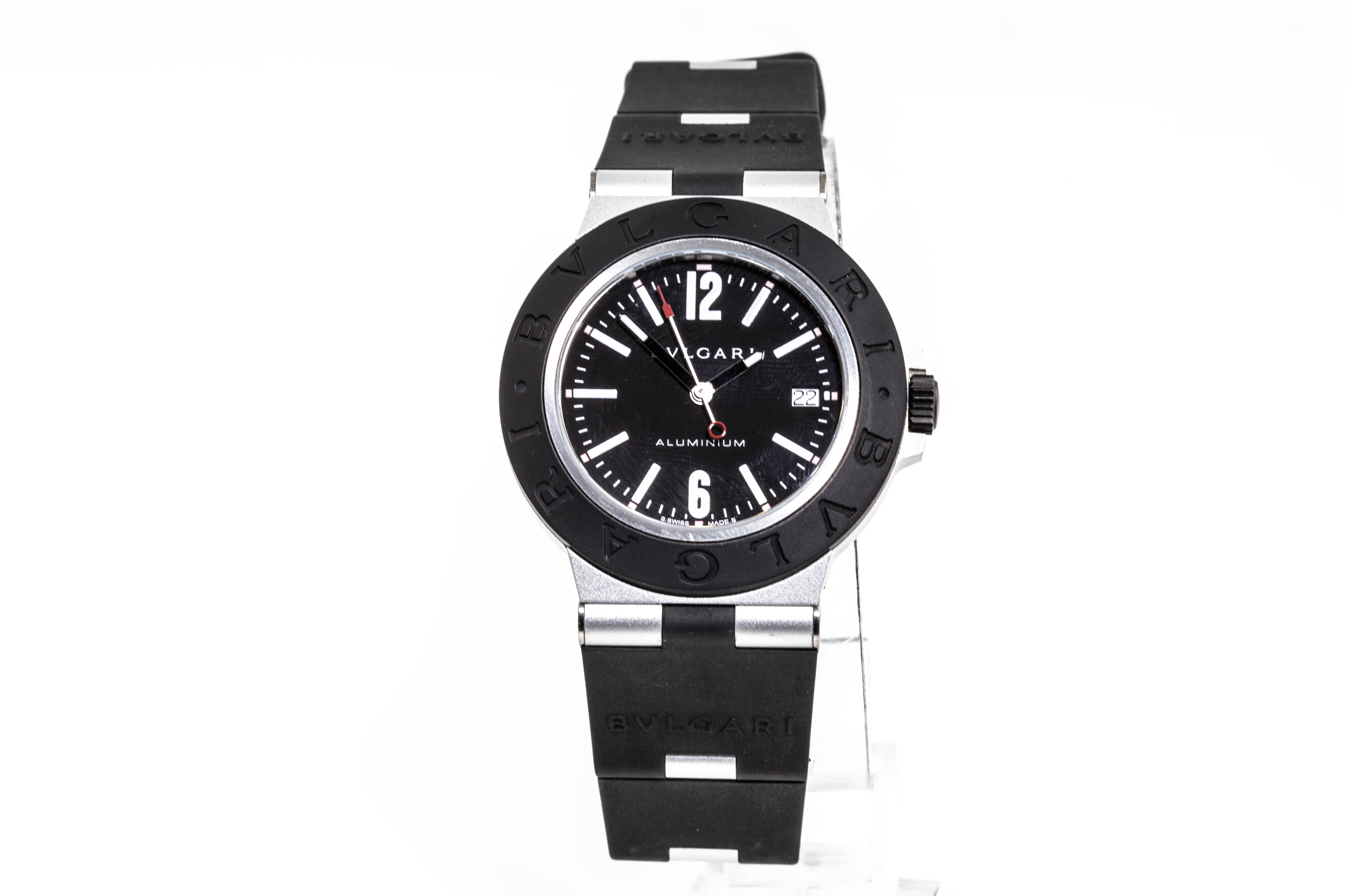 Bvlgari Aluminum automatic mens watch. Black dial, date, case diameter: 40mm, strap length: 222cm, Swiss made. Ref# BB40AT. With Bvlgari black rubber strap and buckle. With Certificate of Authenticity, Bvlgari International Warranty card dated 10/01/2022 and Bvlgari case. 3 month FSA warranty. (Pre-owned)