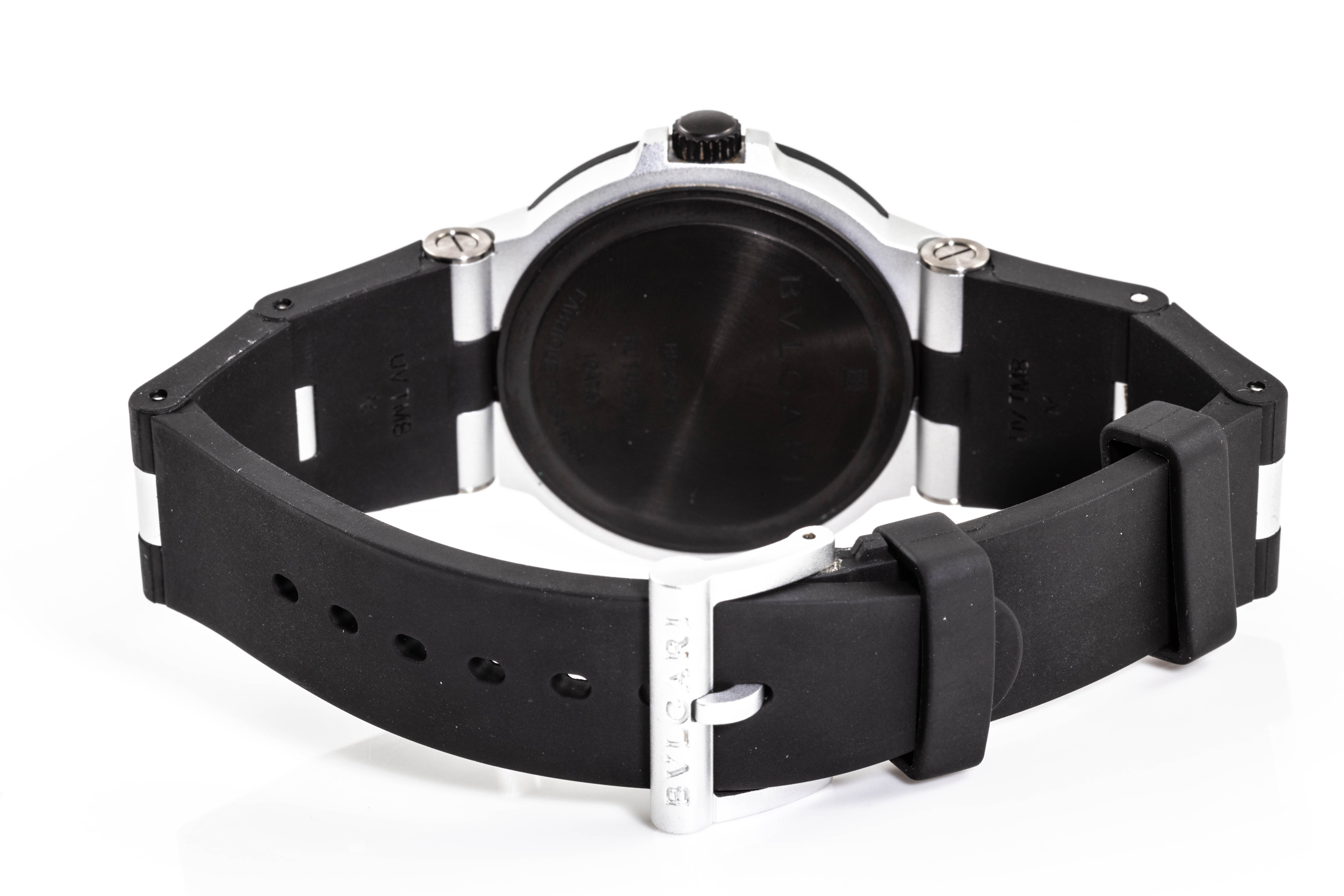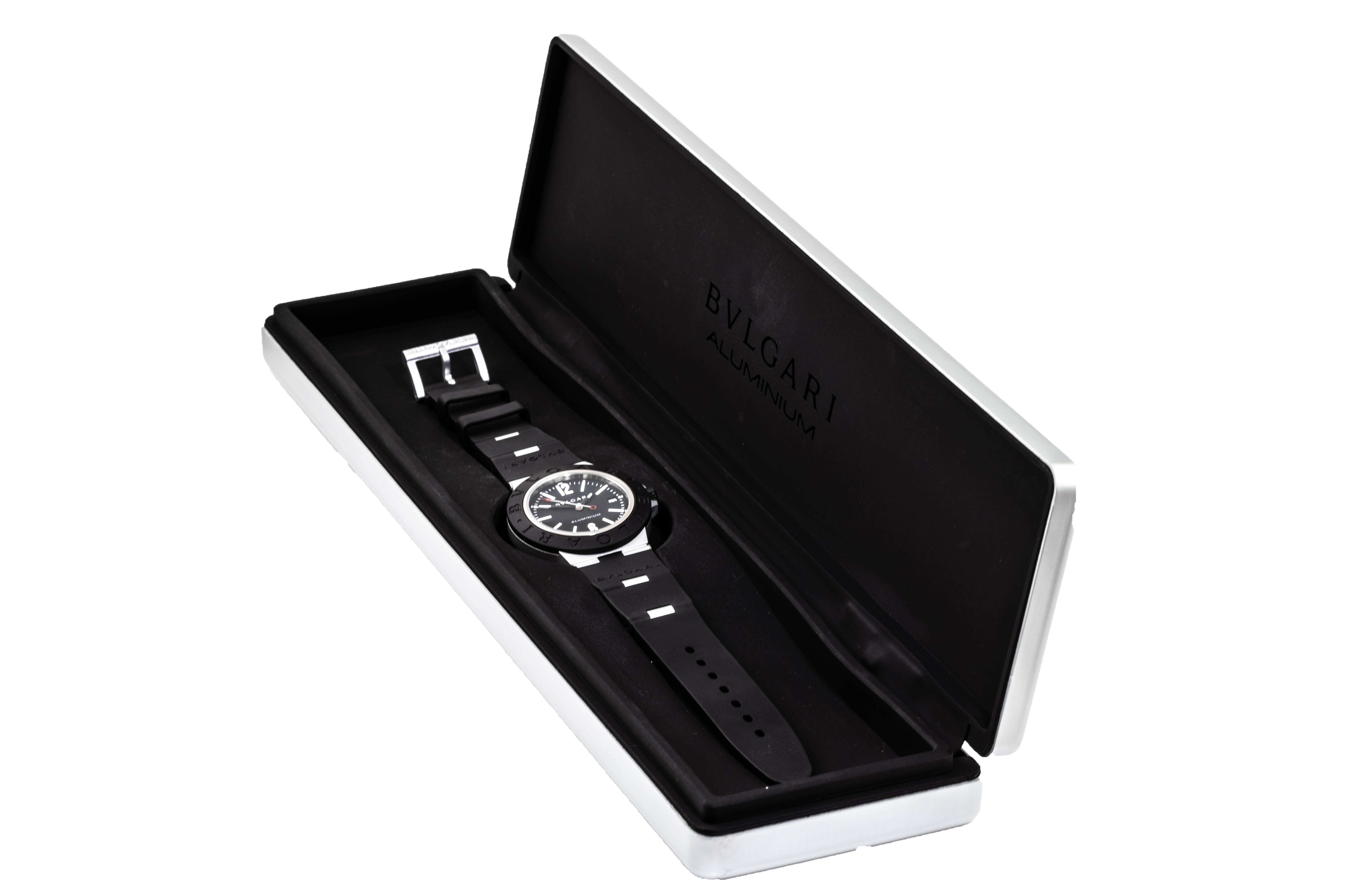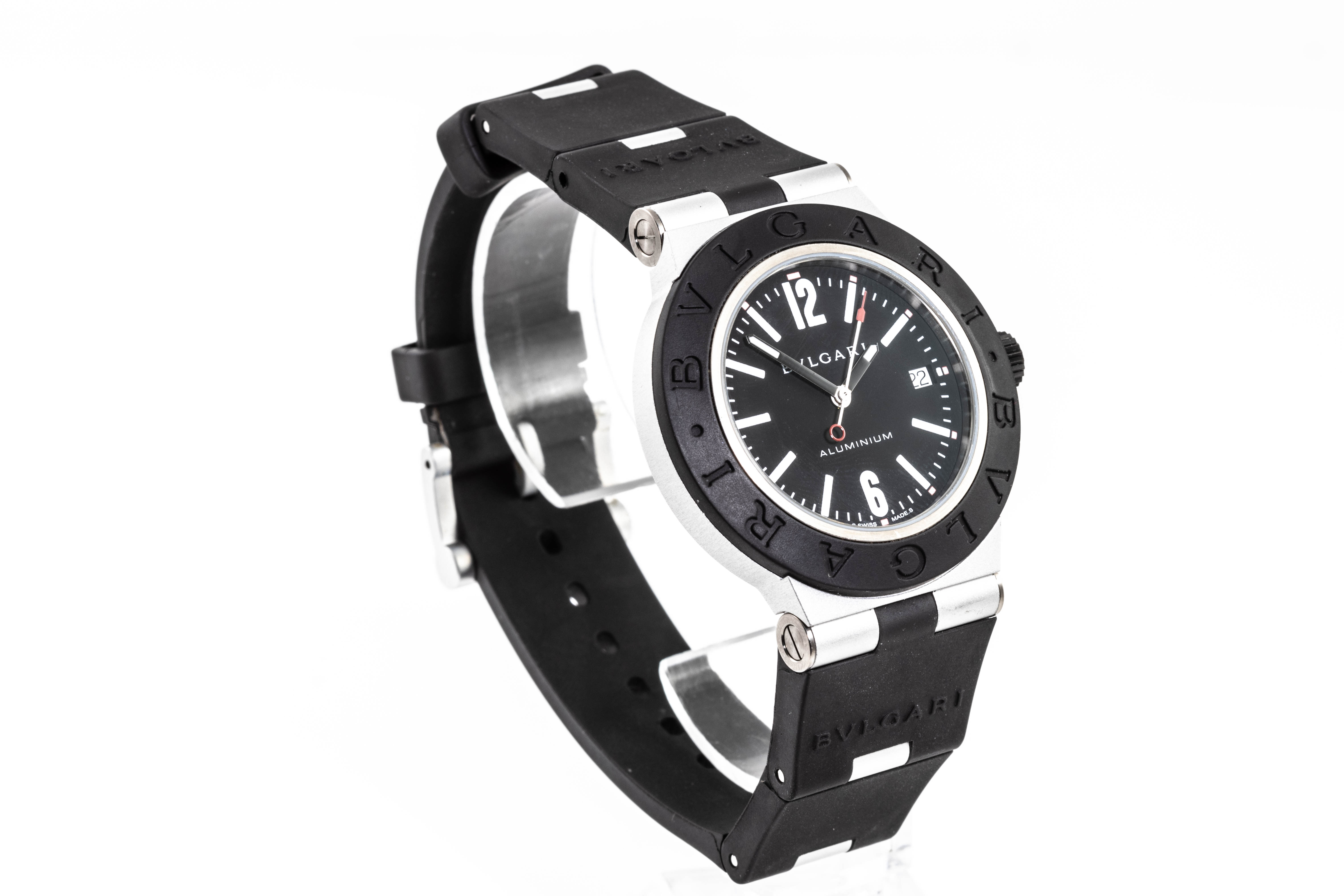 Bvlgari Aluminum automatic mens watch. Black dial, date, case diameter: 40mm, strap length: 222cm, Swiss made. Ref# BB40AT. With Bvlgari black rubber strap and buckle. With Certificate of Authenticity, Bvlgari International Warranty card dated 10/01/2022 and Bvlgari case. 3 month FSA warranty. (Pre-owned)