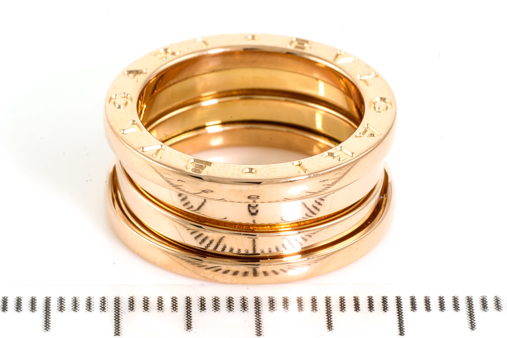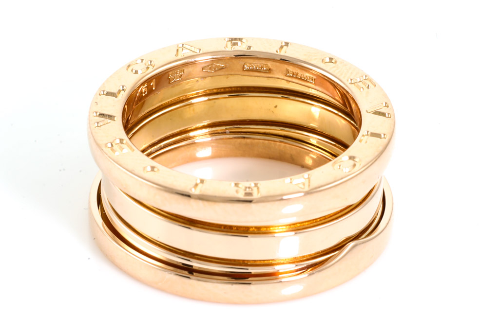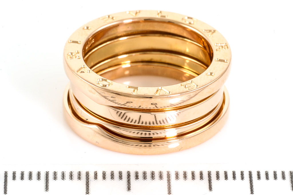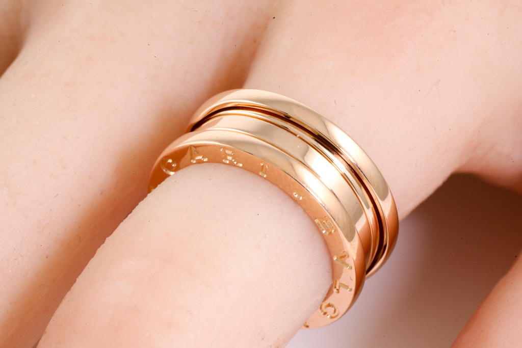 Bvlgari B. Zero1 three-band ring. 18ct rose gold. Bvlgari stamped size 51, K - ring resizing is not recommended. Made in Italy. Weight: 9.1g. (Pre-owned)