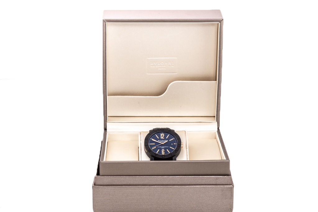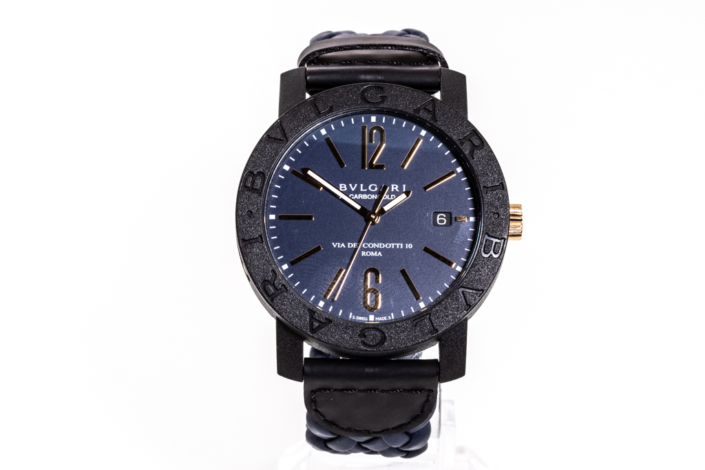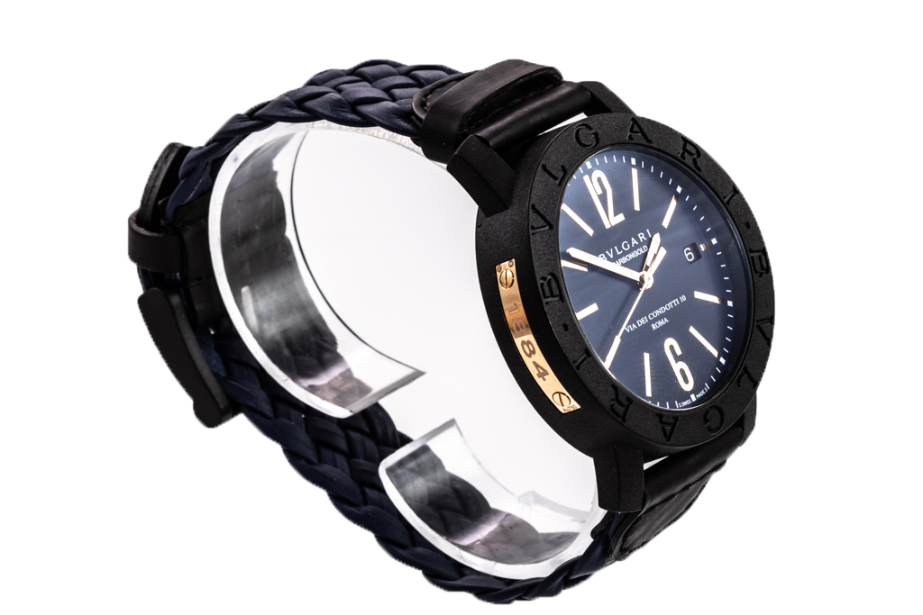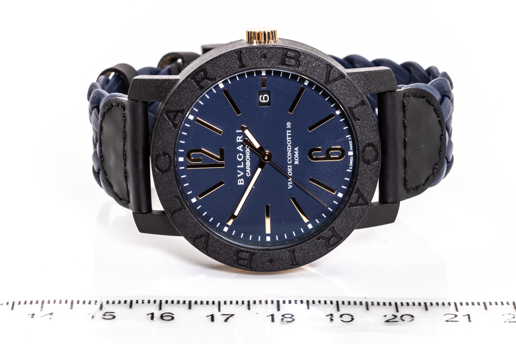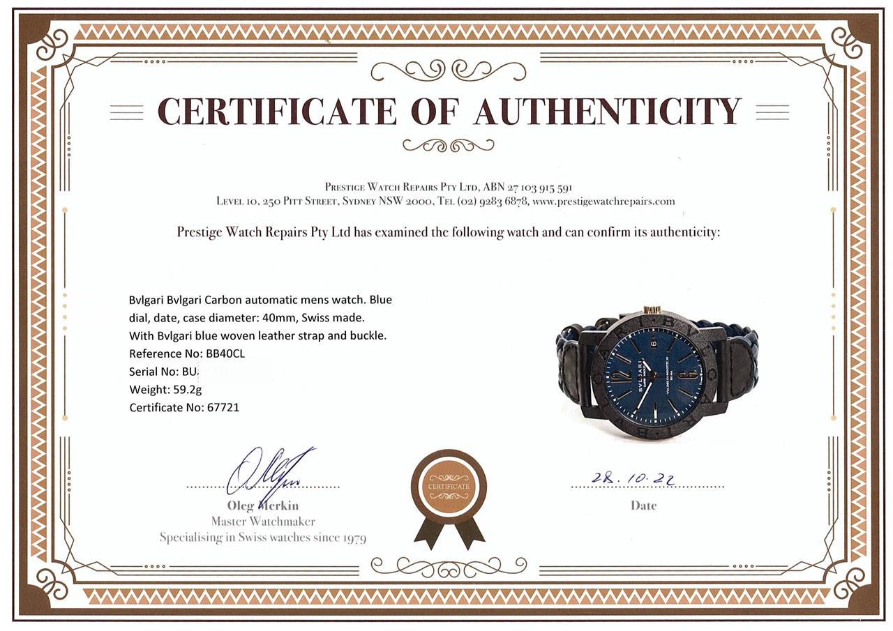 Bvlgari Bvlgari Carbon gold carbon fiber automatic mens watch. Blue dial, date, case diameter: 40mm, strap length: 20cm, Swiss made. Ref# BBP40C3CGLD. With Bvlgari blue woven leather strap and buckle. With Certificate of Authenticity, Bvlgari International warranty card and Bvlgari box. (Pre-owned)
