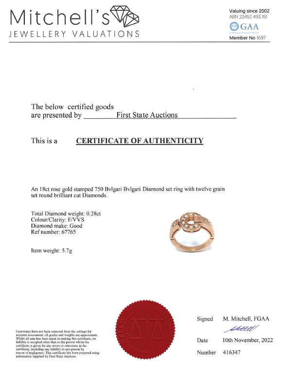 Bvlgari Bvlgari Diamond ring with 12 round Diamonds totalling 0.28cts. 18ct rose gold. Ring size J - ring resizing is not recommended. Made in Italy. Weight: 5.7g. With Bvlgari box. With Certificate #416347. (Pre-owned)
