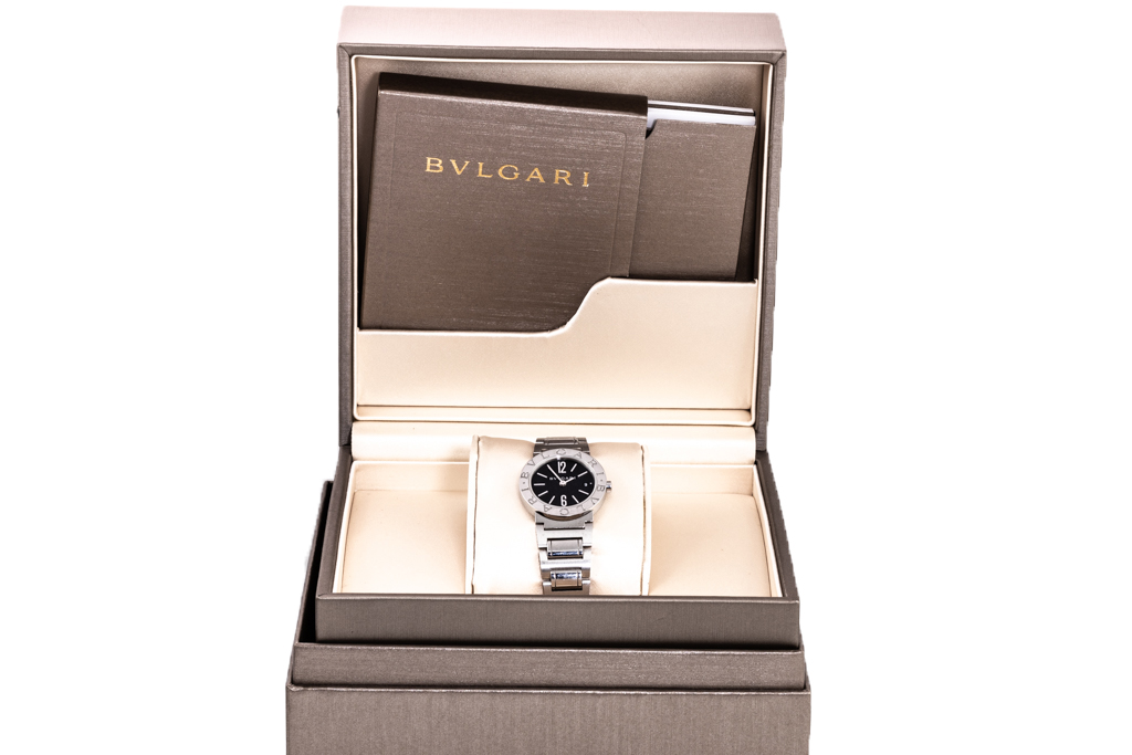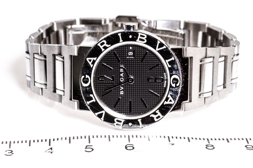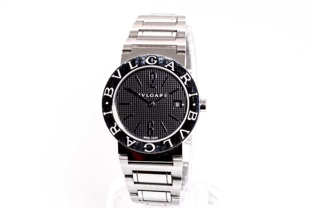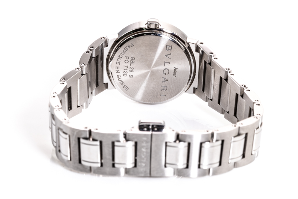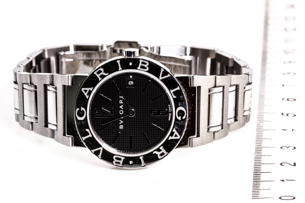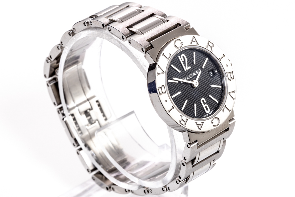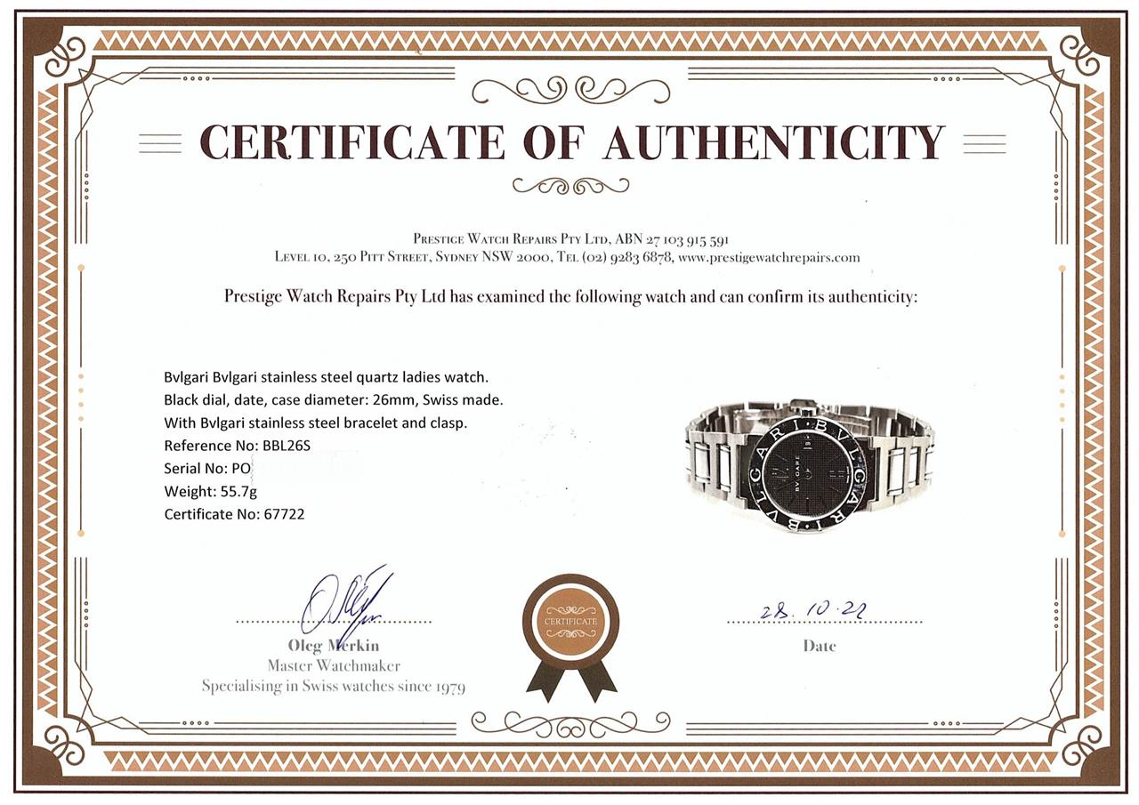 Bvlgari Bvlgari stainless steel quartz ladies watch. Black dial, date, case diameter: 26mm, wrist size: 16cm, Swiss made. Ref# BBL26S. With Bvlgari stainless steel bracelet and clasp. With Certificate of Authenticity, Bvlgari International Warranty card and Bvlgari box. 3 month FSA warranty. (Pre-owned)