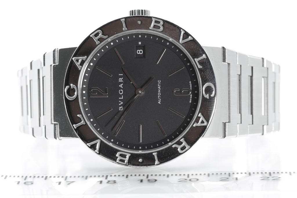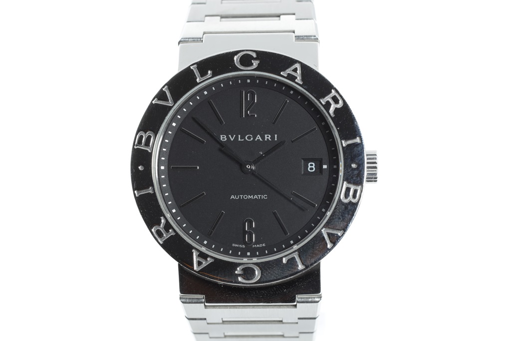 Bvlgari Bvlgari stainless steel automatic mens watch. Black dial, date case diameter: 38mm, wrist size: 18.5cm, Swiss made. Ref# BB38SSCH. With Bvlgari stainless steel bracelet and clasp. With Certificate of Authenticity and Bvlgari box. 3 month FSA warranty. (Pre-owned)