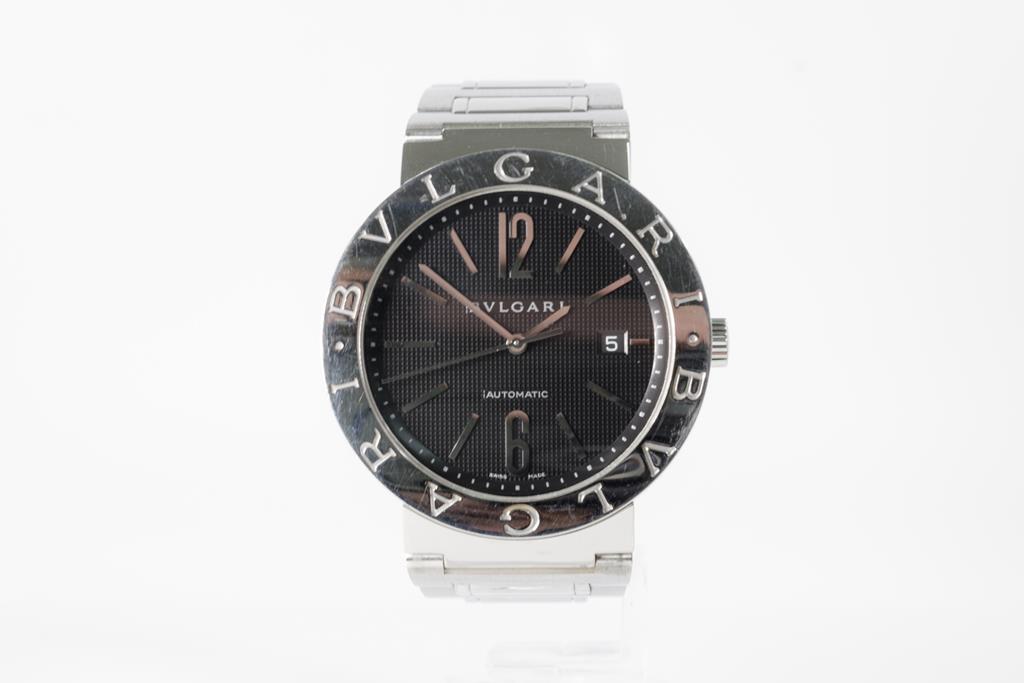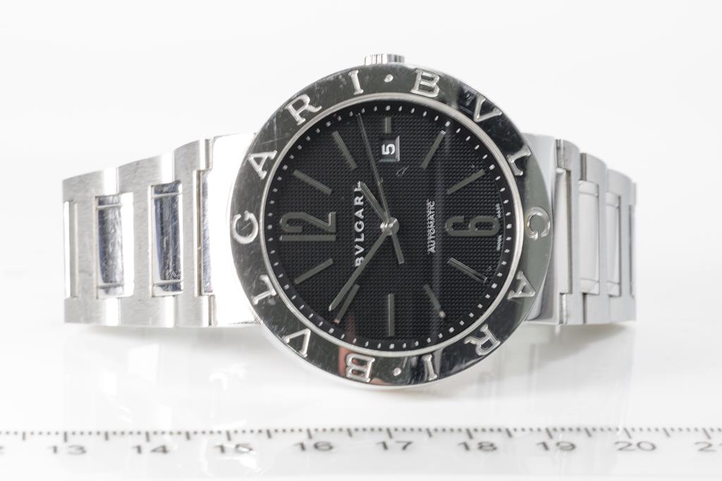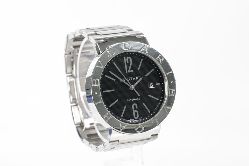 Bvlgari Bvlgari stainless steel automatic mens watch. Black dial, date, case diameter: 42mm, wrist size: 17cm, Swiss made. Ref# BB42SS. With Bvlgari stainless steel bracelet and clasp. With Certificate of Authenticity. 3 month FSA warranty. (Pre-owned)
