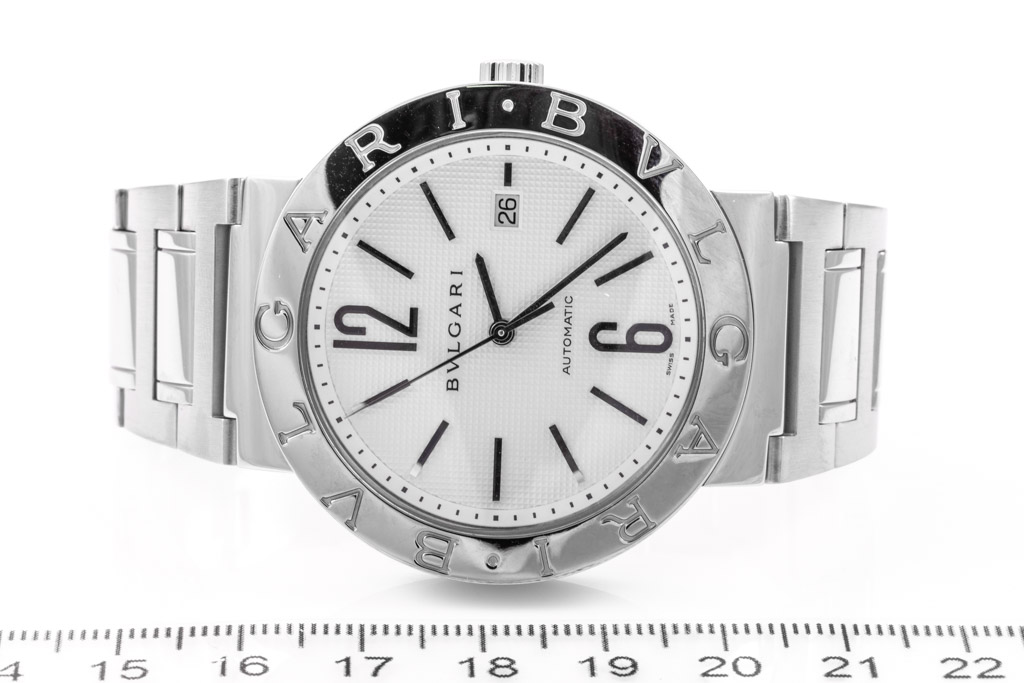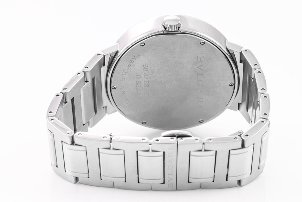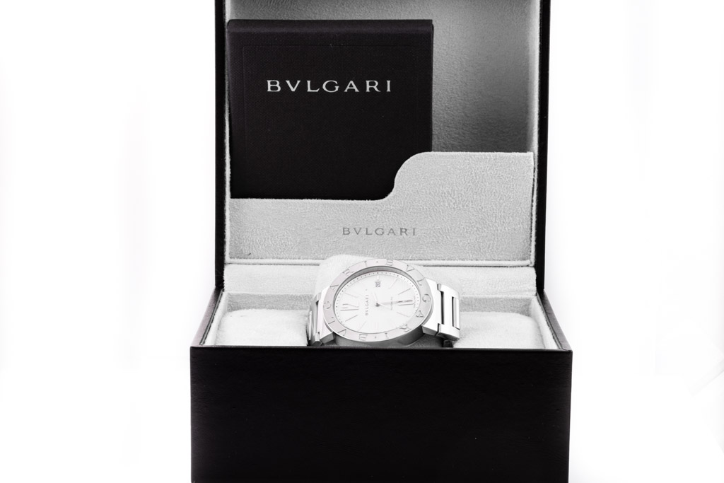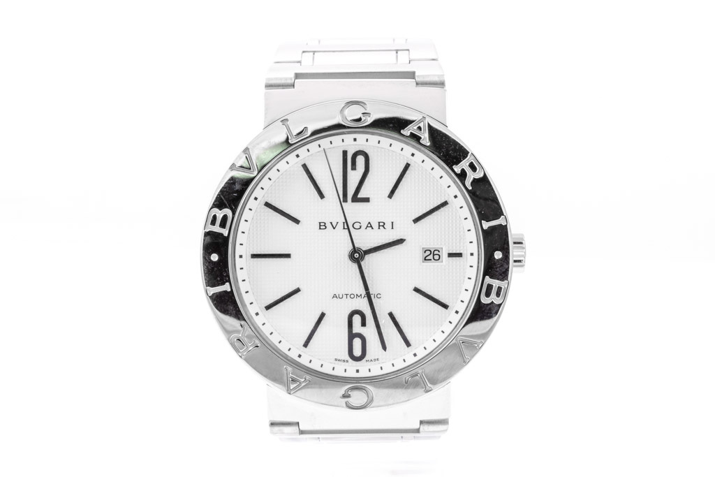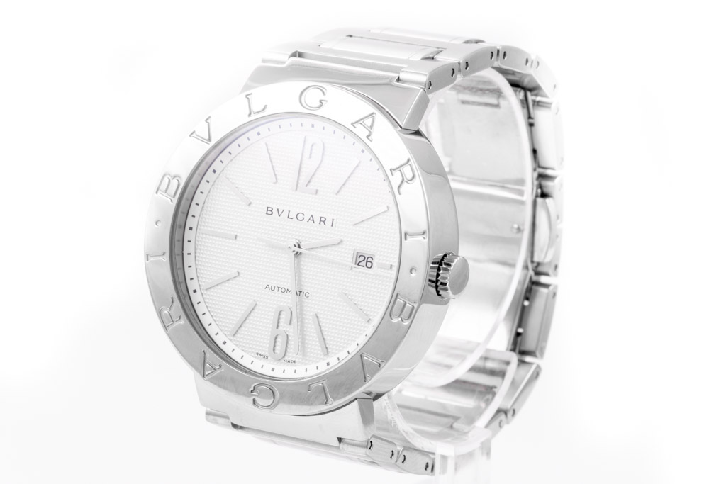 Bvlgari Bvlgari stainless steel automatic men's watch. Silver dial, date, case diameter: 42mm wrist size: 15.5cm, Swiss made. Ref# BB 42 SS. With stainless steel bracelet and clasp. With Certificate of Authenticity, Bvlgari International Warranty booklet dated 02/05/2011 and Bvlgari box. 3 month FSA warranty (Pre-owned)