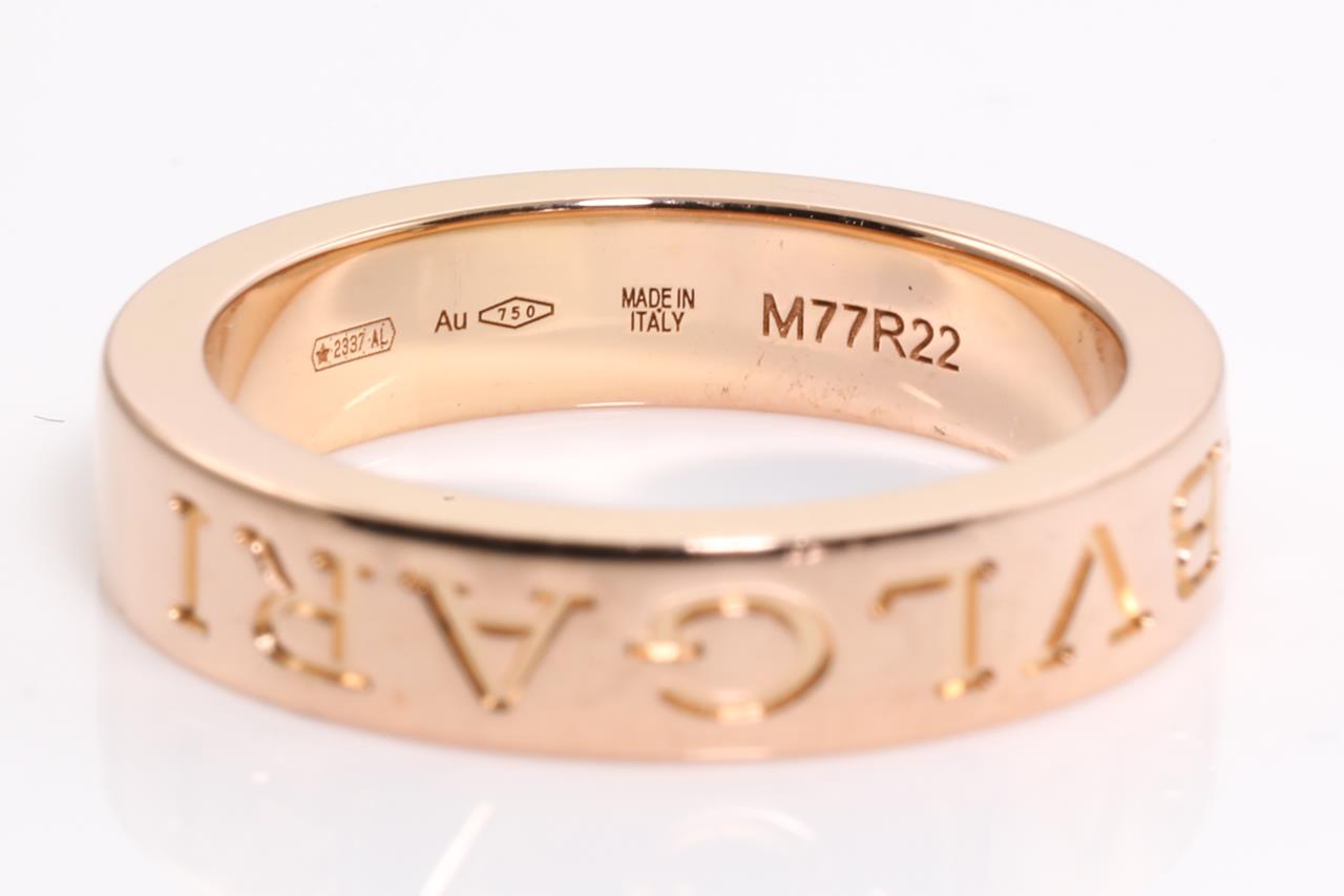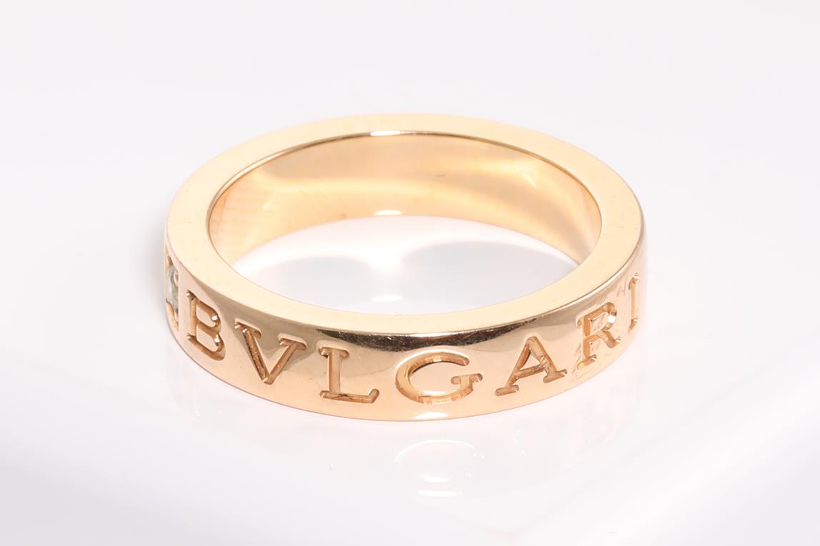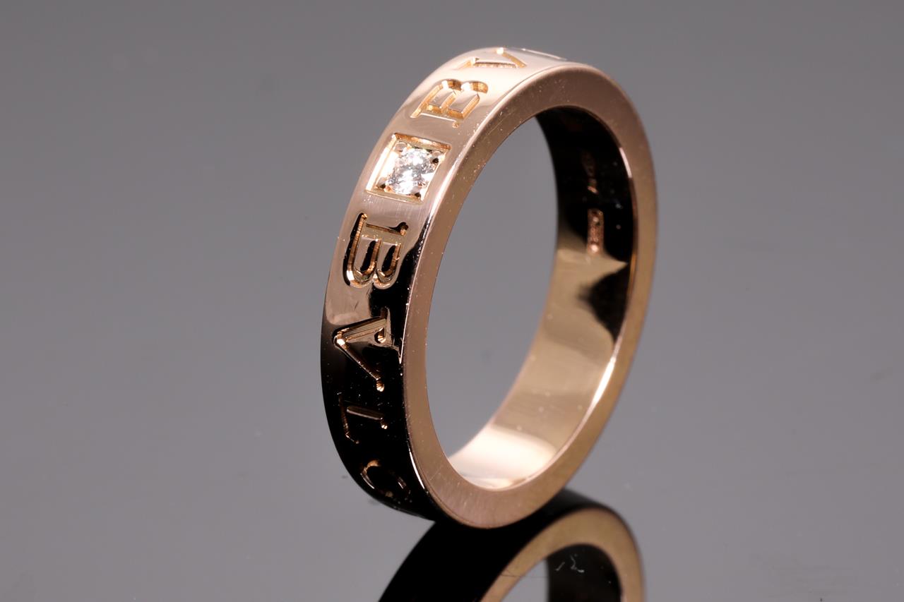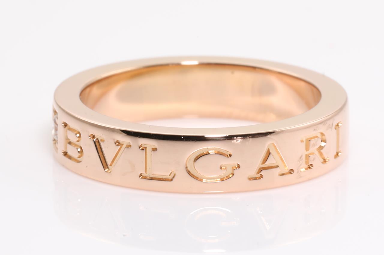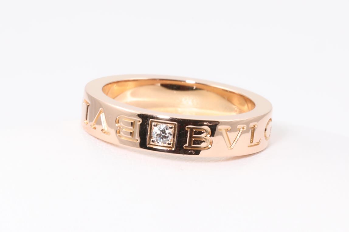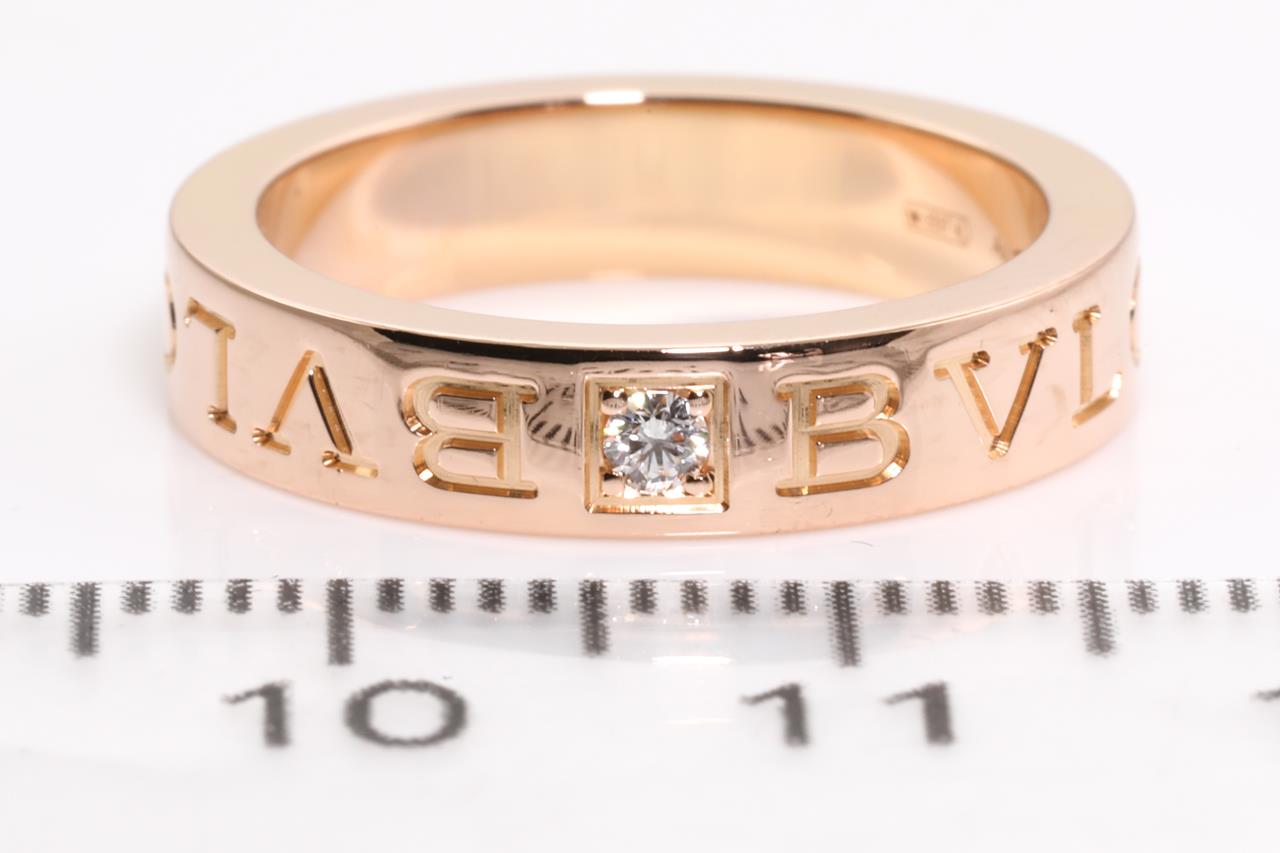Bvlgari Bvlgari trademark double logo ring with round Diamond of 0.04ct. 18ct rose gold. Ring size K1/2. Reference number #M77R22. With Bvglari box. Weight: 6.6g (Pre-owned)