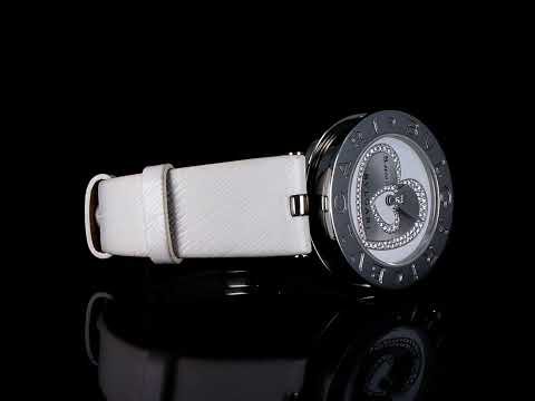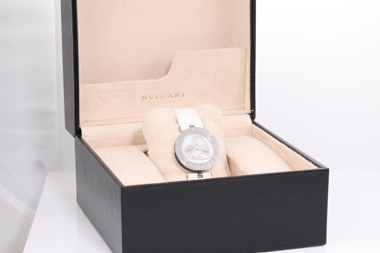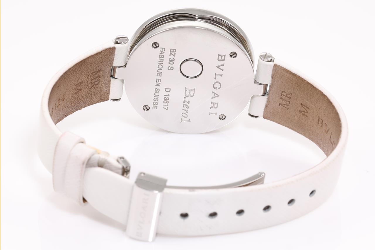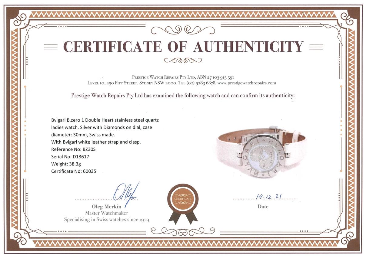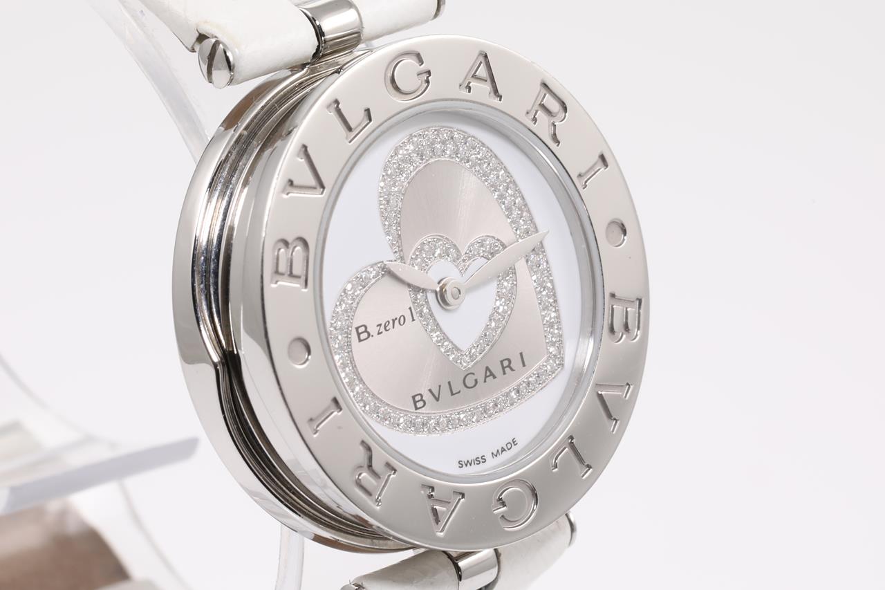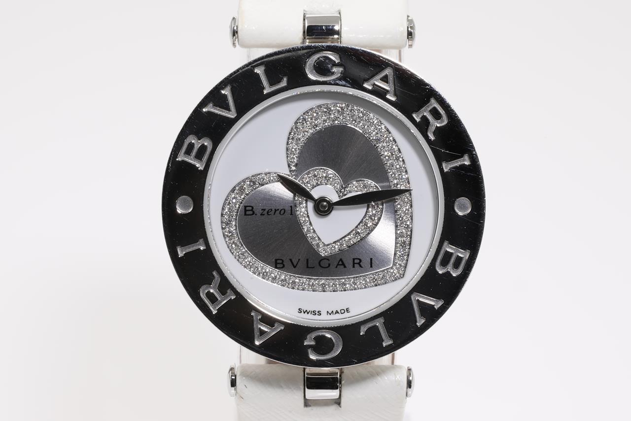 Bvlgari B.zero 1 Double Heart stainless steel quartz ladies watch. Silver with Diamonds on dial, case diameter: 30mm, wrist size: 16cm, Swiss made. Ref# BZ30S. With Bvlgari white leather strap and clasp. With Certificate of Authenticity, Bvlgari International Warranty Booklet dated 12/2/2008 and Bvlgari box. 3 month FSA warranty. (Pre-owned)