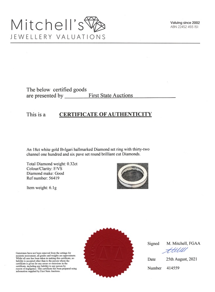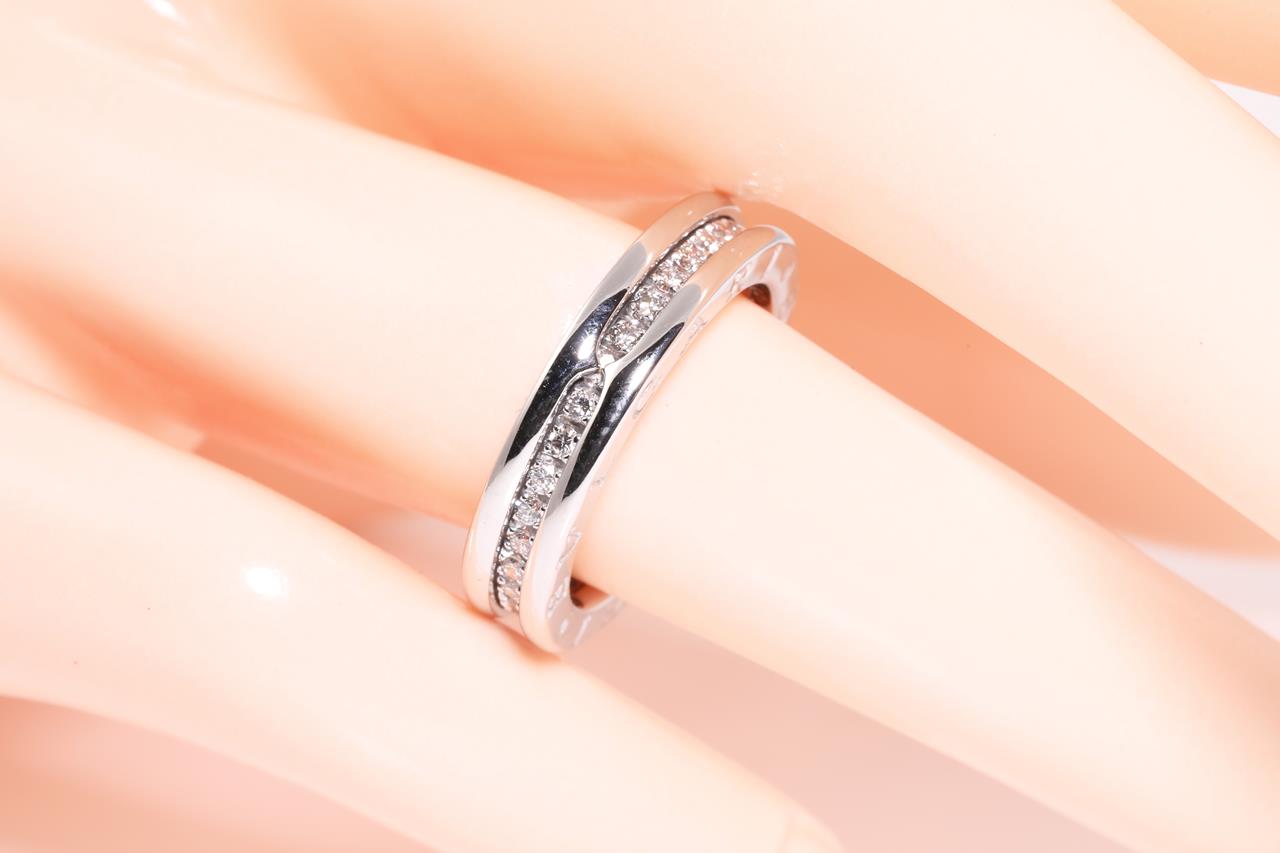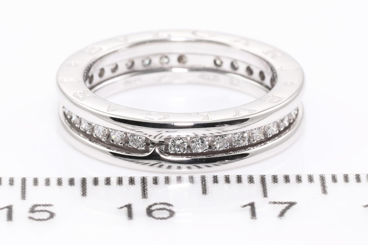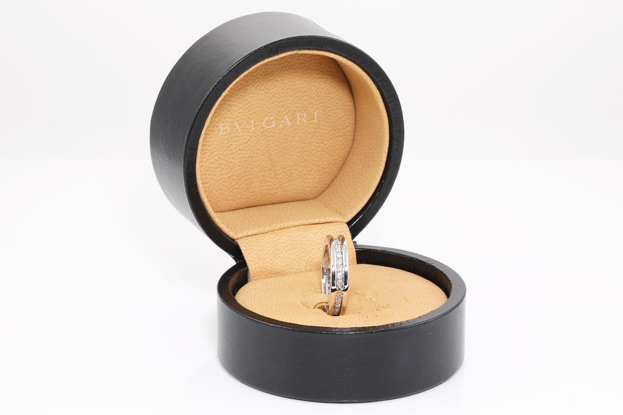 Bvlgari B.Zero full hoop Diamond ring with round Diamonds totalling 0.43cts (Estimated grading: F VS). 18ct white gold. Bvlgari stamped size 52, L1/2 - ring resizing is not recommended. With certificate #414559 and Bvlgari box. Weight: 6.1g (Pre-owned)