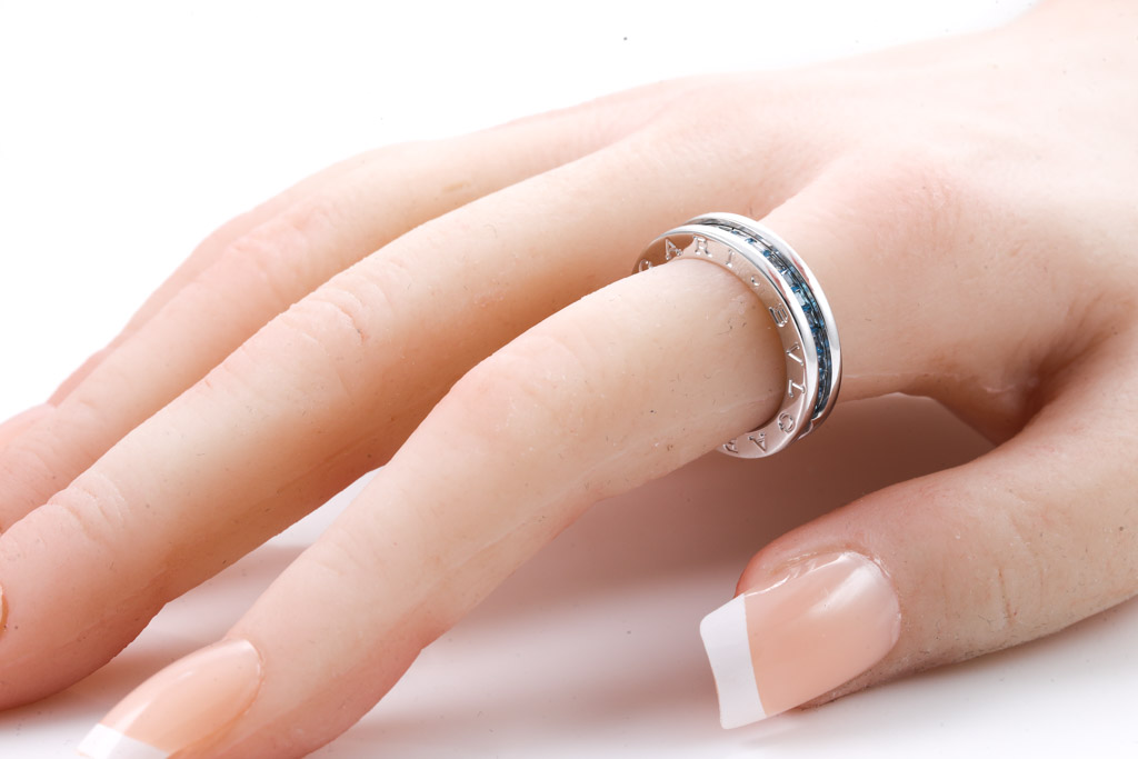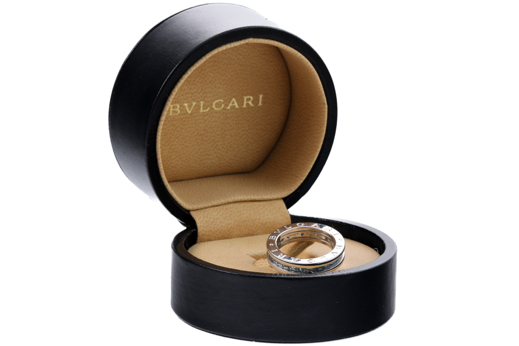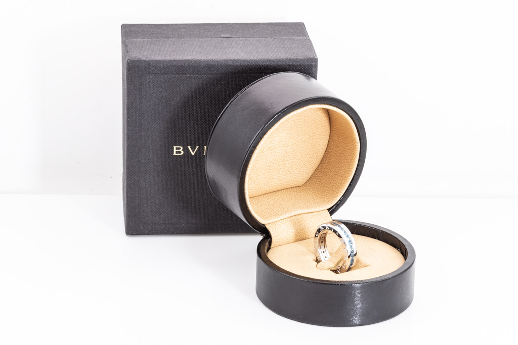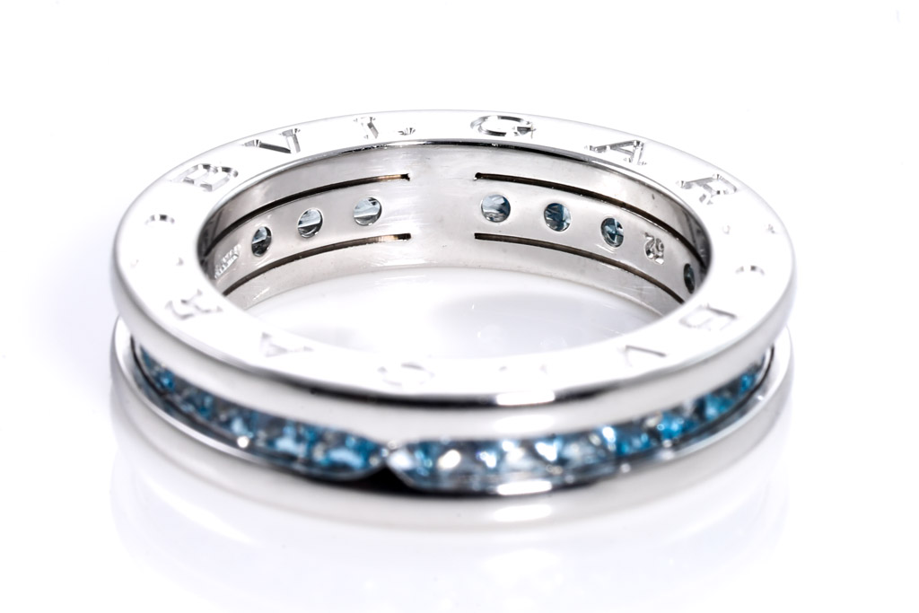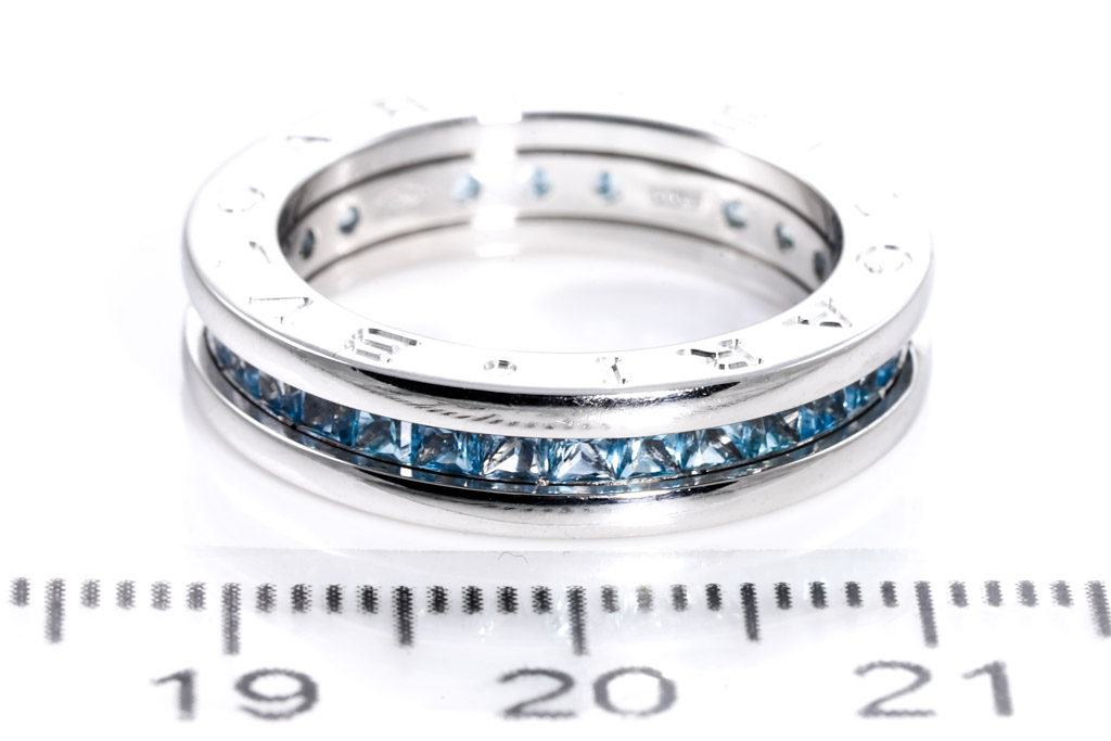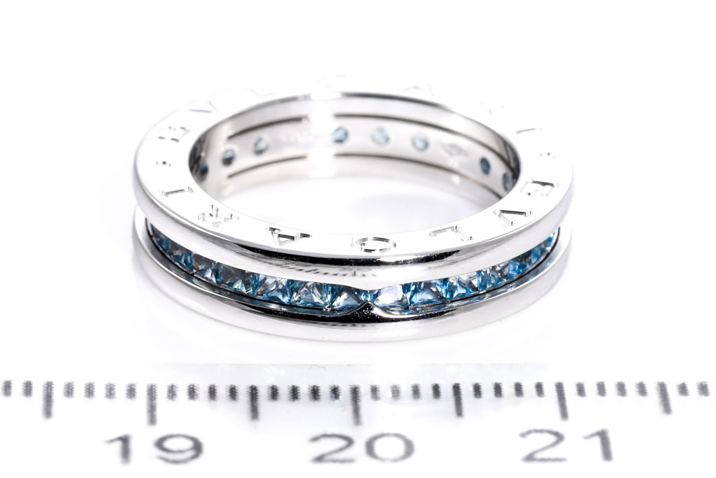 Bvlgari B. Zero1 Blue Topaz ring with square cut blue Topaz. Made in Italy. 18ct white gold. Bvlgari stamped size 52, L1/2 - ring resizing is not recommended. Weight: 8.6g. With Bvlgari box. (Pre-owned)