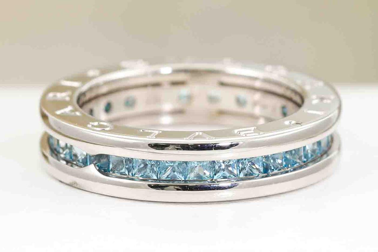 Bvlgari B. Zero1 Blue Topaz ring with square cut blue Topaz. Bvlgari stamped size 52, L - ring resizing is not recommended. 18ct white gold. Weight: 8.6g. With Bvlgari box. (Pre-owned)