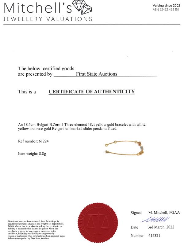 Bvlgari B.Zero1 three element bracelet. 18ct yellow, rose & white gold. Adjustable max length: 18.5cm. Weight: 8.8g. Made in Italy. With certificate #415321. (Pre-owned)