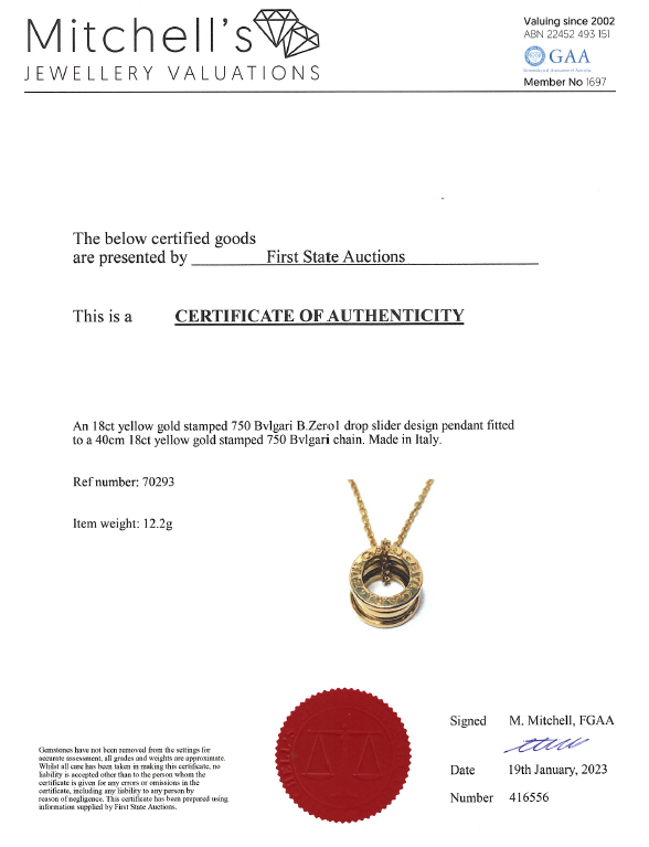 Bvlgari B.Zero1 necklace. 18ct yellow gold with Bvlgari 18ct yellow gold 40cm chain. Weight: 12.2g. Made in Italy. With Certificate #416556. (Pre-owned)
