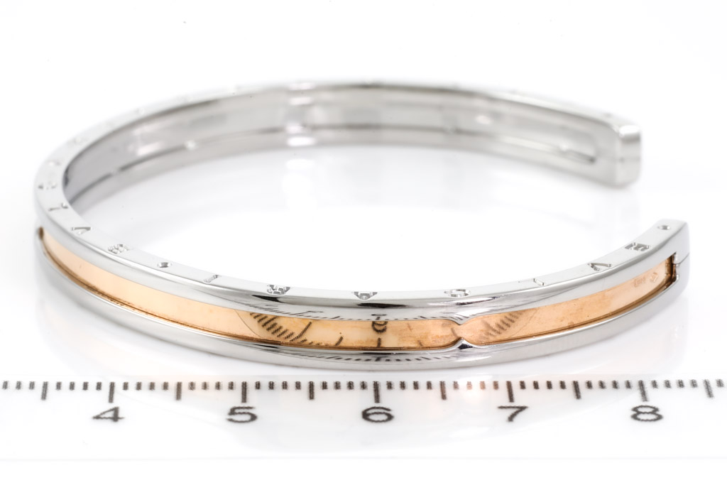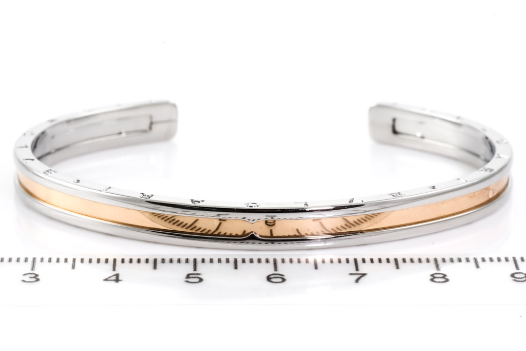 Bvlgari B.Zero1 open cuff bangle. 18ct rose gold and stainless steel. Made in Italy. Circumference: approximately 17cm. Weight: 14.7g. (Pre-owned)