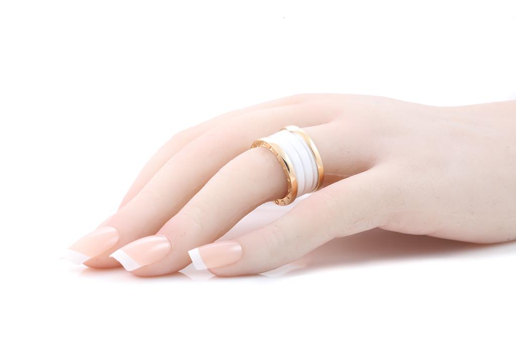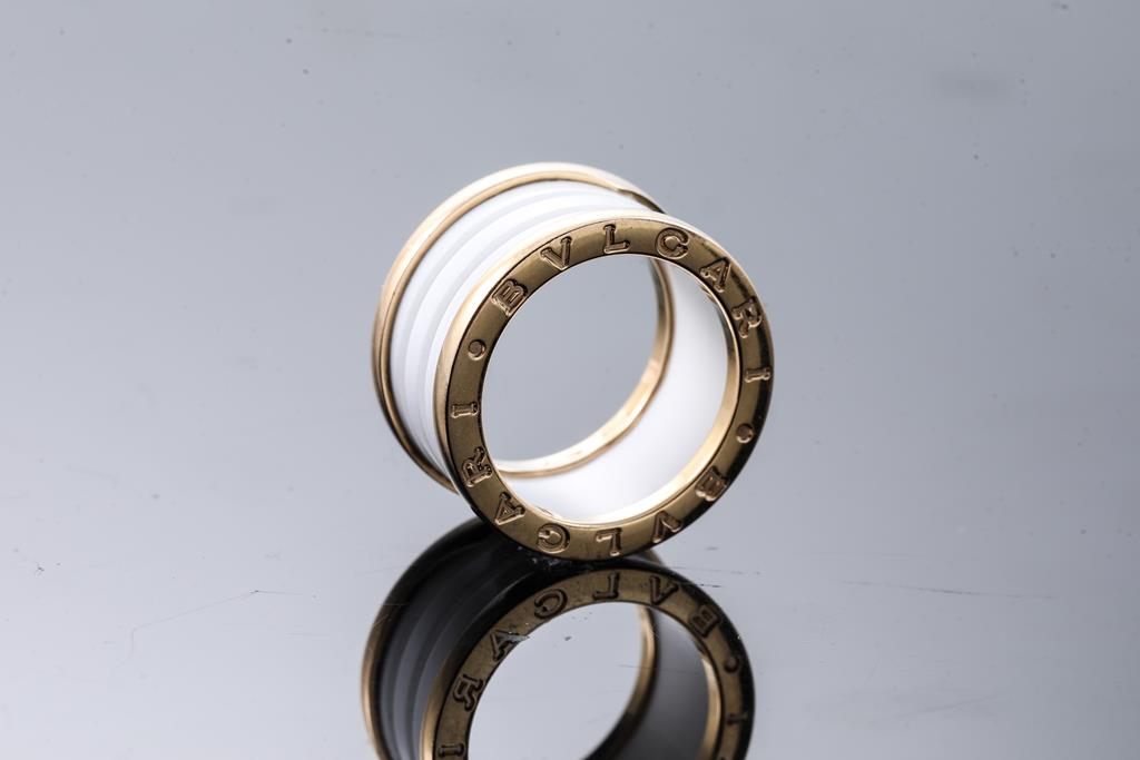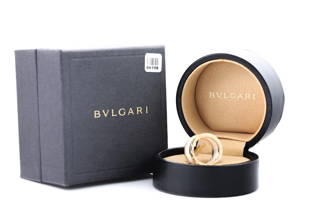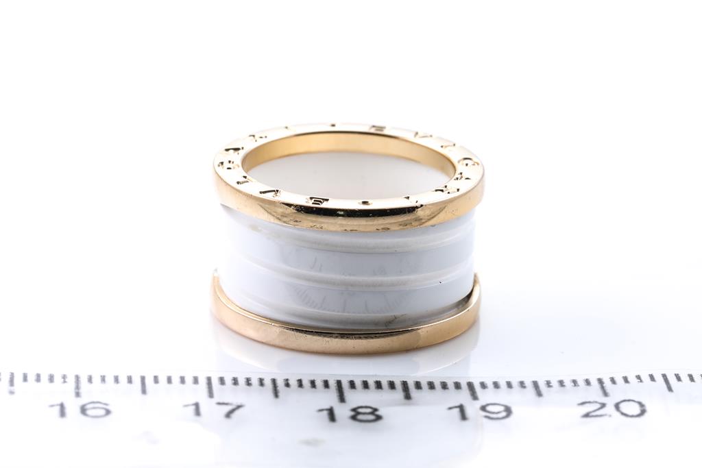 Bvlgari B. Zero1 four band ring. 18ct rose gold and ceramic. Bvlgari stamped size 52, M1/2 - ring resizing is not recommended. Made in Italy. Weight: 9.3g. With Bvlgari box. (Pre-owned)