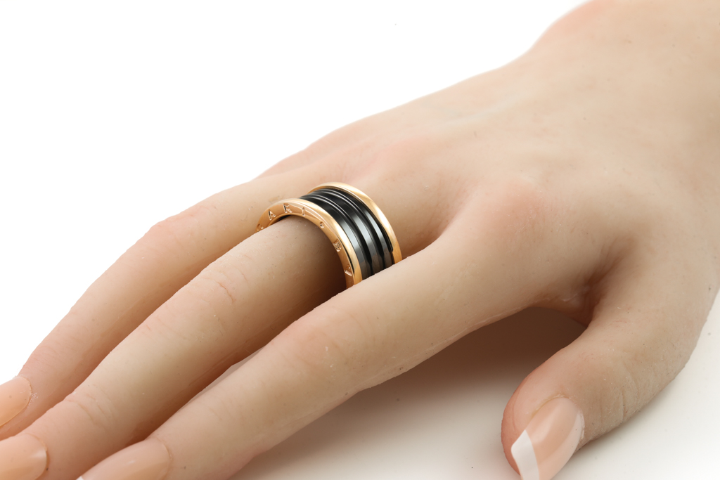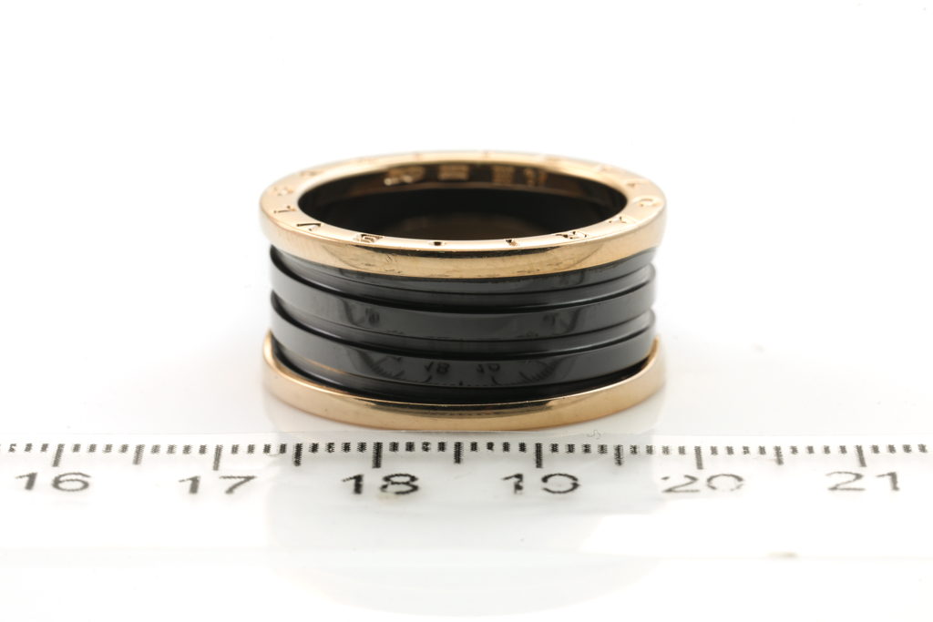 Bvlgari B. Zero1 four band ring. 18ct rose gold and black ceramic. Bvlgari stamped size 67, ring size W1/2 - ring resizing is not recommended. Weight: 12.4g. (Pre-owned)
