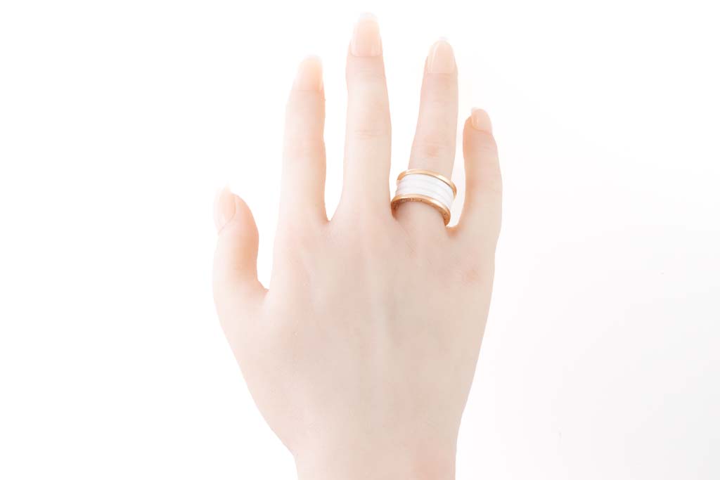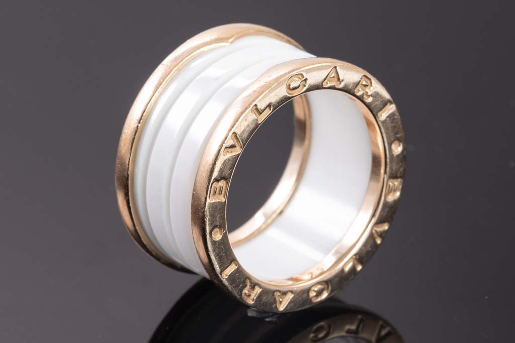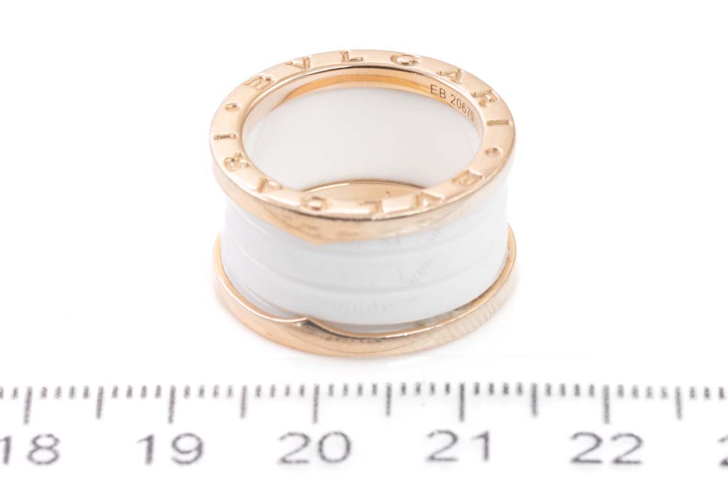 Bvlgari B.Zero1 18ct rose gold & white ceramic ring. Made in Italy. Stamped size 52, K1/2 - ring resizing is not recommended. Width: 12.1mm. Weight: 9.5g. (Pre-owned)