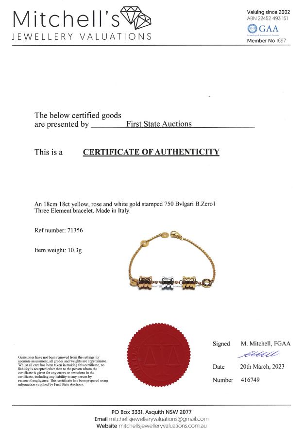 Bvlgari B.Zero1 three element bracelet. 18ct yellow, rose & white gold. Made in Italy. Adjustable max length: 18cm. Weight: 10.3g. With Certificate #416749. (Pre-owned)