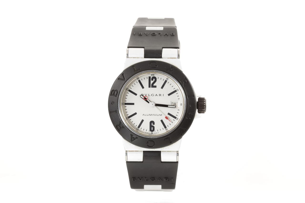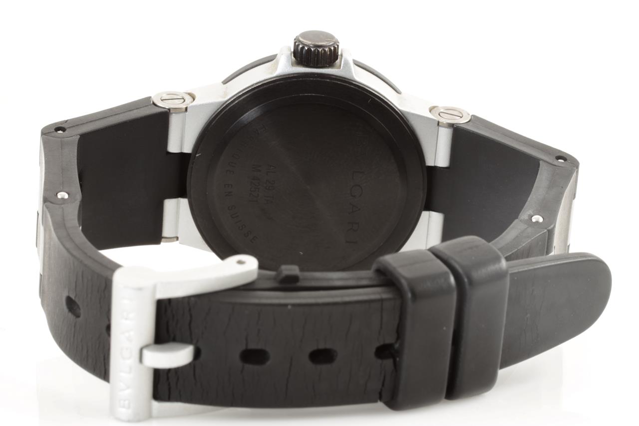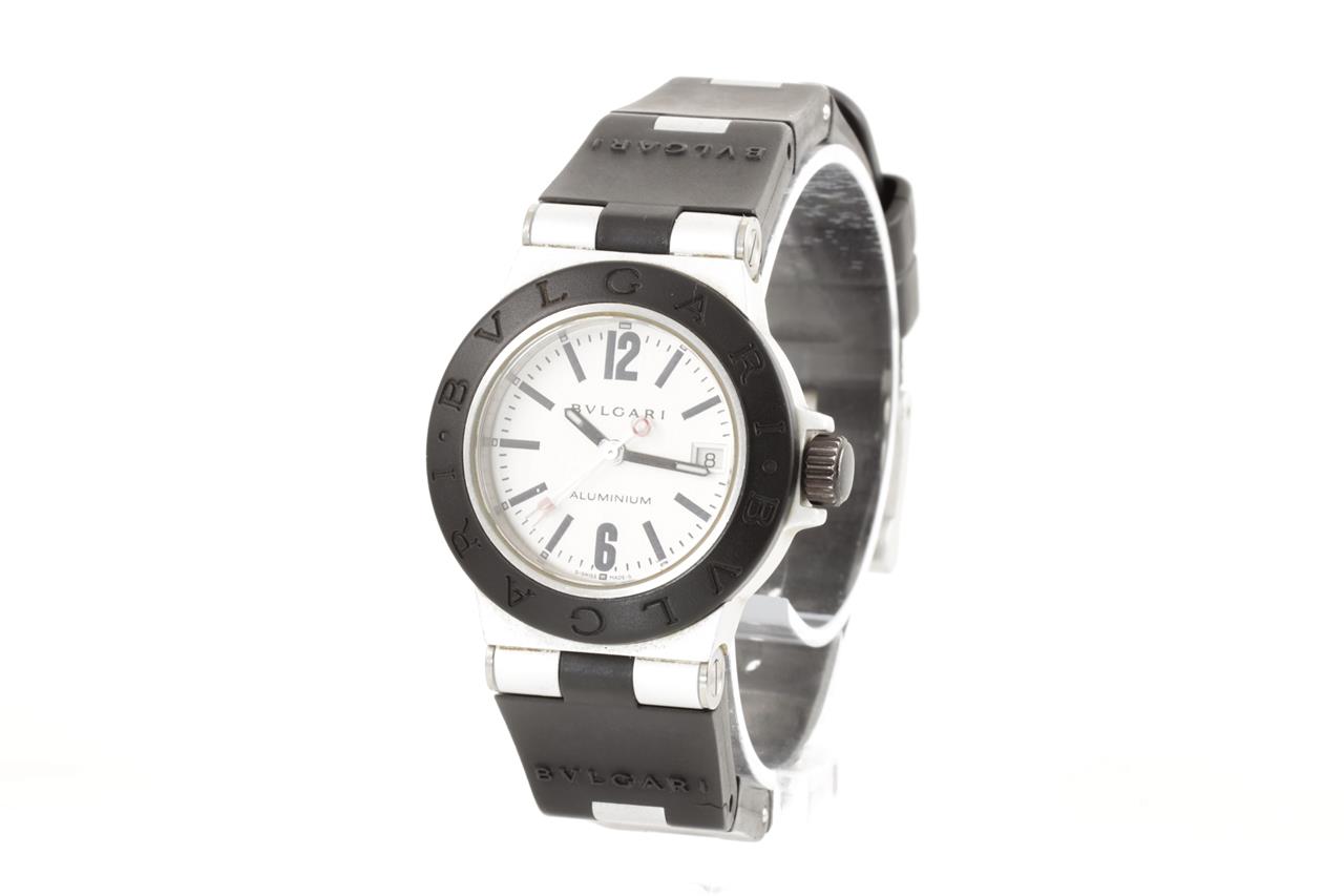 Bvlgari Diagono aluminium quartz ladies watch. Silver dial, date, case diameter: 29mm, length: 19.5cm, Swiss made. Ref# AL29TA With Bvlgari black rubber strap and clasp. With certificate of authenticity. 3 month FSA warranty. (Pre-owned)