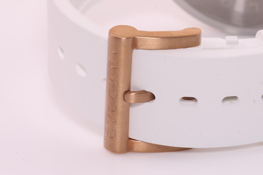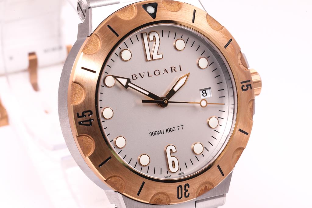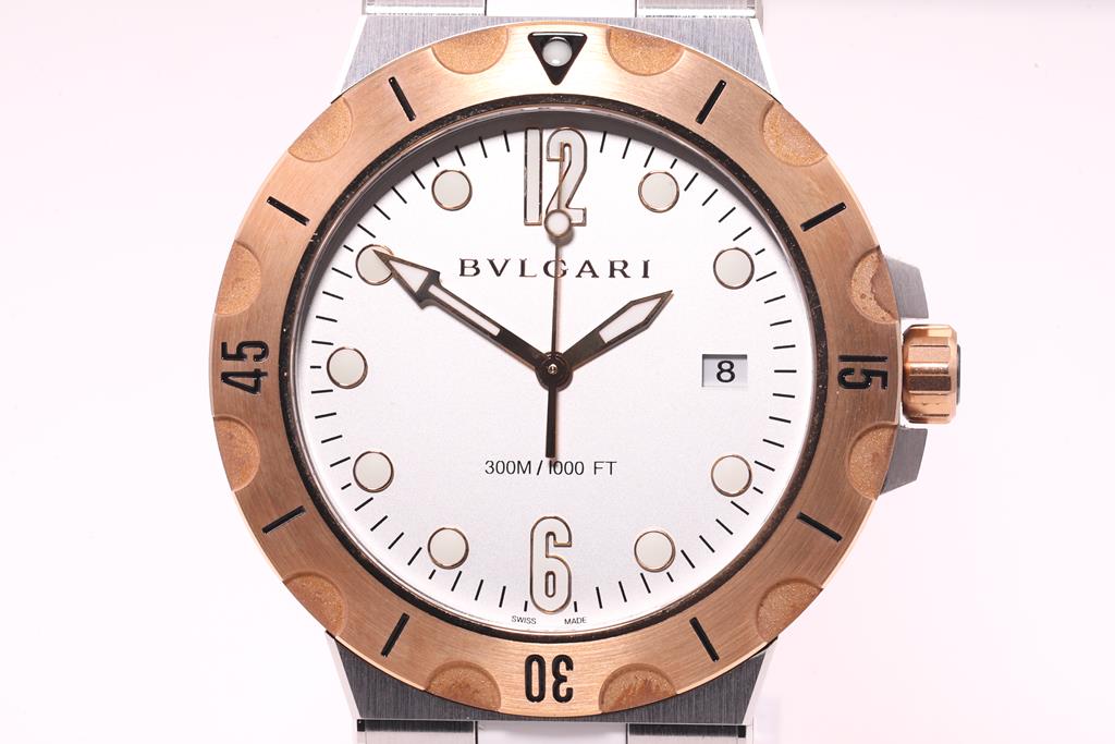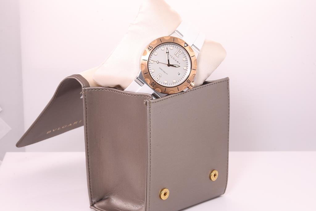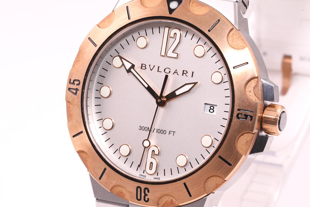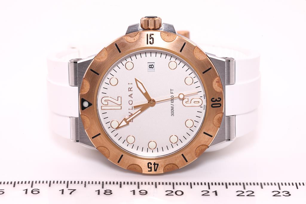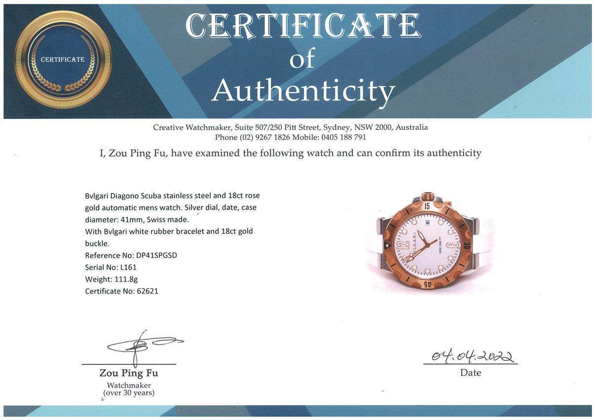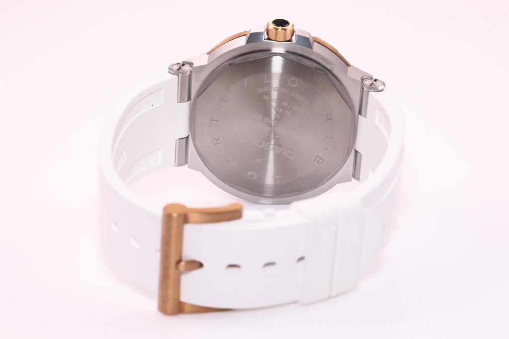 Bvlgari Diagono Scuba stainless steel and 18ct rose gold automatic mens watch. Silver dial, date, case diameter: 41mm, length: 21.5cm, Swiss made. Ref# DP41SPGSD. With Bvlgari white rubber bracelet and 18ct gold buckle. With Certificate of Authenticity and Bvlgari case. 3 month FSA warranty. (Pre-owned)