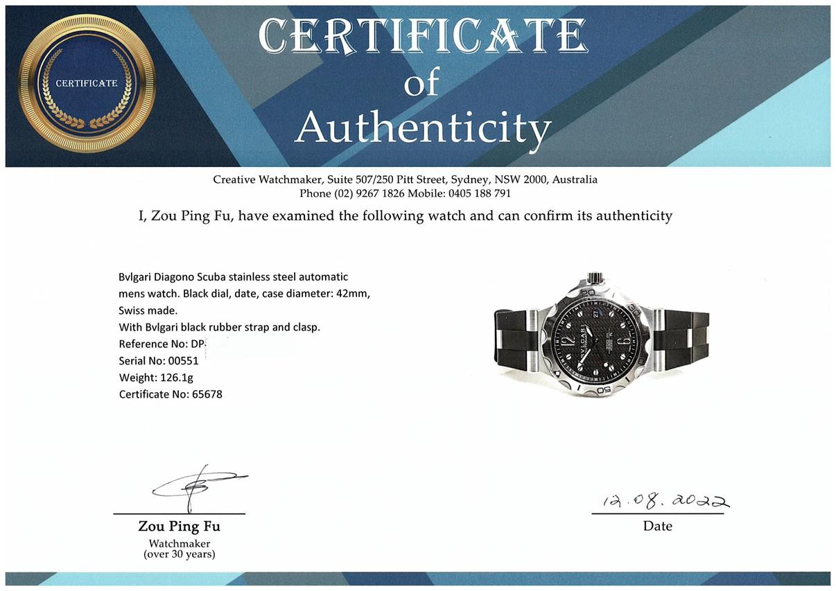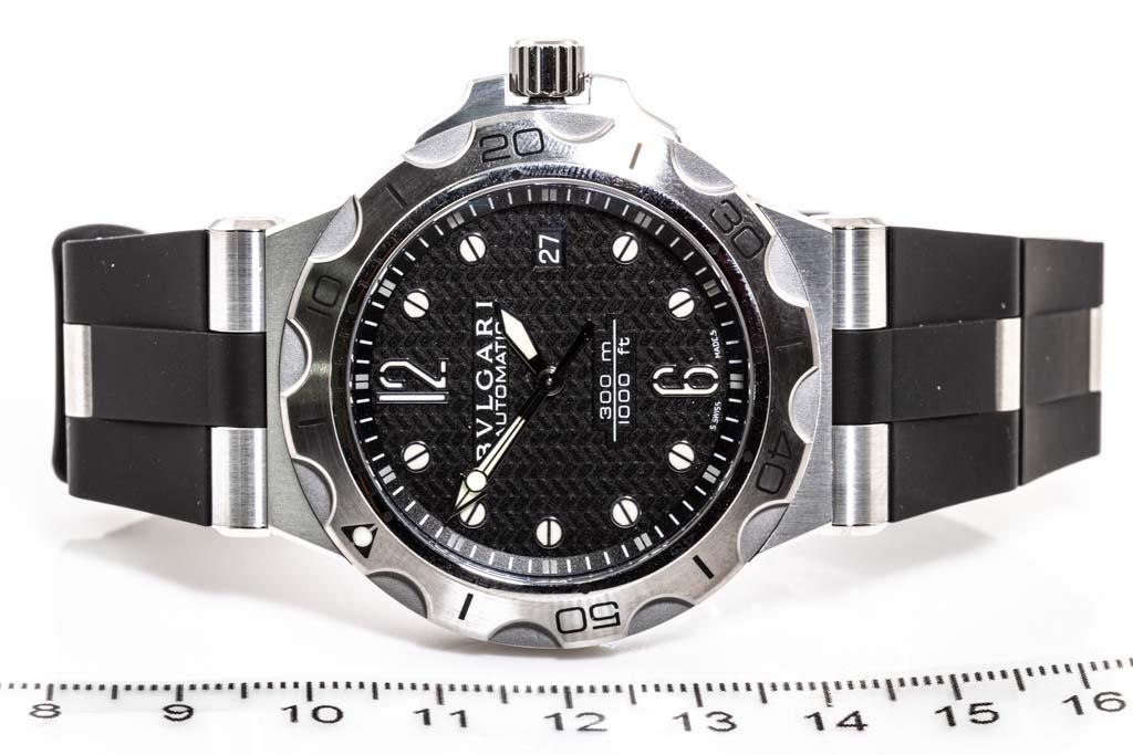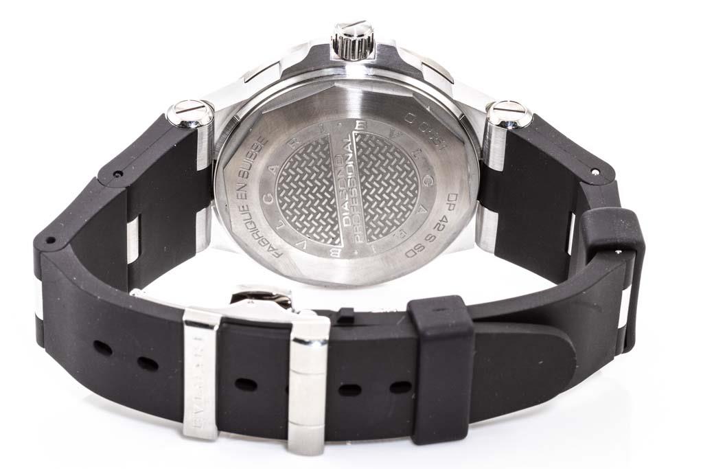 Bvlgari Diagono Scuba stainless steel automatic mens watch. Black dial, date, case diameter: 42mm, adjustable max wrist size: 20cm, Swiss made. Ref# DP42SSD. With Bvlgari black rubber strap and clasp. With Certificate of Authenticity and Bvlgari box. 3 month FSA warranty. (Pre-owned)