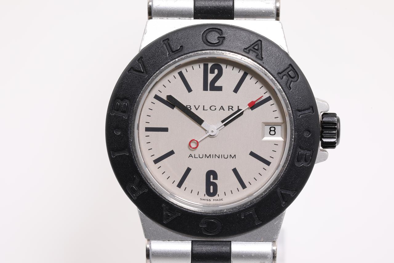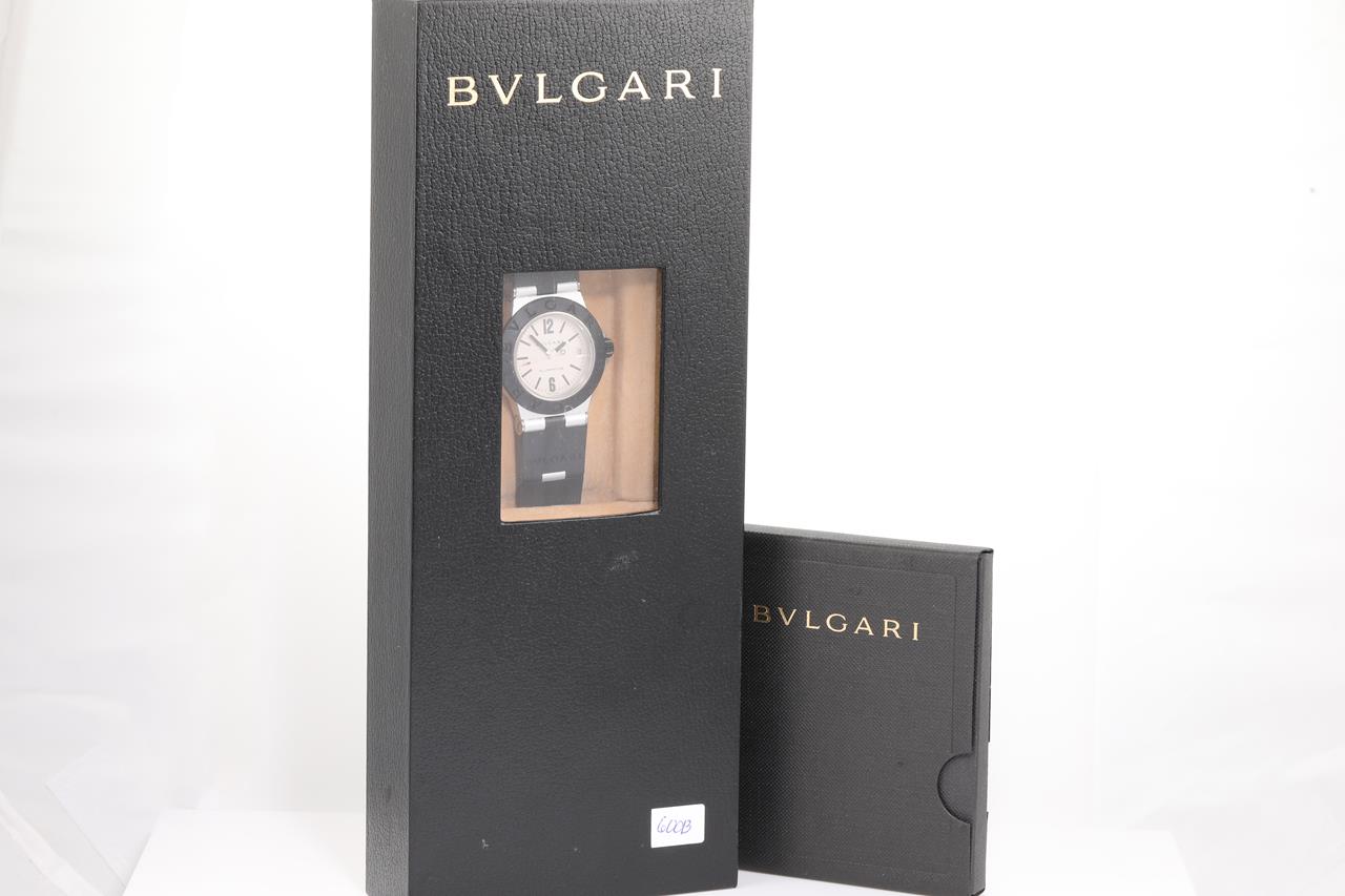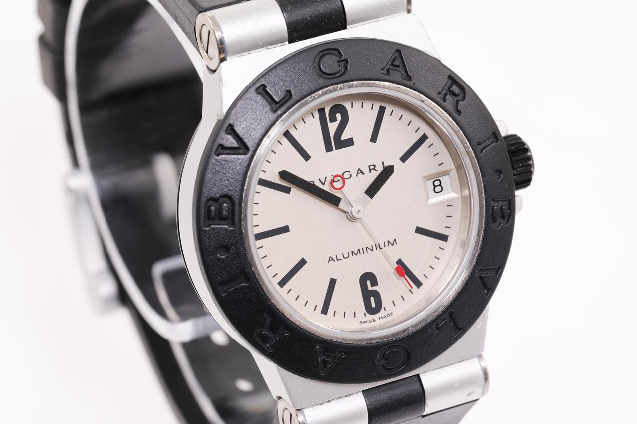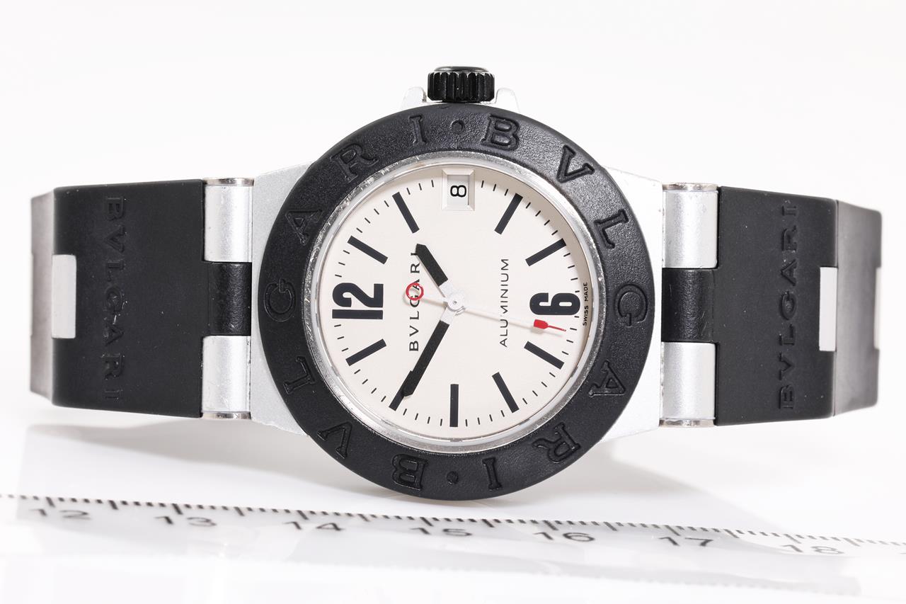 Bvlgari Diagono aluminum quartz watch. White dial, date, case diameter: 32mm, length: 20cm, Swiss made. Ref# AL32TA. With Bvlgari black rubber strap and clasp. With Certificate of Authenticity, Bvlgari International Warranty booklet and Bvlgari case. 3 month FSA warranty. (Pre-owned)