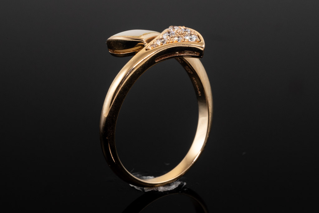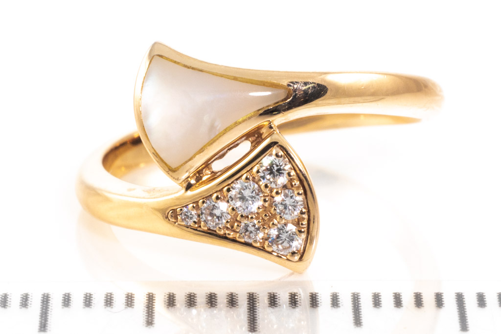 Bvlgari Diva Dream ring with Mother of Pearl and Diamonds totalling 0.08cts. 18ct rose gold. Bvlgari stamped size 51, K - ring resizing is not recommended. Weight: 3.1g. Made in Italy. With Bvlgari box & International Authenticity Card. (Pre-owned)