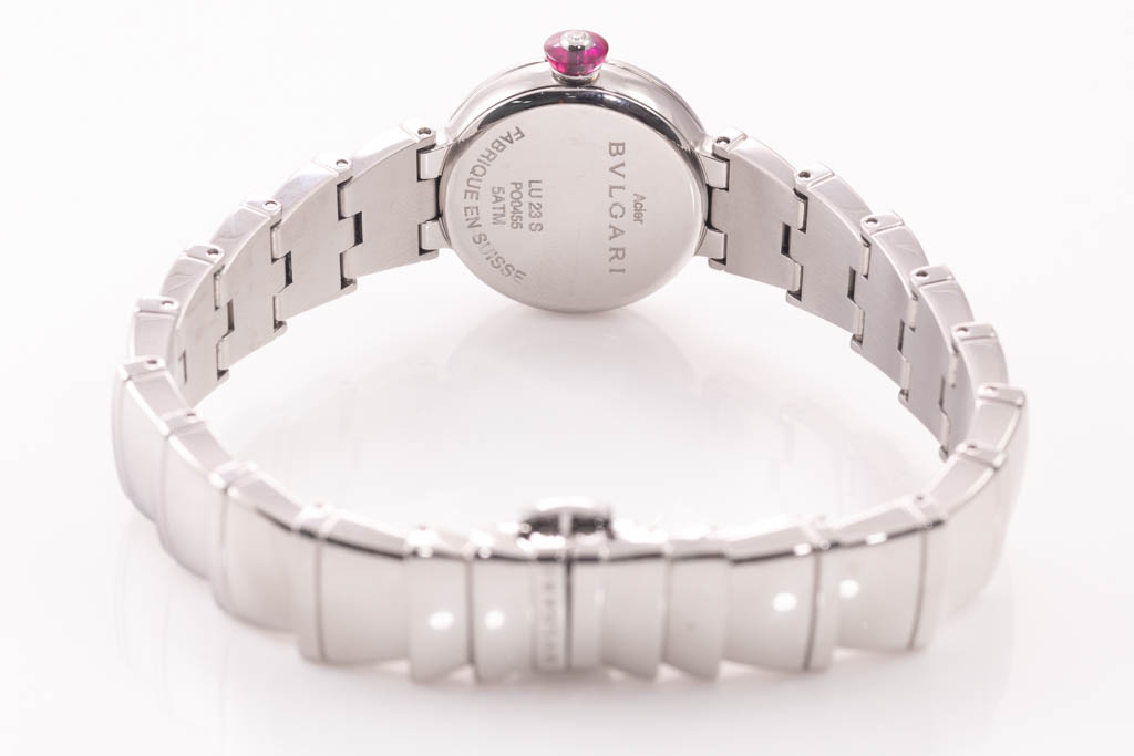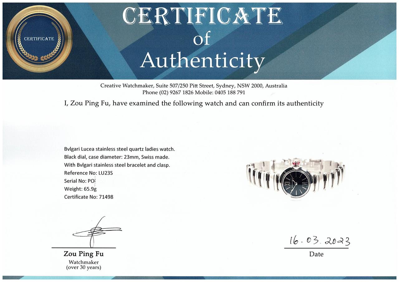 Bvlgari Lucea stainless steel quartz ladies watch. Black dial, case diameter: 23mm, wrist size: 17.5cm, Swiss made. Ref# LU23S. With Bvlgari stainless steel bracelet and clasp. With Certificate of Authenticity, Bvlgari International Warranty Card dated 04/07/2021 and Bvlgari box. 3 month FSA warranty. (Pre-owned)
