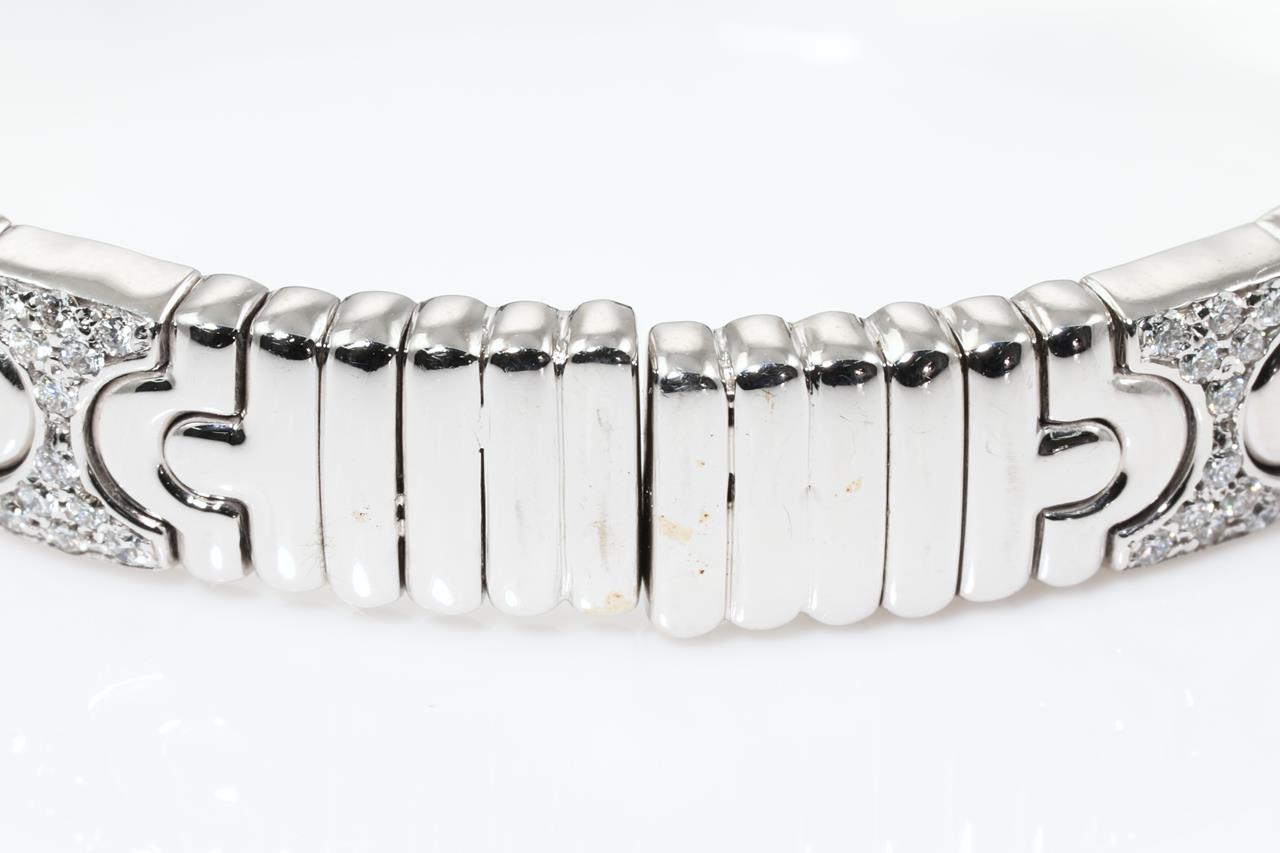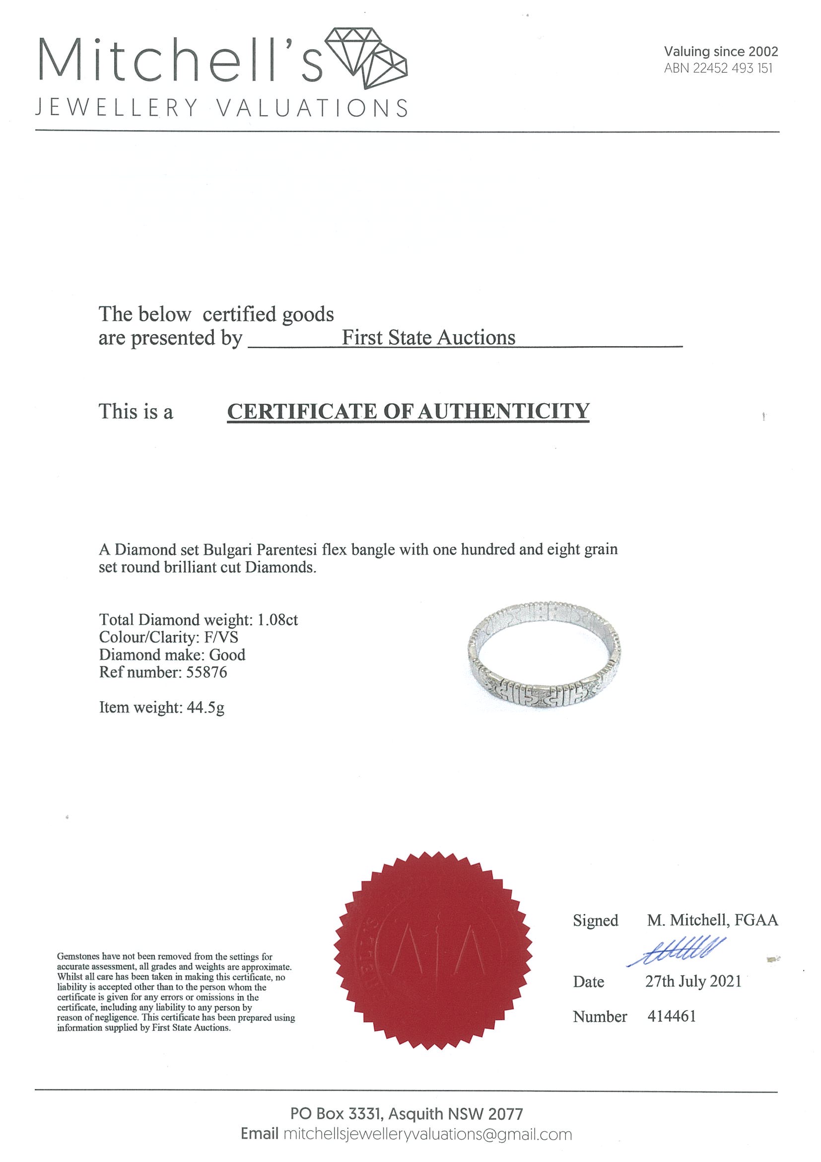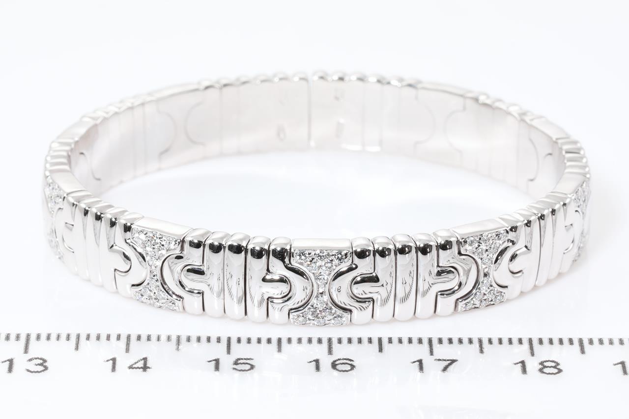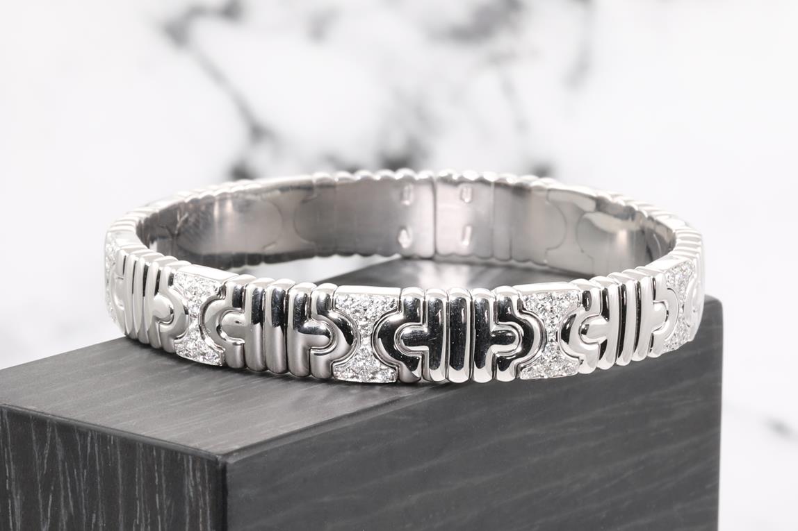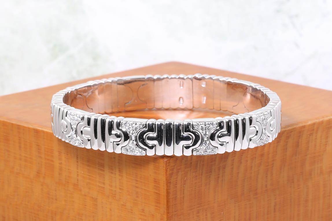 Bvlgari Parentesi Diamond bangle with flexible opening. Diamonds totalling approximately 1.08ctscts (Estimated grading: F VS). 18ct white gold. Wrist size 15cm. Weight: 44.5g. With certificate #414461. Circa 2000's. (Pre-owned)