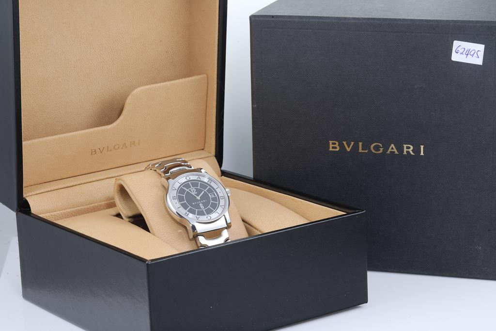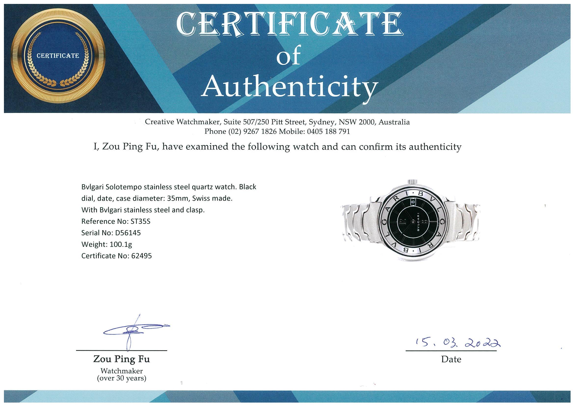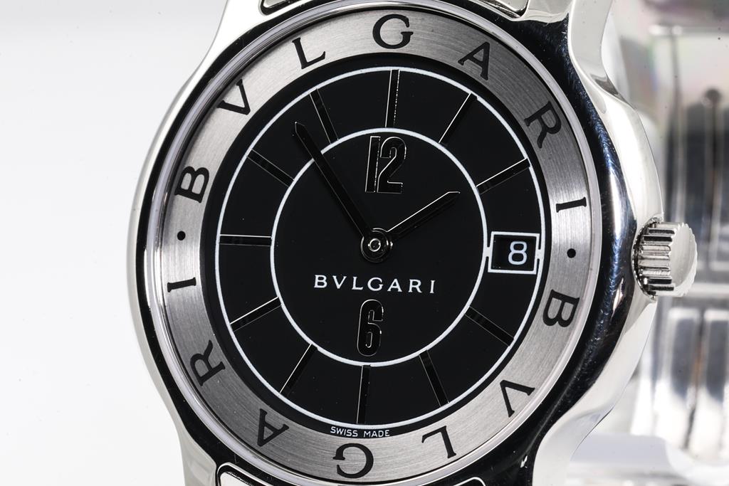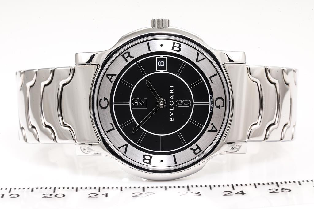 Bvlgari Solotempo stainless steel quartz watch. Black dial, date, case diameter: 35mm, wrist size: 16cm, Swiss made. Ref# ST35S. With Bvlgari stainless steel and clasp. With Certificate of Authenticity and Bvlgari International Warranty Card date 17/7/2020, International Guarantee booklet dated 30/9/2002 and Bvlgari box. 3 month FSA warranty. (Pre-owned)
