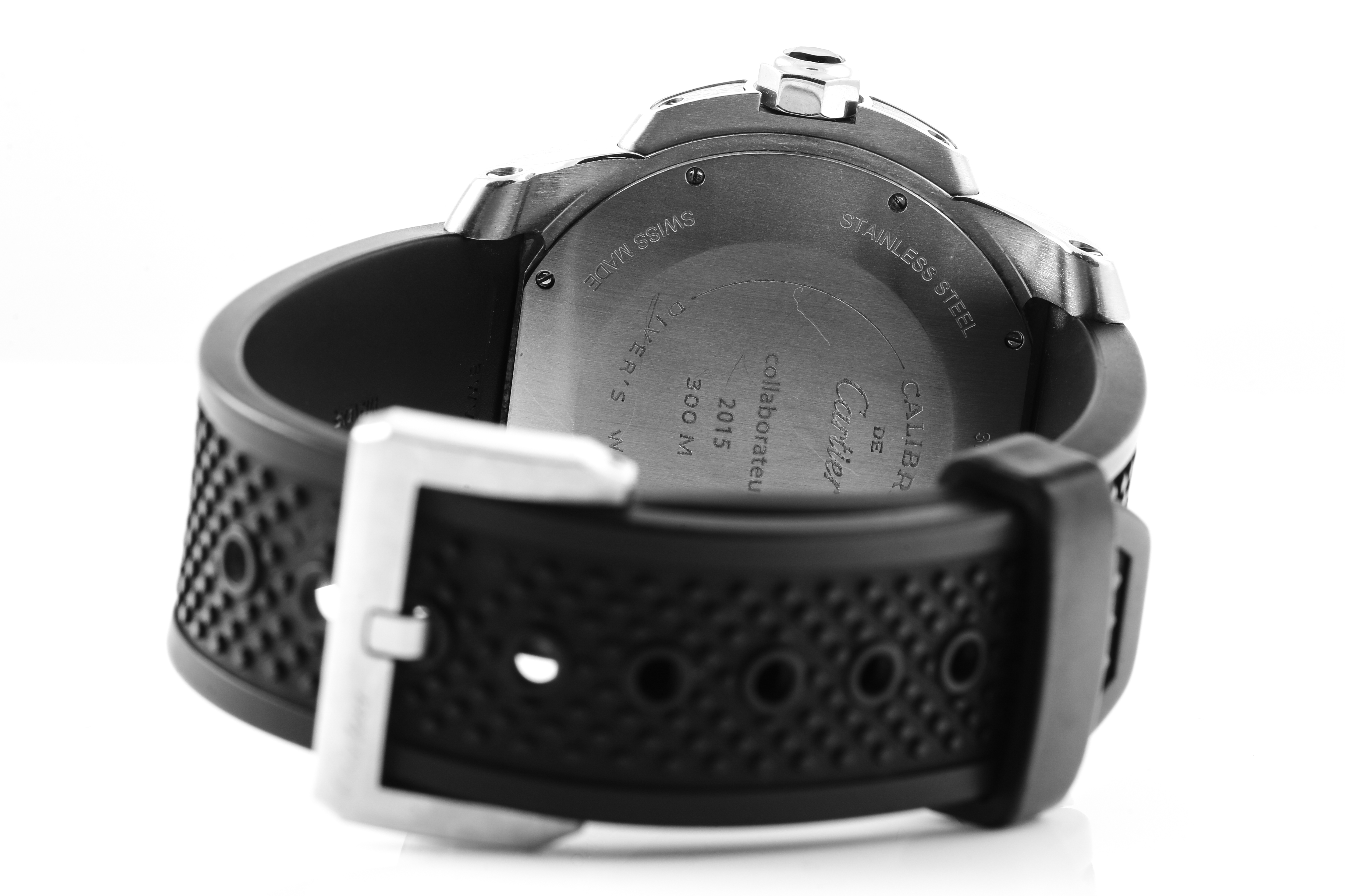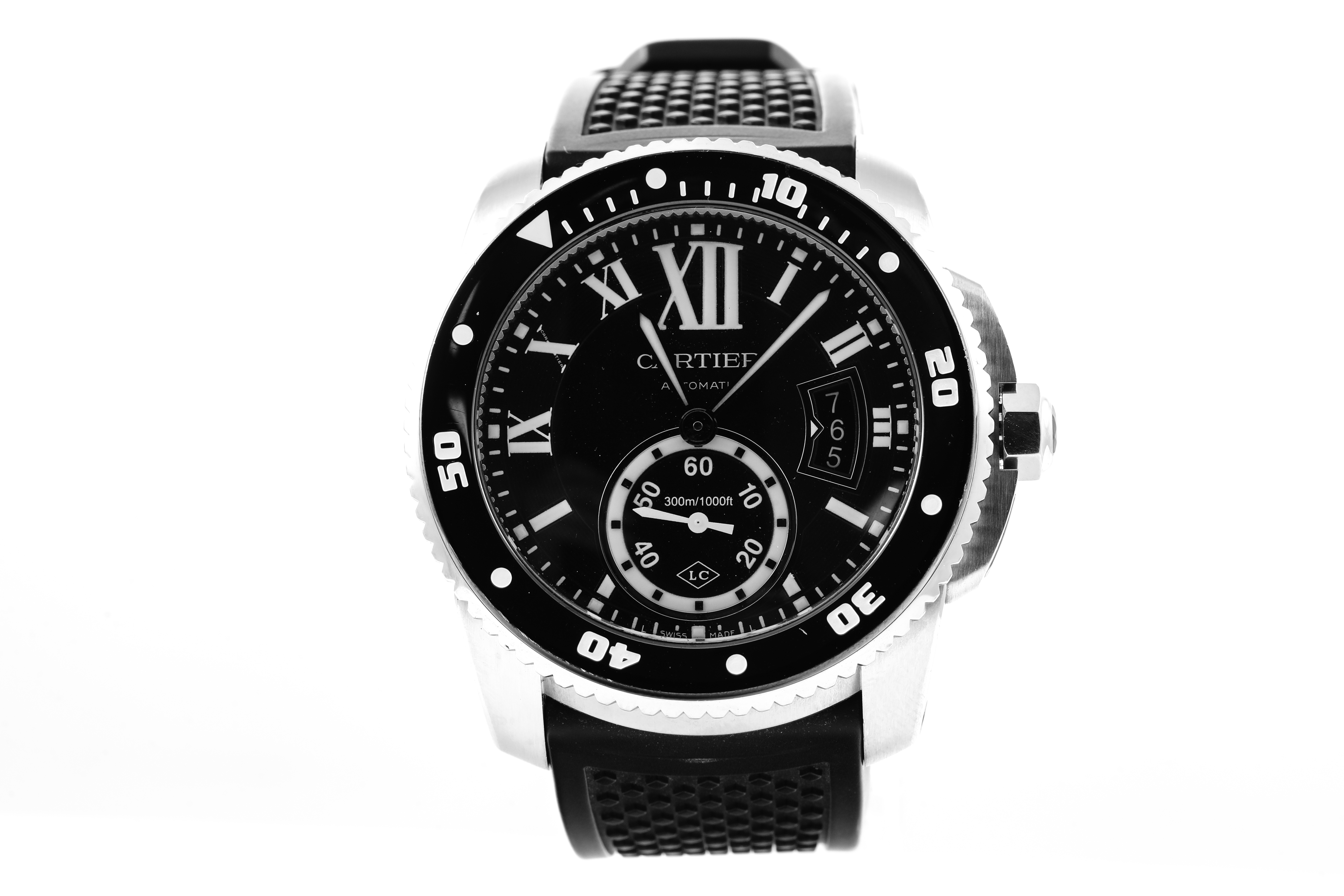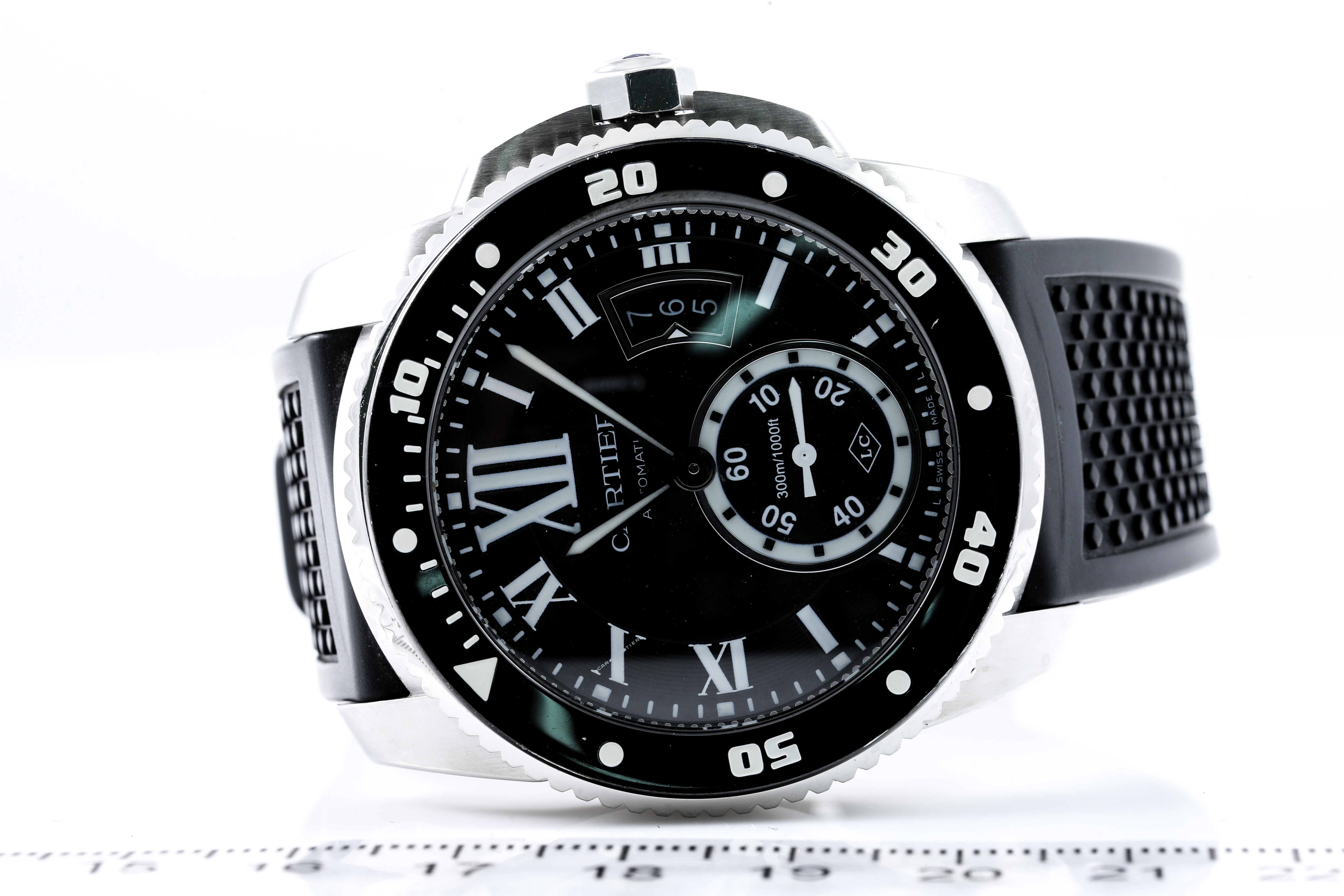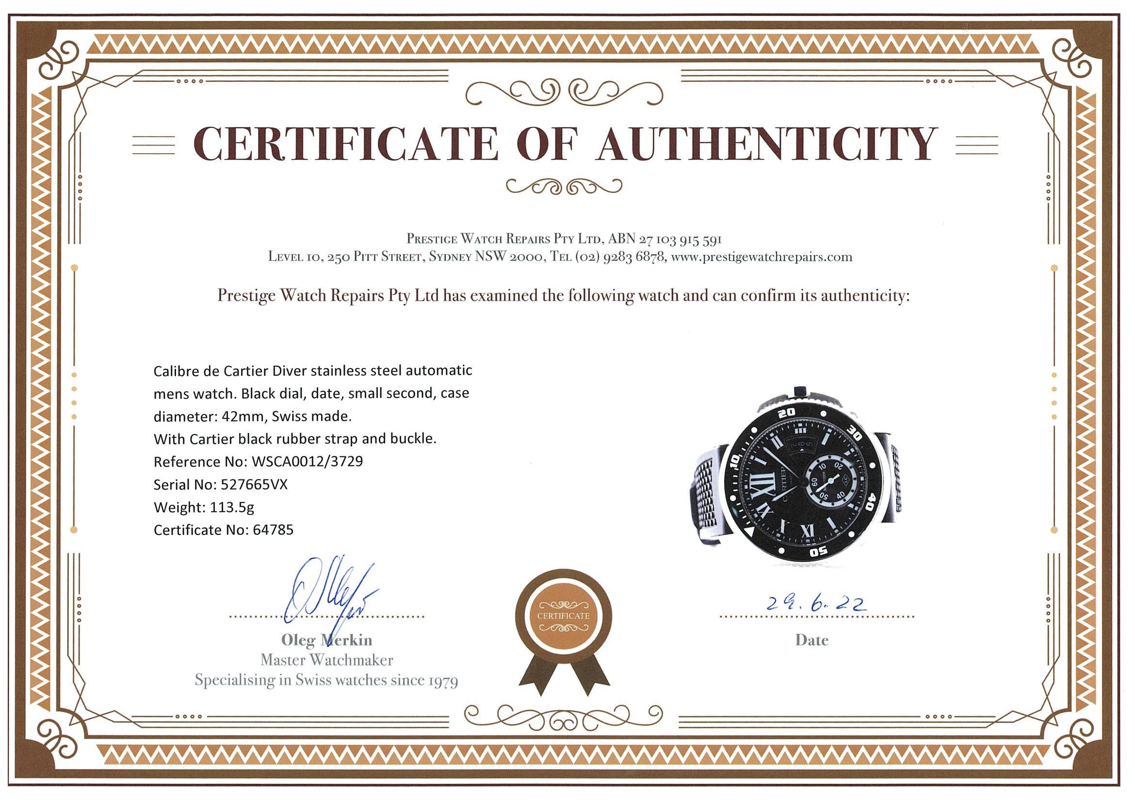 Calibre de Cartier Diver stainless steel automatic mens watch. Black dial, date, small second, case diameter: 42mm, strap length: 21.5cm, Swiss made. Ref# WSCA0012/3729. With Cartier black rubber strap and buckle. With Certificate of Authenticity and Cartier box. 3 month FSA warranty. (Pre-owned)