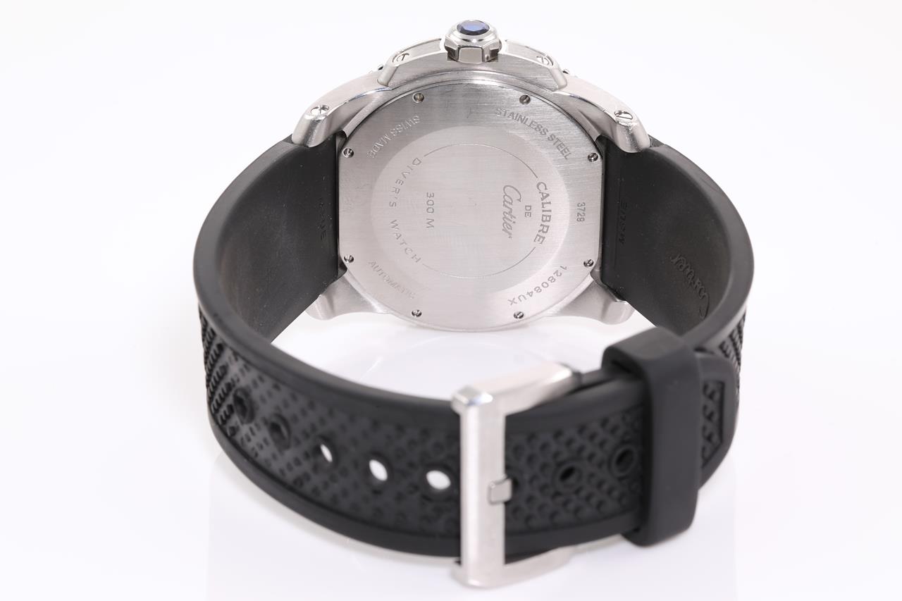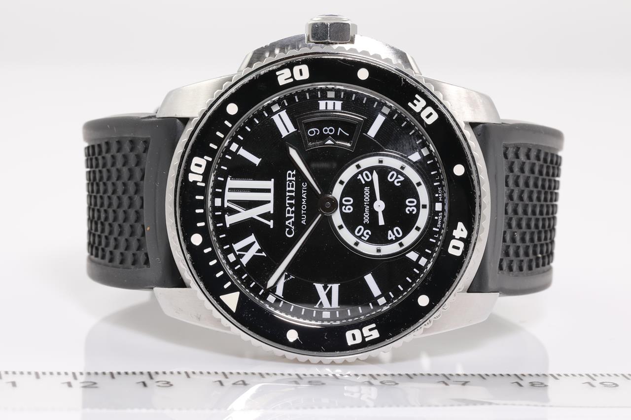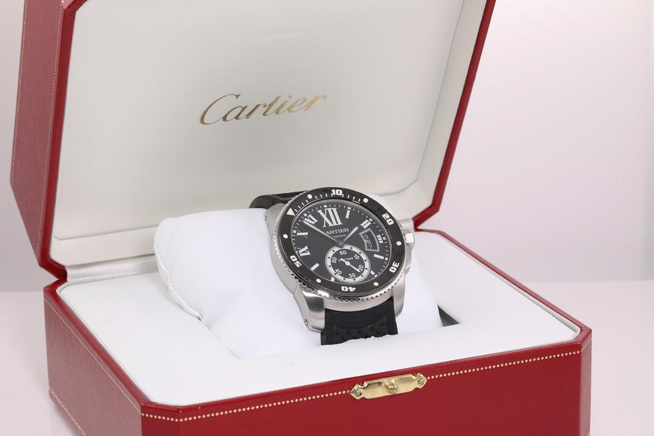 Calibre de Cartier Divers stainless steel automatic mens watch. Black dial, date, small second, case diameter: 42mm, length: 22.5cm, Swiss made. Ref #W7100056/3729. With Cartier black rubber strap & clasp. With Cartier certificate booklet and Cartier box. With Certificate of Authenticity. 6 month Prestige watchmaker warranty from the date of full service. (Pre-owned)