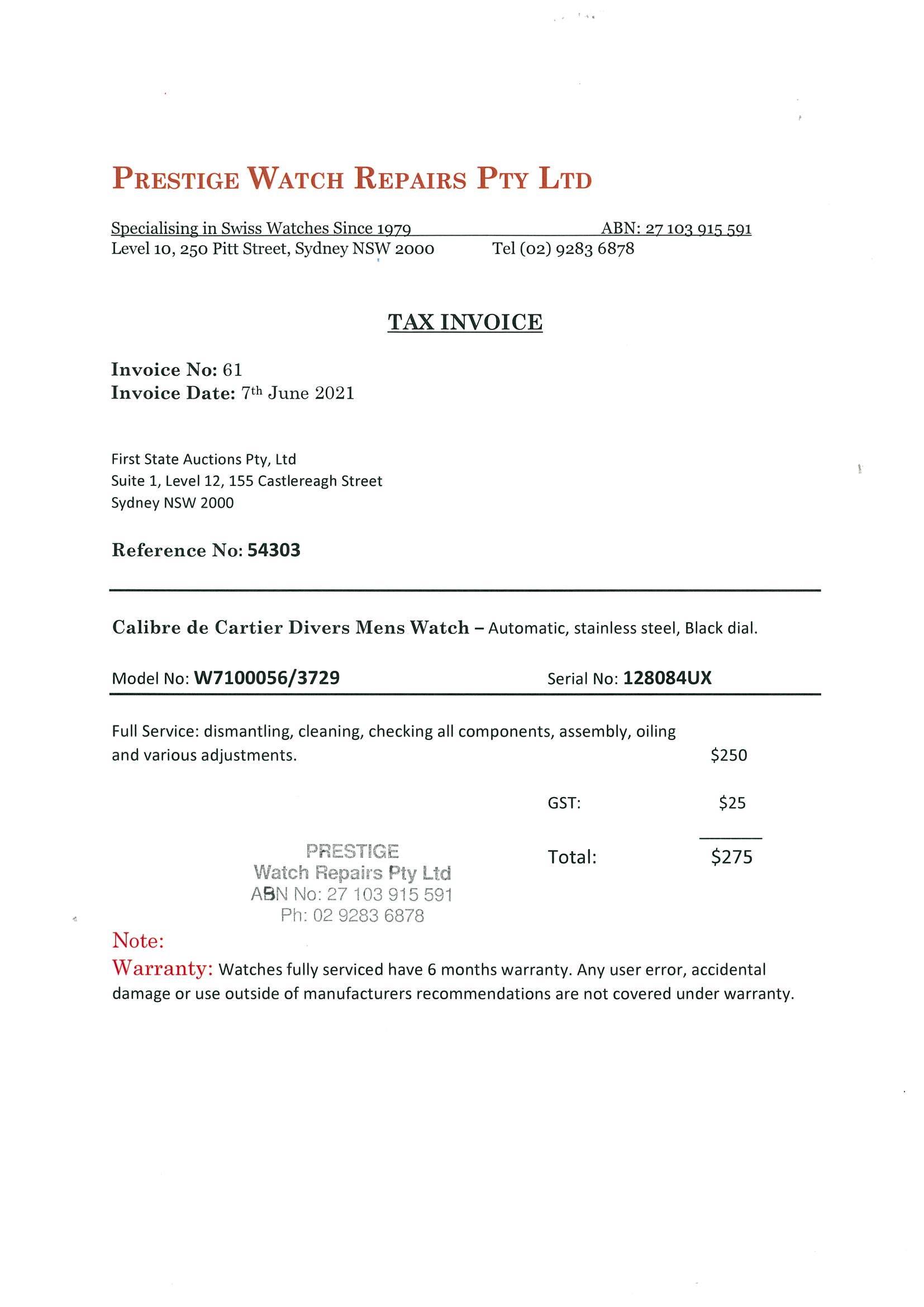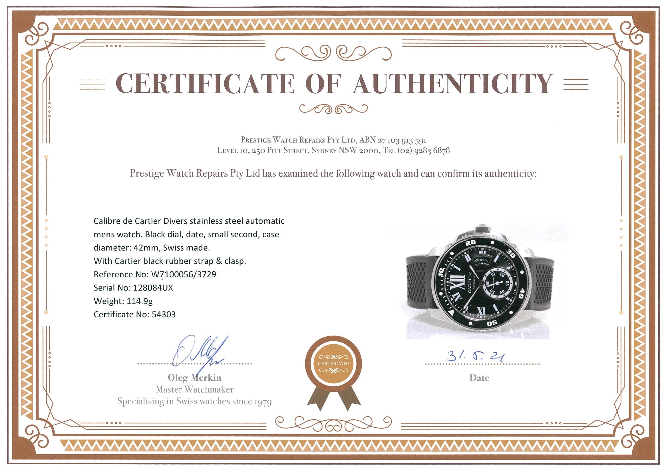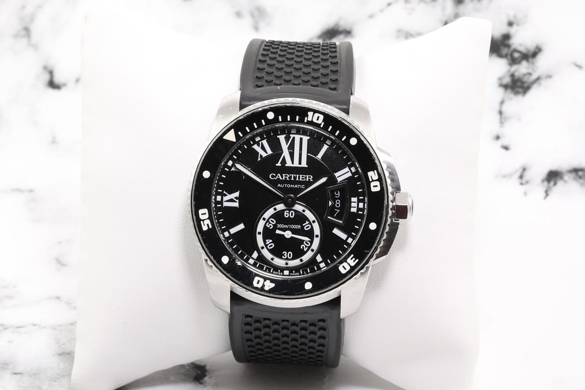 Calibre de Cartier Divers stainless steel automatic mens watch. Black dial, date, small second, case diameter: 42mm, length: 22.5cm, Swiss made. Ref #W7100056/3729. With Cartier black rubber strap & clasp. With Cartier certificate booklet and Cartier box. With Certificate of Authenticity. 6 month Prestige watchmaker warranty from the date of full service. (Pre-owned)