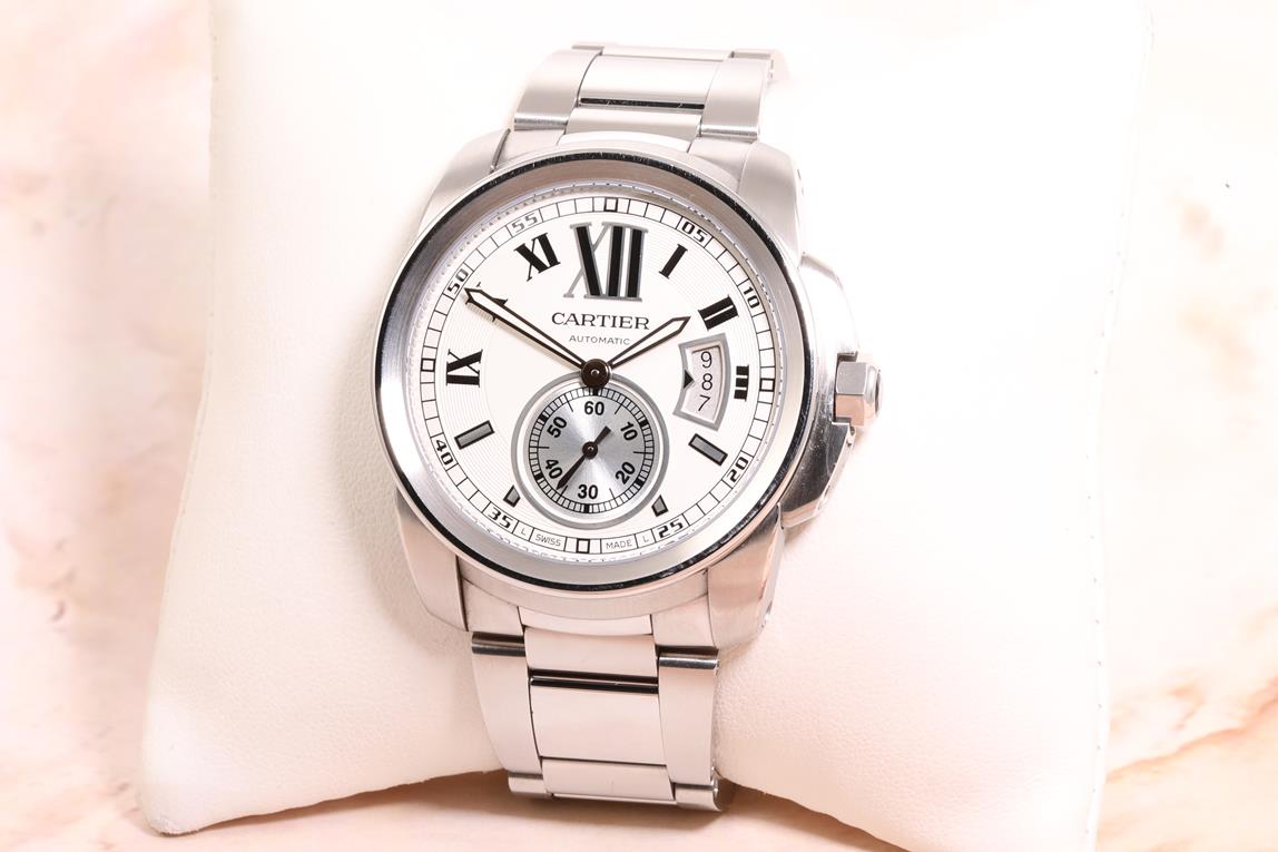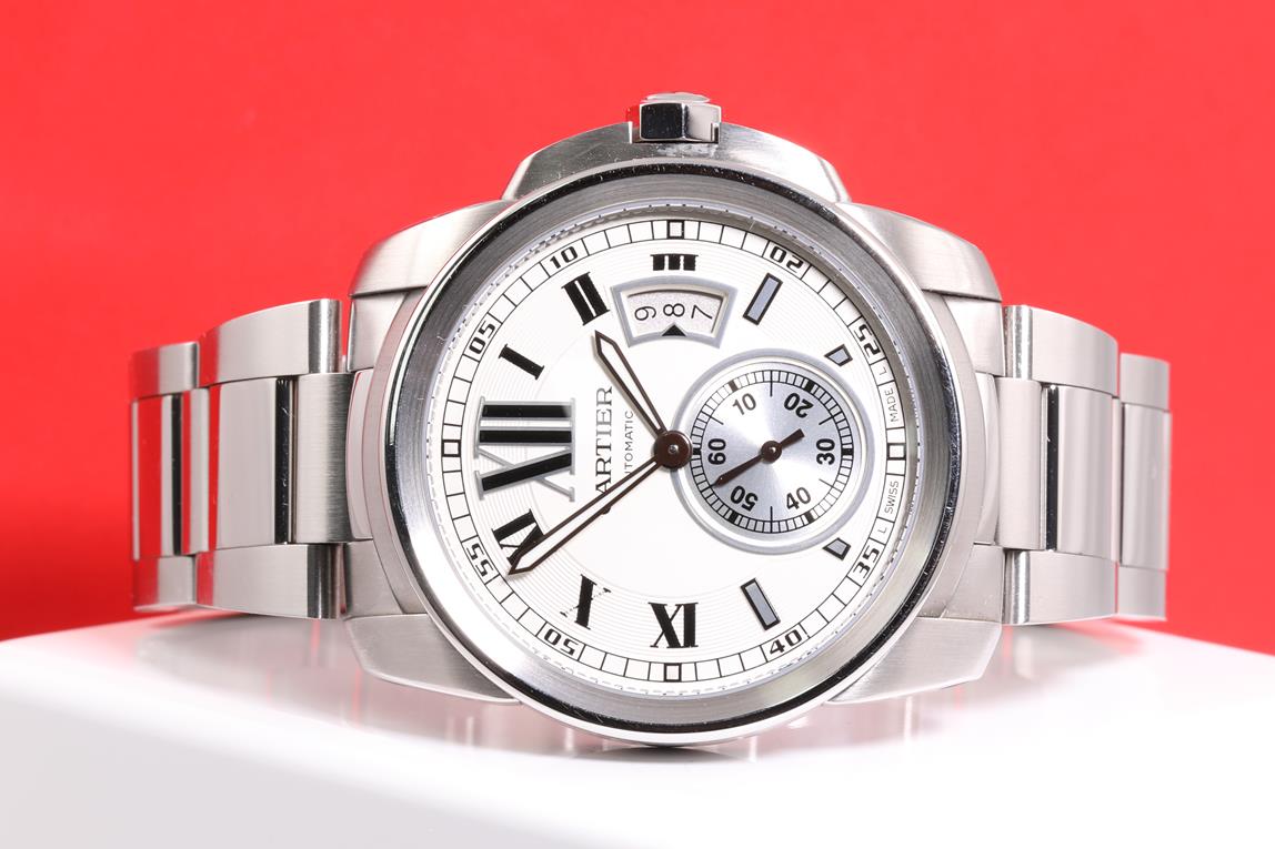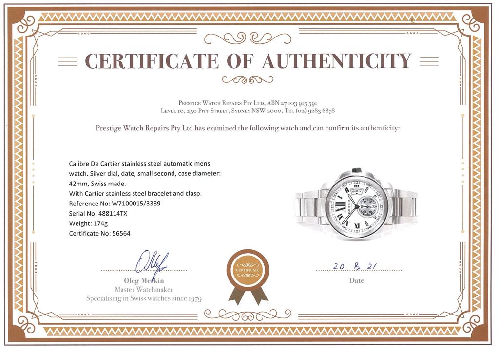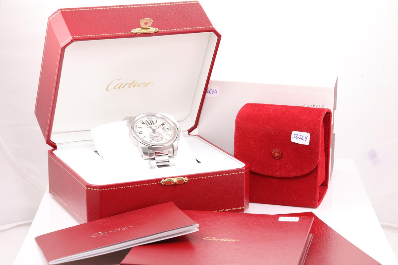 Calibre De Cartier stainless steel automatic mens watch. Silver dial, date, small second, case diameter: 42mm, wrist size: 19cm, Swiss made. Ref# W7100015/3389. With Cartier stainless steel bracelet and clasp. With certificate of authenticity, Cartier guarantee certificate booklet dated 6/12/2013, Rolex travel watch pouch, cleaning set and Cartier box. 3 month FSA warranty. (Pre-owned)