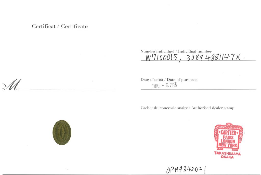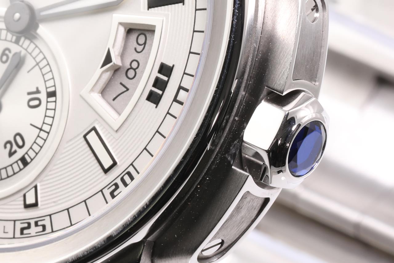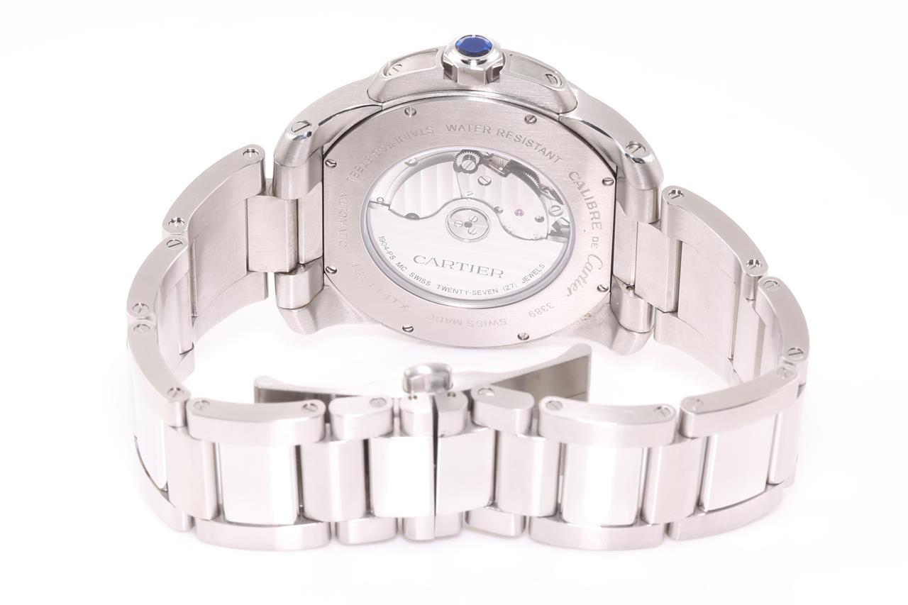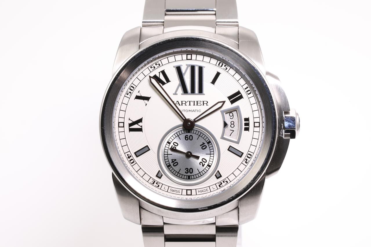 Calibre De Cartier stainless steel automatic mens watch. Silver dial, date, small second, case diameter: 42mm, wrist size: 19cm, Swiss made. Ref# W7100015/3389. With Cartier stainless steel bracelet and clasp. With certificate of authenticity, Cartier guarantee certificate booklet dated 6/12/2013, Rolex travel watch pouch, cleaning set and Cartier box. 3 month FSA warranty. (Pre-owned)