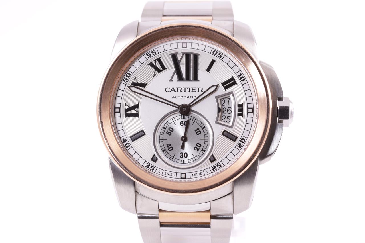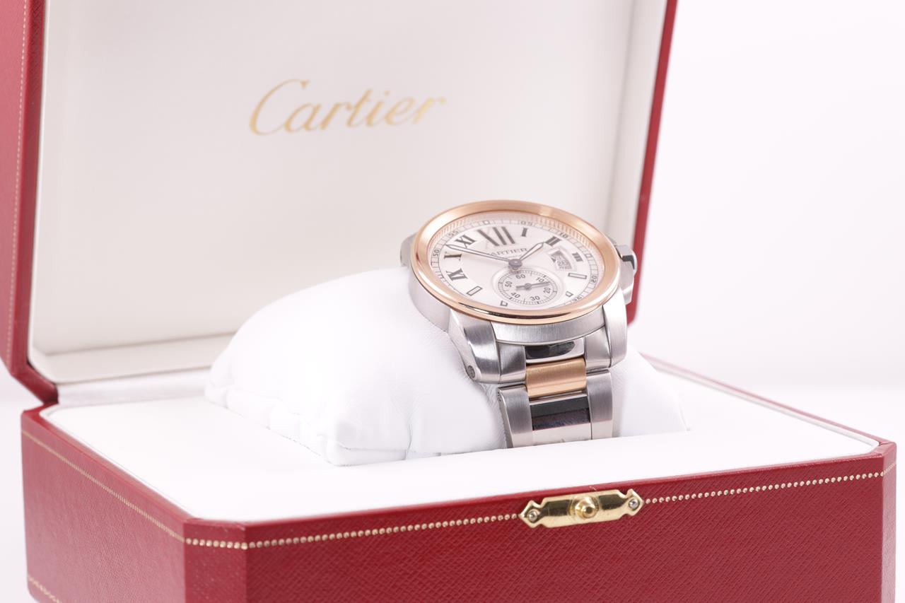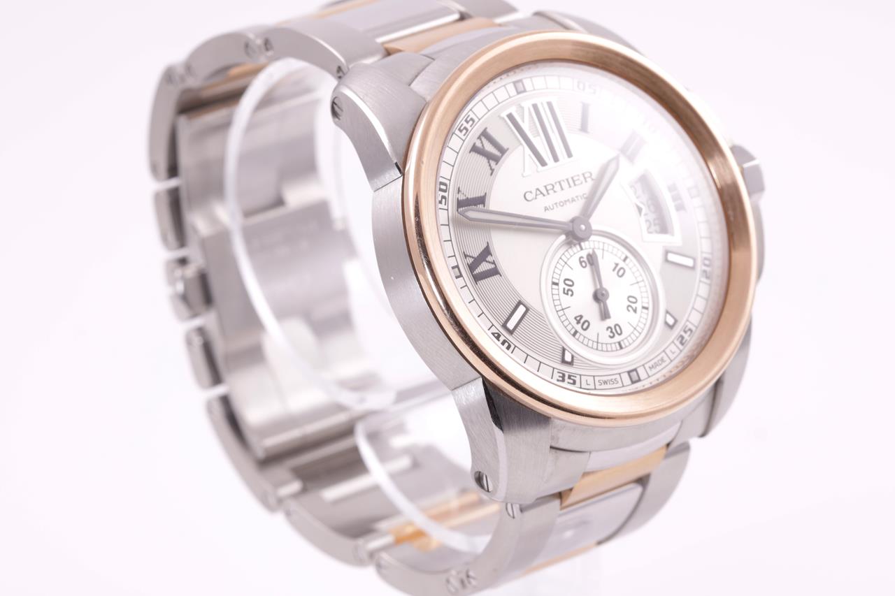 Calibre De Cartier 18ct rose gold and stainless steel automatic mens watch. Silver dial, date, small second, case diameter: 42mm, wrist size: 17cm, Swiss made. Ref# 3389. With Cartier two tone bracelet and clasp. With certificate of authenticity, Cartier guarantee certificate booklet and Cartier box. 3 month FSA warranty. (Pre-owned)