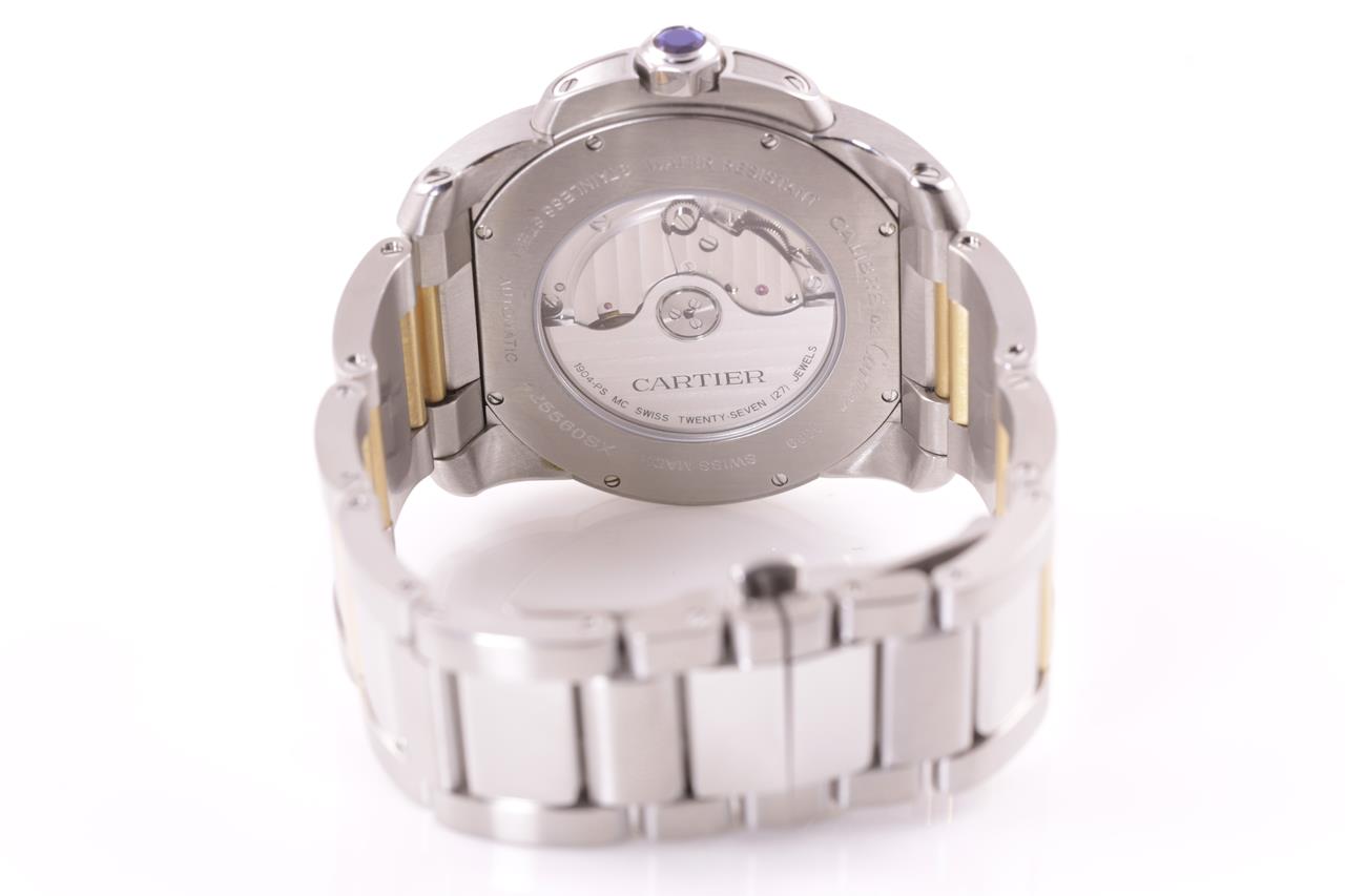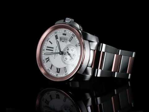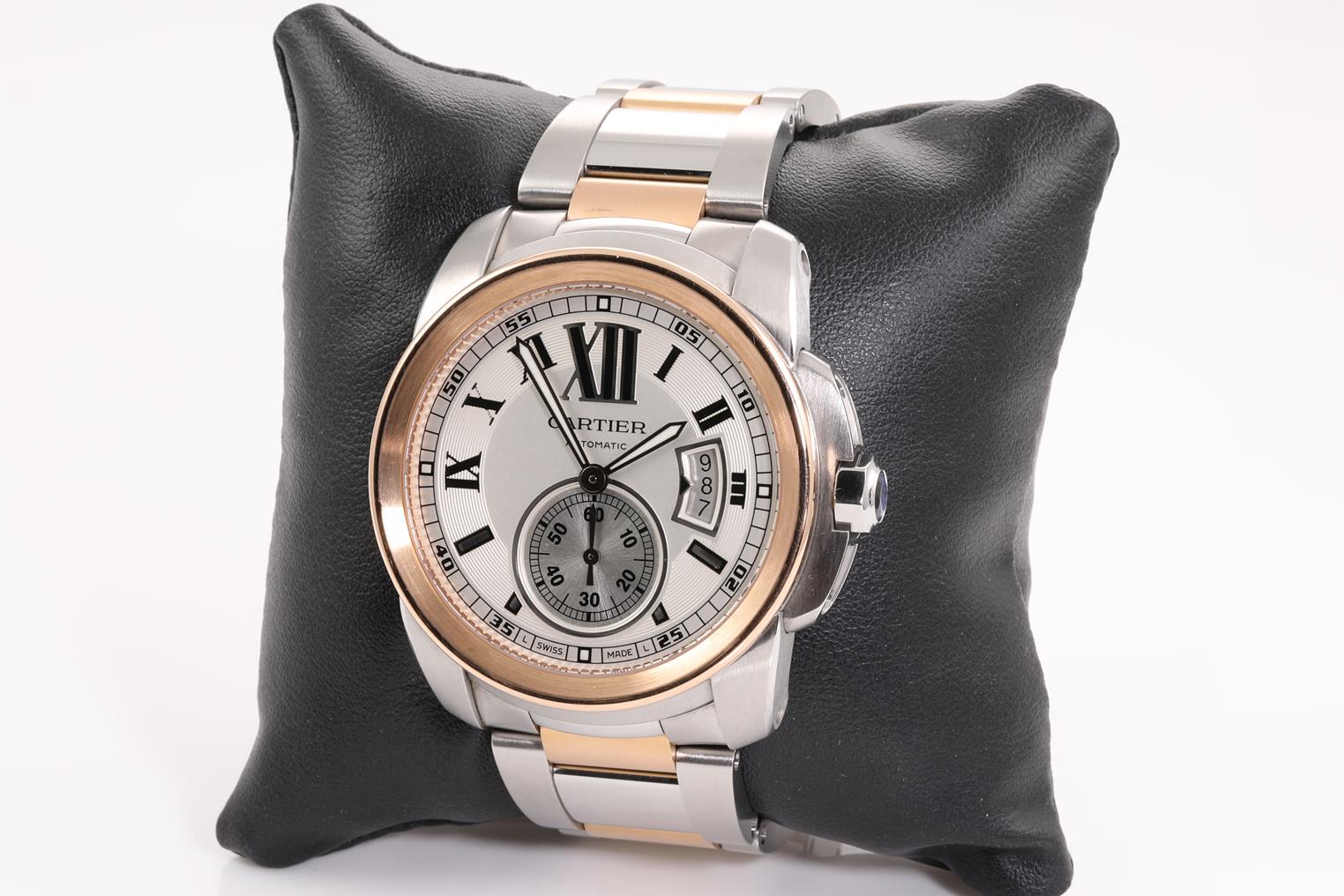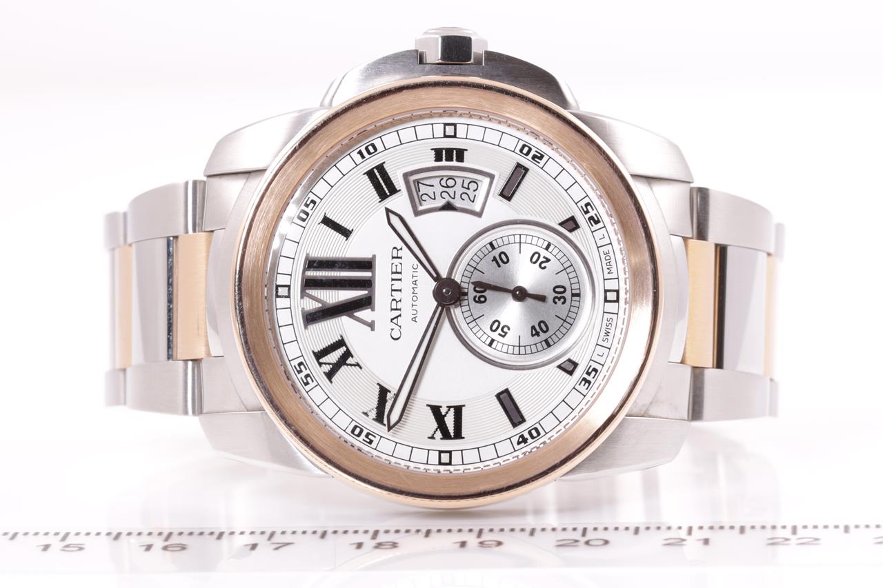 Calibre De Cartier 18ct rose gold and stainless steel automatic mens watch. Silver dial, date, small second, case diameter: 42mm, wrist size: 17cm, Swiss made. Ref# 3389. With Cartier two tone bracelet and clasp. With certificate of authenticity, Cartier guarantee certificate booklet and Cartier box. 3 month FSA warranty. (Pre-owned)