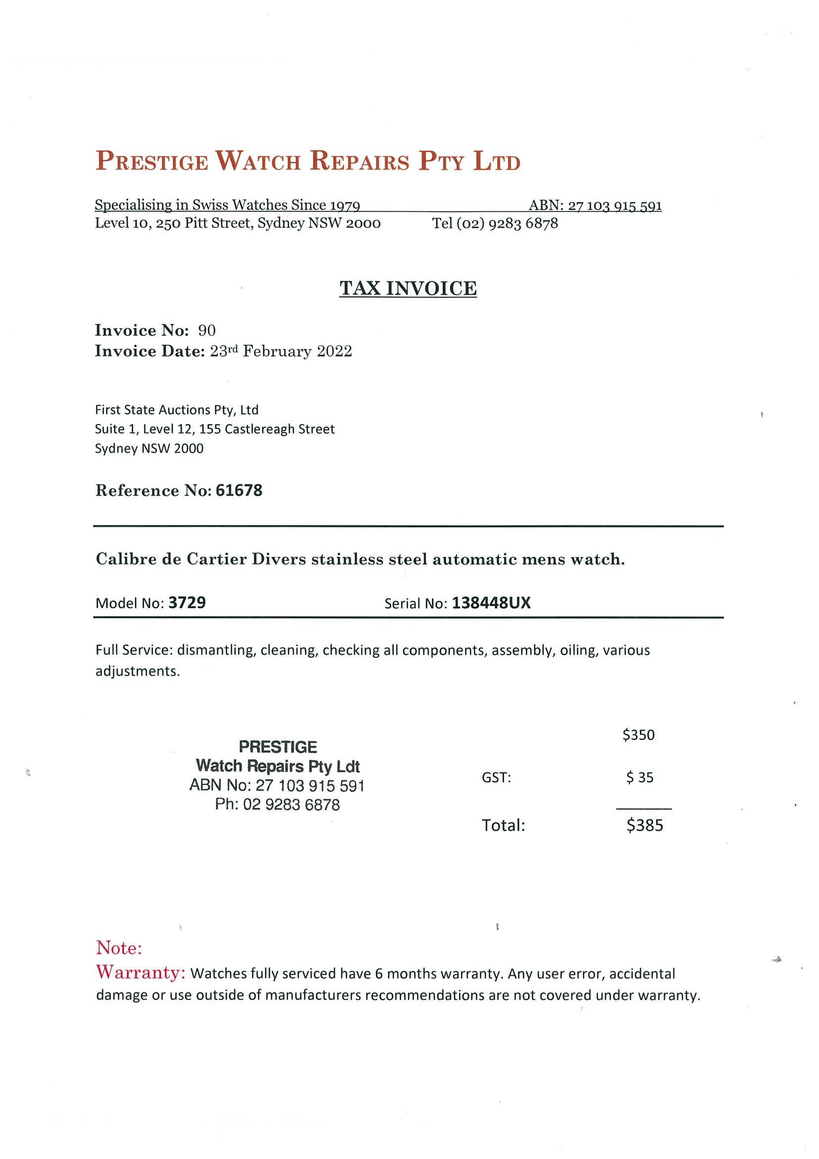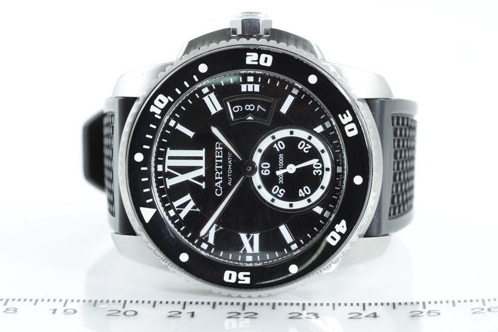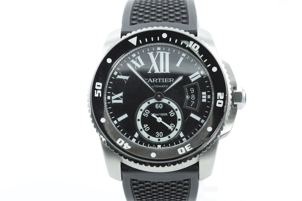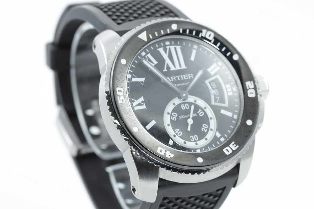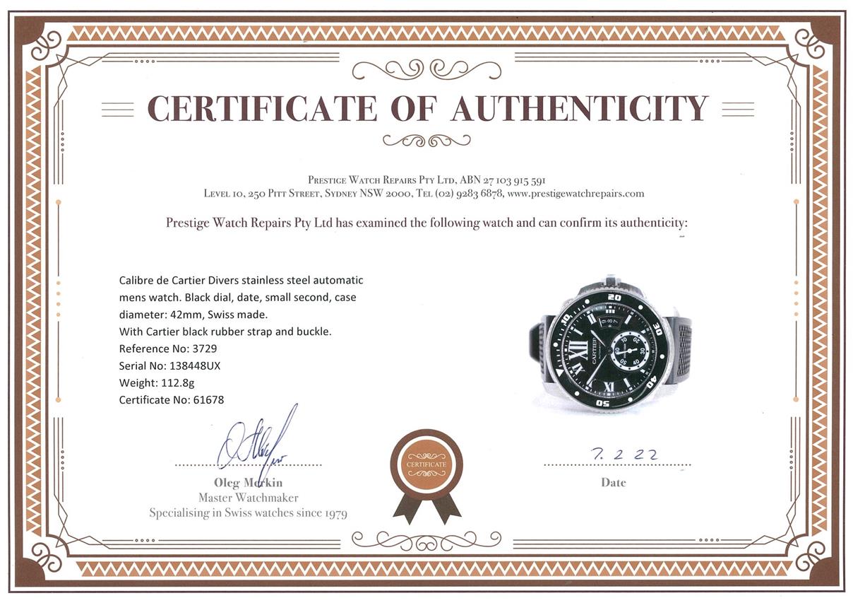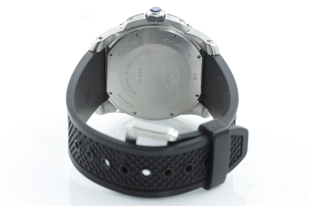 Calibre de Cartier Divers stainless steel automatic mens watch. Black dial, date, small second, case diameter: 42mm, length: 22cm, Swiss made. Ref #3729. With Cartier black rubber strap & buckle. With Cartier Certificate Booklet, Certificate of Authenticity and Cartier box. 6 month Prestige Watchmaker warranty from the date of full service. (Pre-owned)