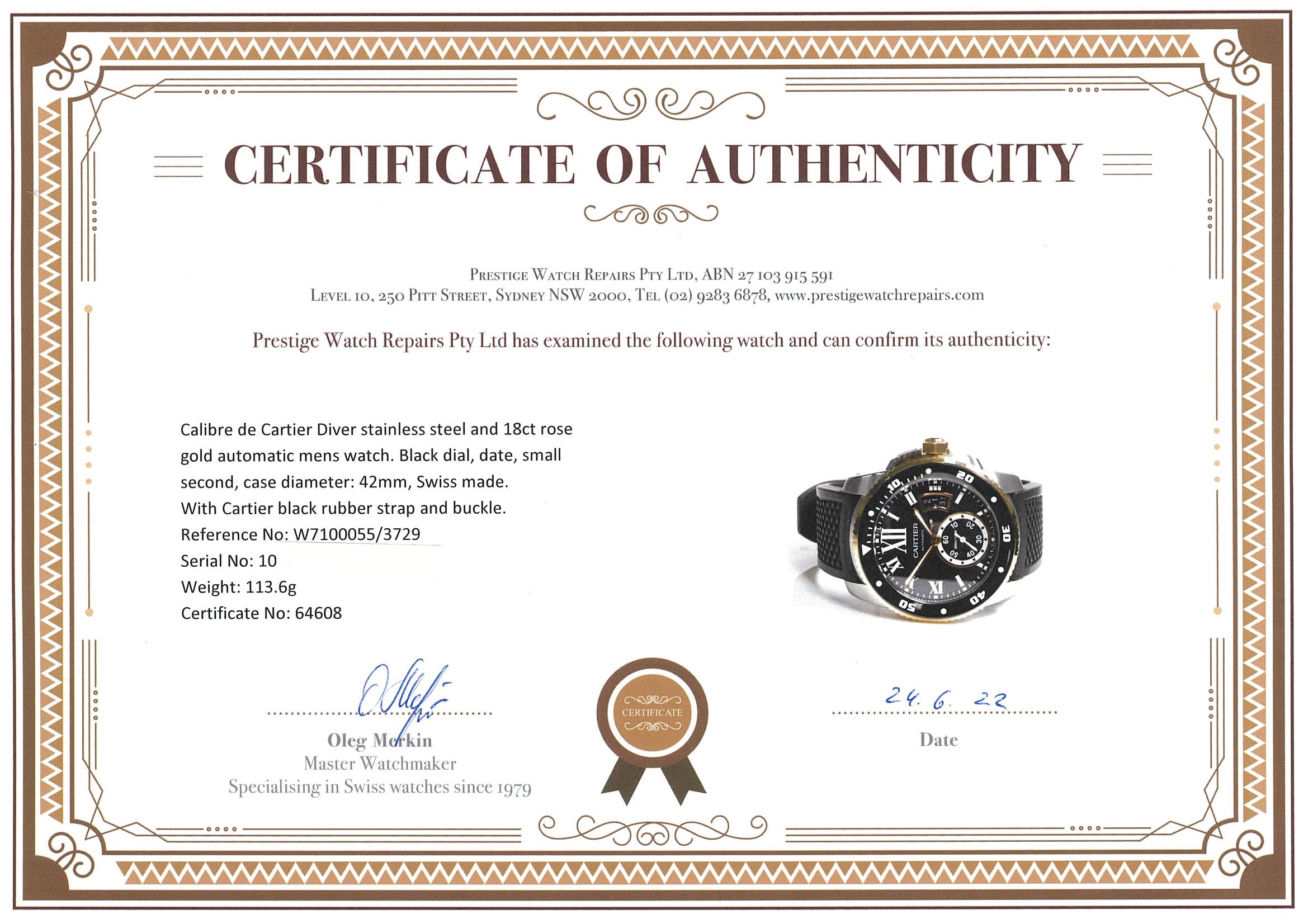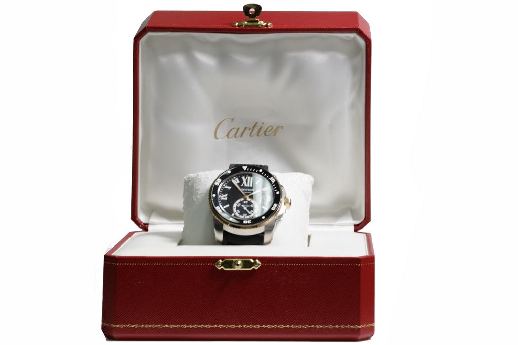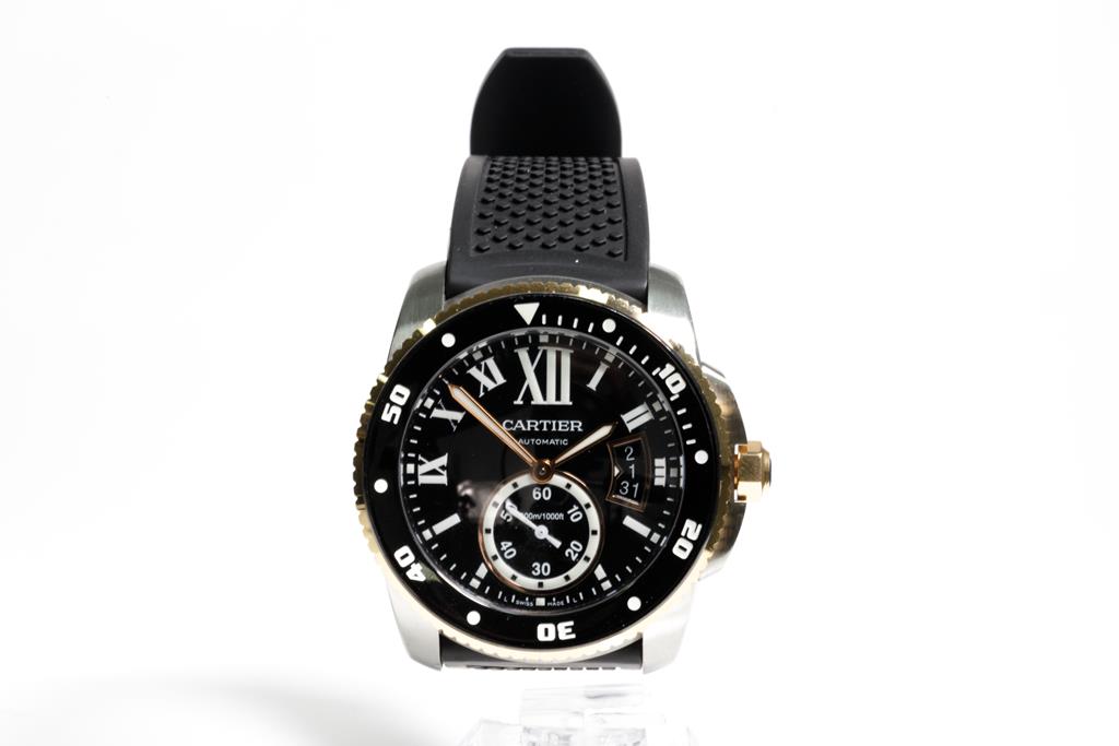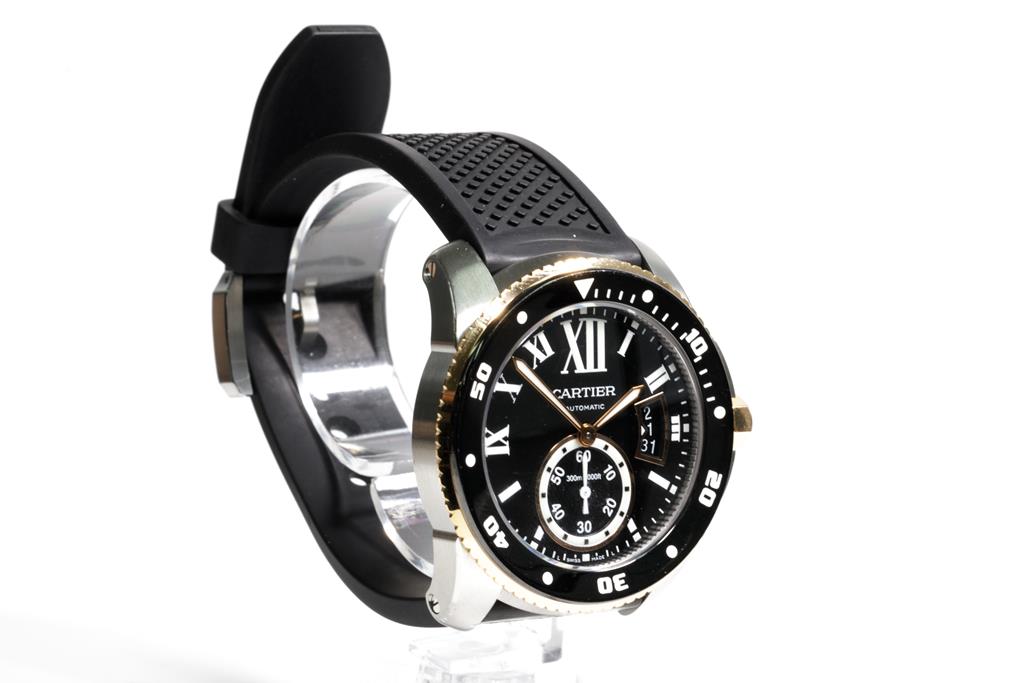 Calibre de Cartier Diver stainless steel and 18ct rose gold automatic mens watch. Black dial, date, small second, case diameter: 42mm, strap length: 22cm, Swiss made. Ref# W7100055/3729. With Cartier black rubber strap and buckle. With Certificate of Authenticity and Cartier box. 3 month FSA warranty. (Pre-owned)
