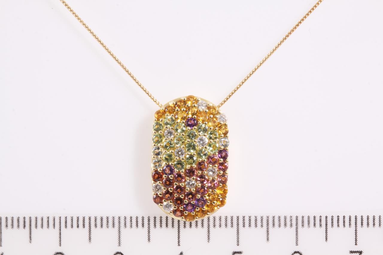 Mixed gemstone and Diamond pendant with Citrine, Garnet, Peridot, Tourmaline, Amethyst, and Diamonds totalling 0.28cts. 18ct yellow gold with 42cm 18ct gold chain. Weight: 6.8g (As New)