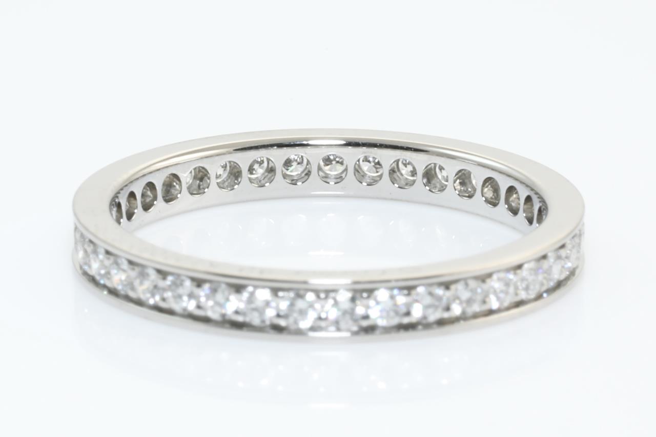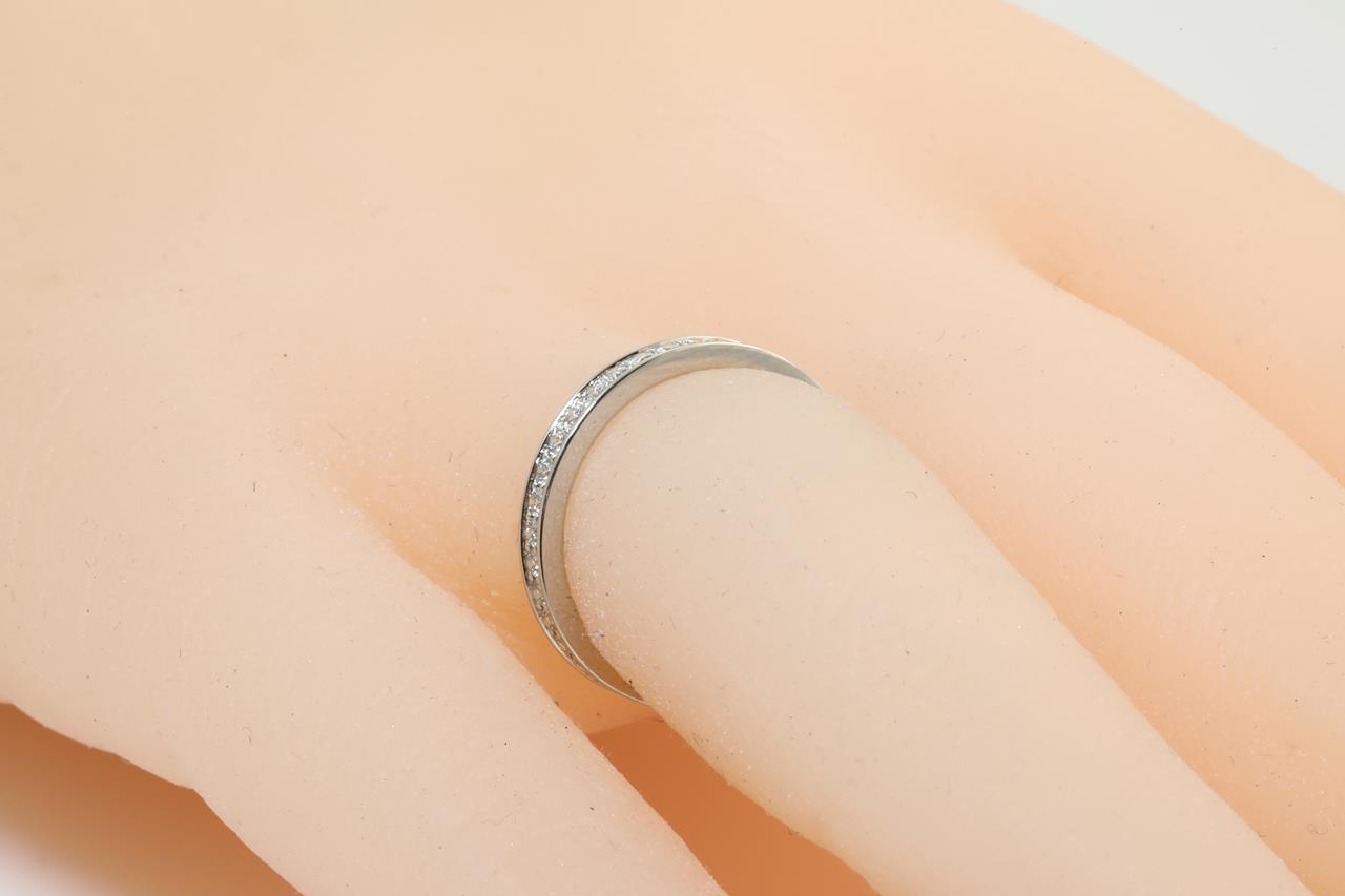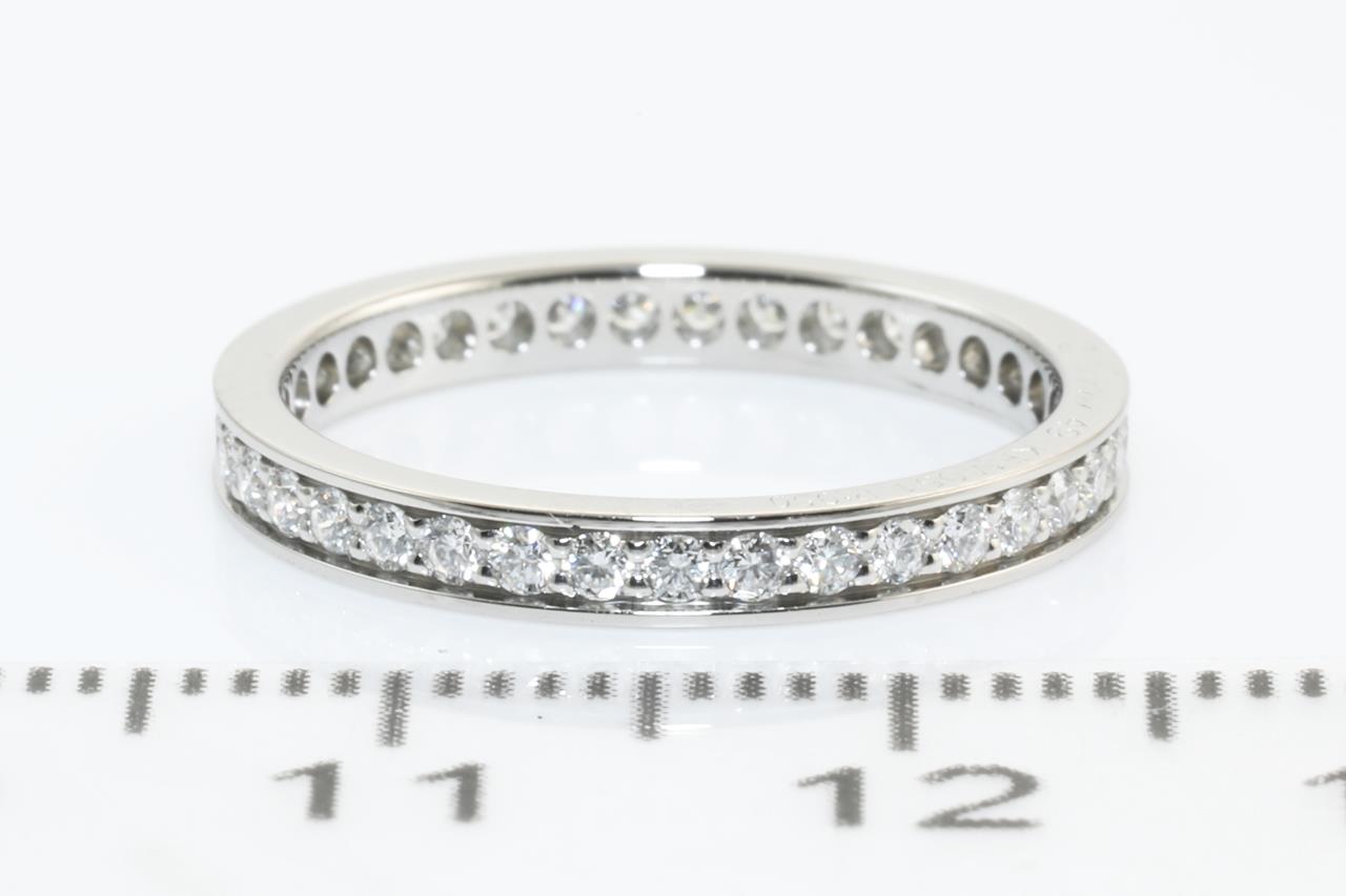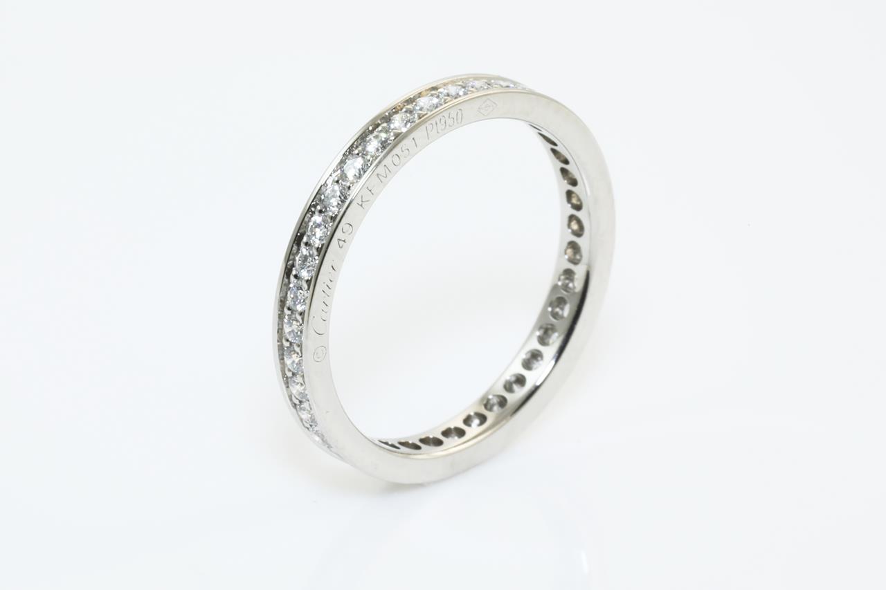 Cartier Ballerina full hoop eternity Diamond ring with round Diamonds totalling 0.38cts (Estimated grading: G VS). Platinum. Cartier stamped size: 49, Ref# KFM051. Ring size J - Ring resizing is not recommended. With Cartier certificate dated 20 Jan 2021 and Cartier box. Weight: 2.4g (Pre-owned)