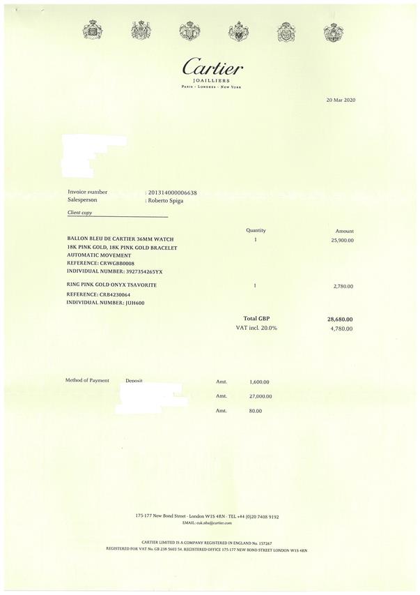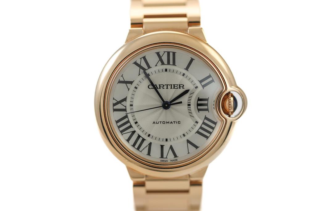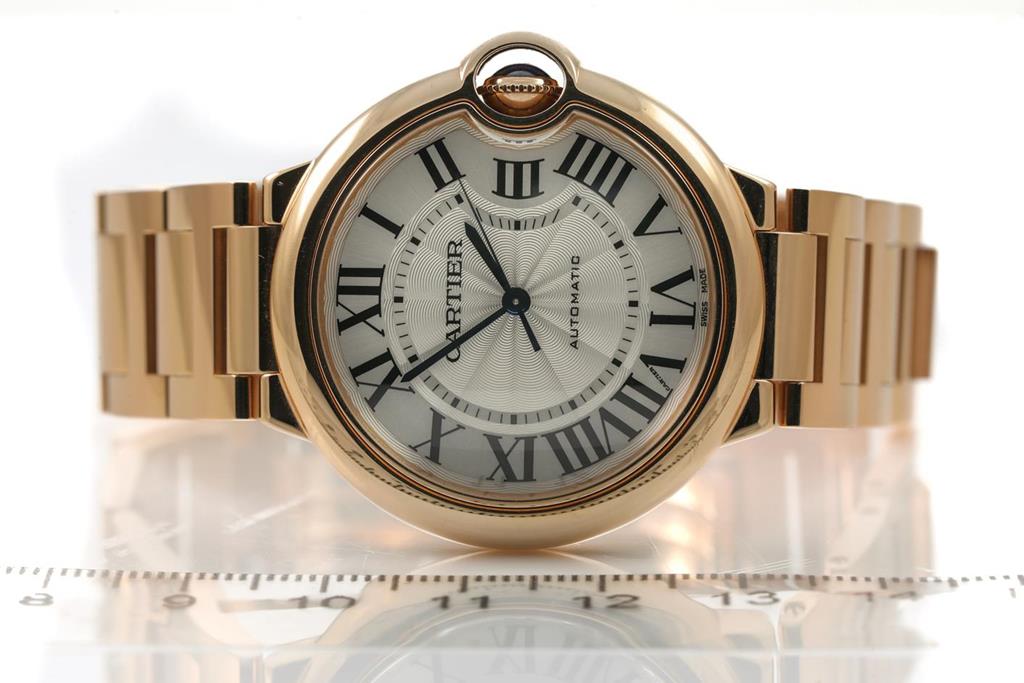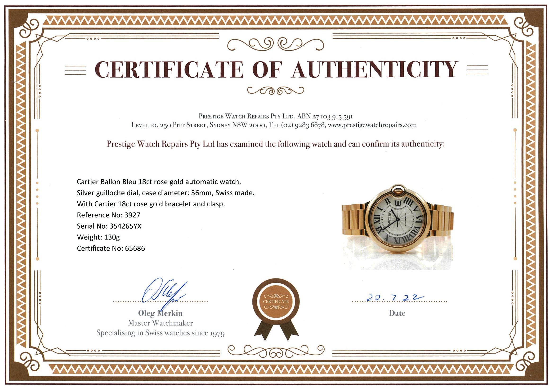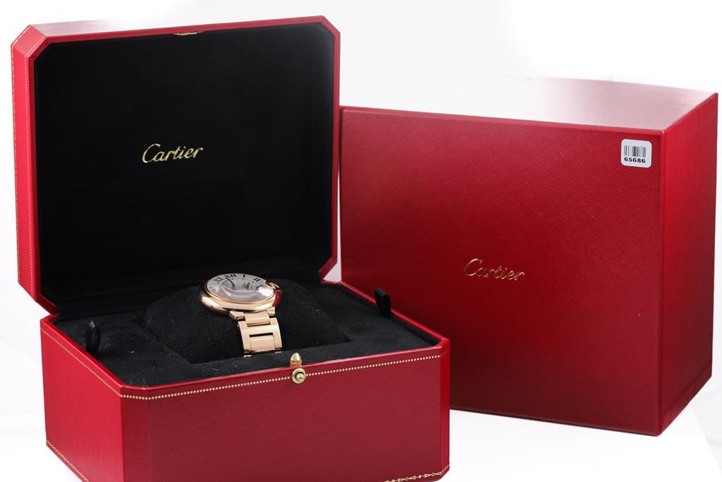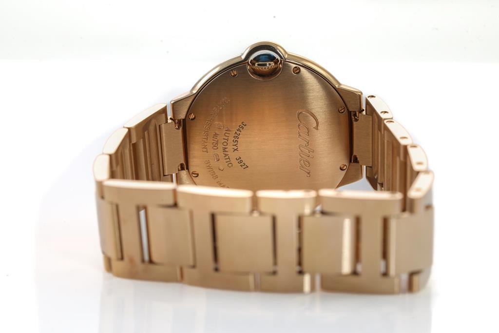 Cartier Ballon Bleu 18ct rose gold automatic watch. Silver guilloche dial, case diameter: 36mm, wrist size: 17.5cm, Swiss made. Ref# 3927. With Cartier 18ct rose gold bracelet and clasp. With Certificate of Authenticity, Cartier Invoice dated 20/03/2020, Cartier International Limited Warranty Card dated 20/03/2020 and Cartier box. 3 month FSA warranty. (Pre-owned)
