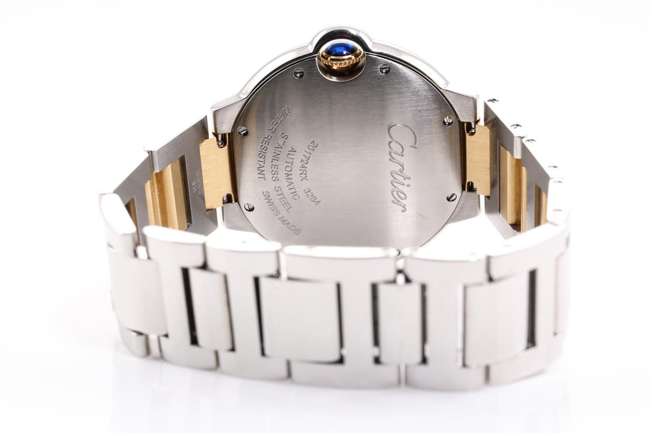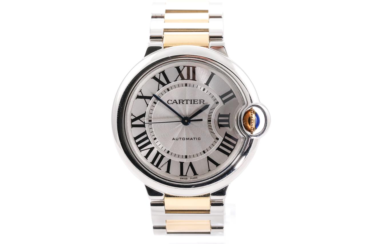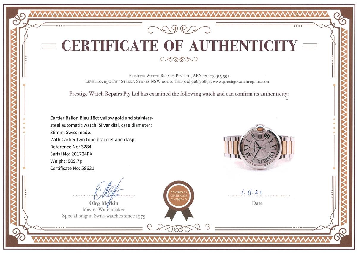Cartier Ballon Bleu 18ct yellow gold and stainless steel automatic watch. Silver dial, case diameter: 36mm, wrist size: 17cm, Swiss made. Ref# 3284. With Cartier two tone bracelet and clasp. With certificate of authenticity and Cartier box. 3 month FSA warranty. (Pre-owned)