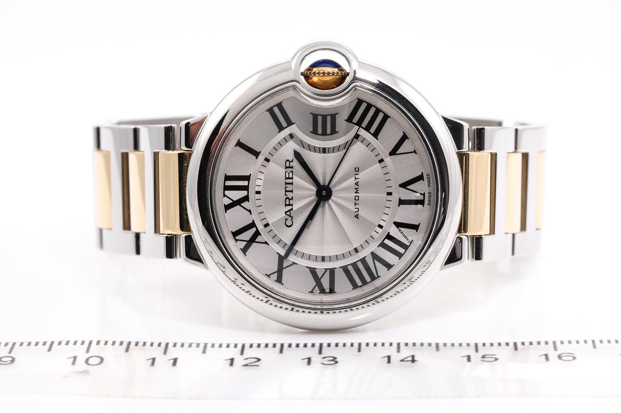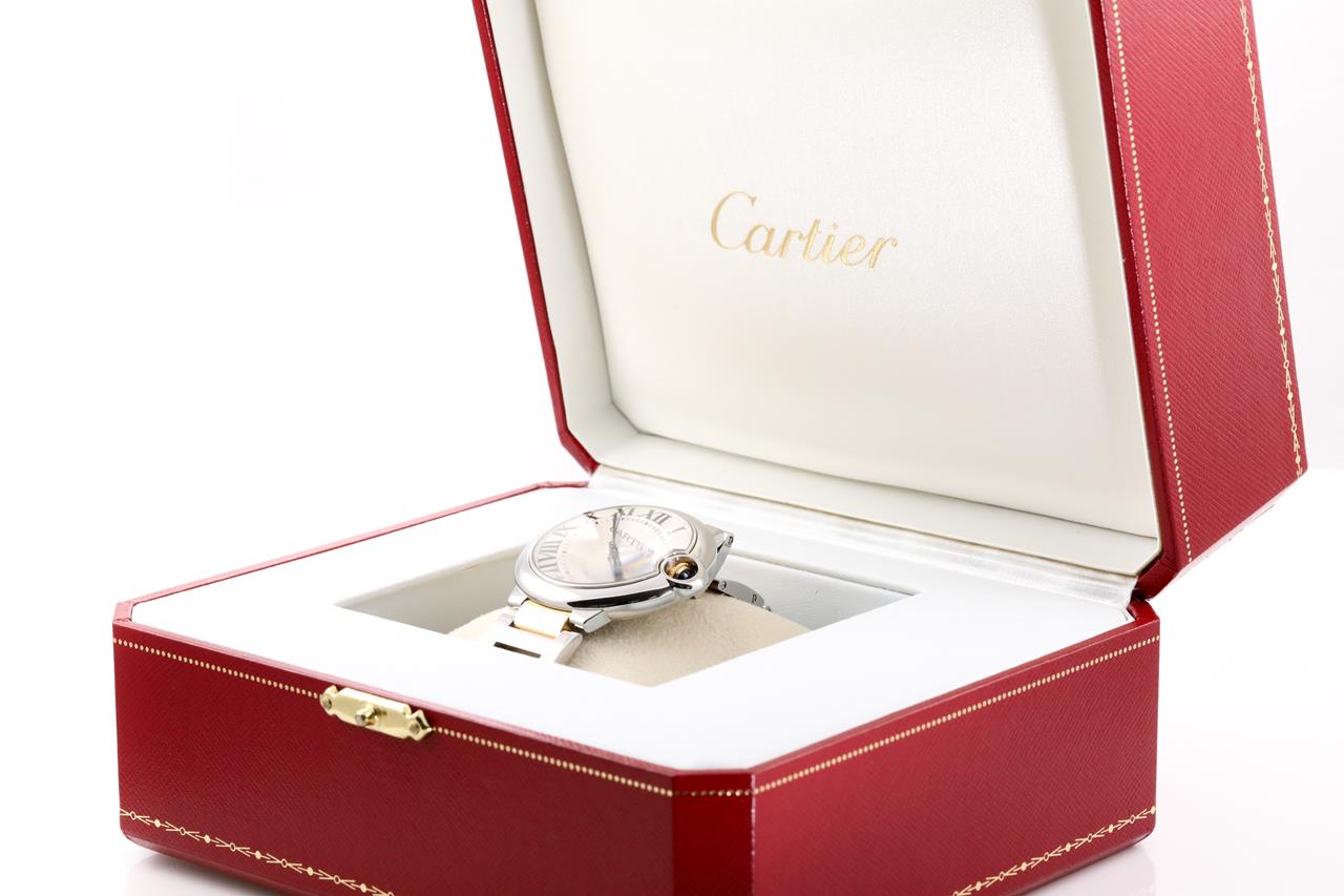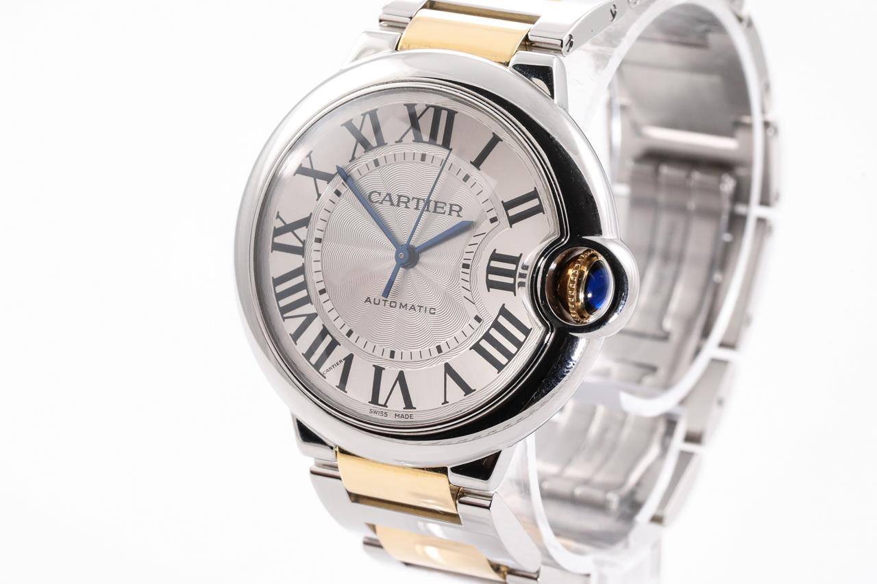Cartier Ballon Bleu 18ct yellow gold and stainless steel automatic watch. Silver dial, case diameter: 36mm, wrist size: 17cm, Swiss made. Ref# 3284. With Cartier two tone bracelet and clasp. With certificate of authenticity and Cartier box. 3 month FSA warranty. (Pre-owned)